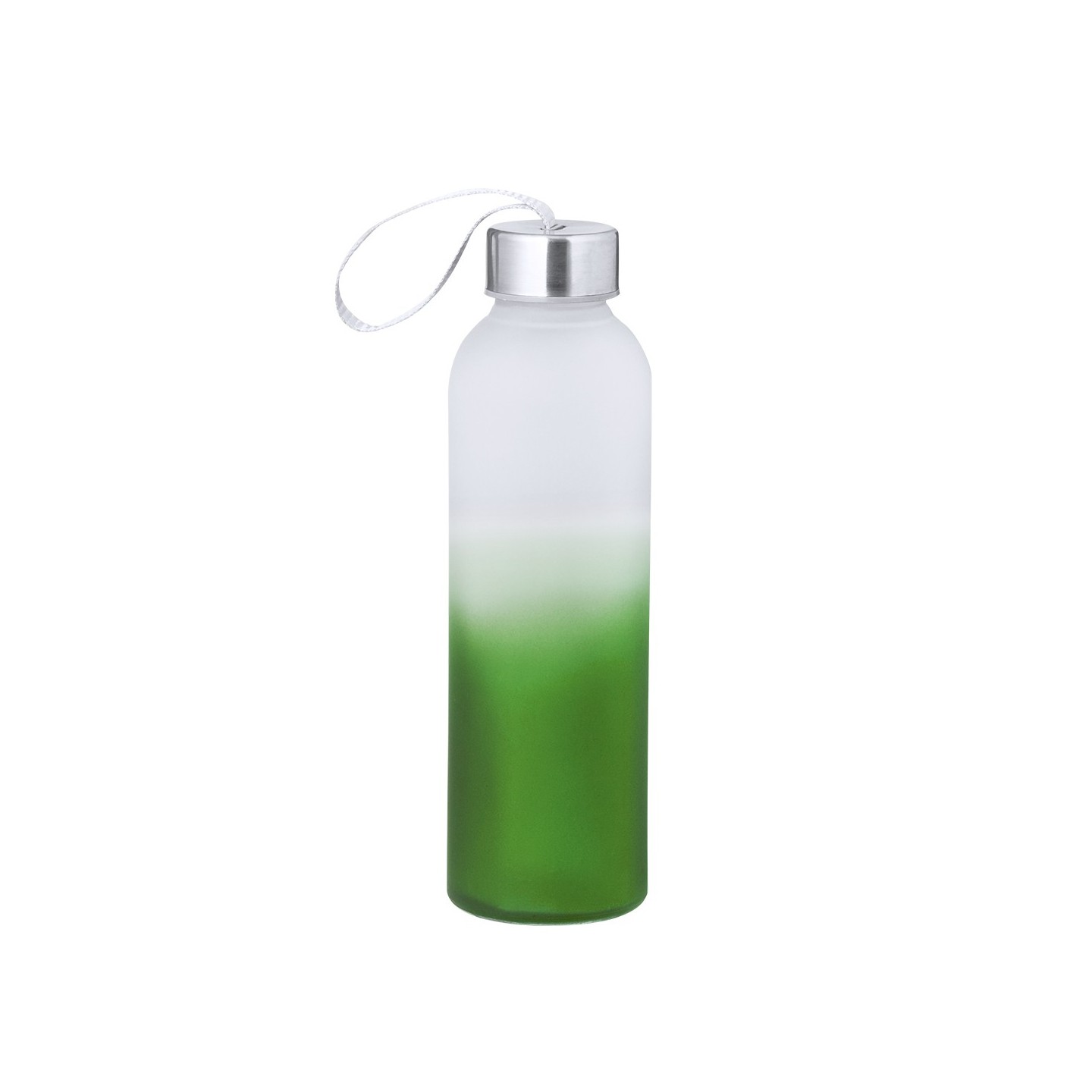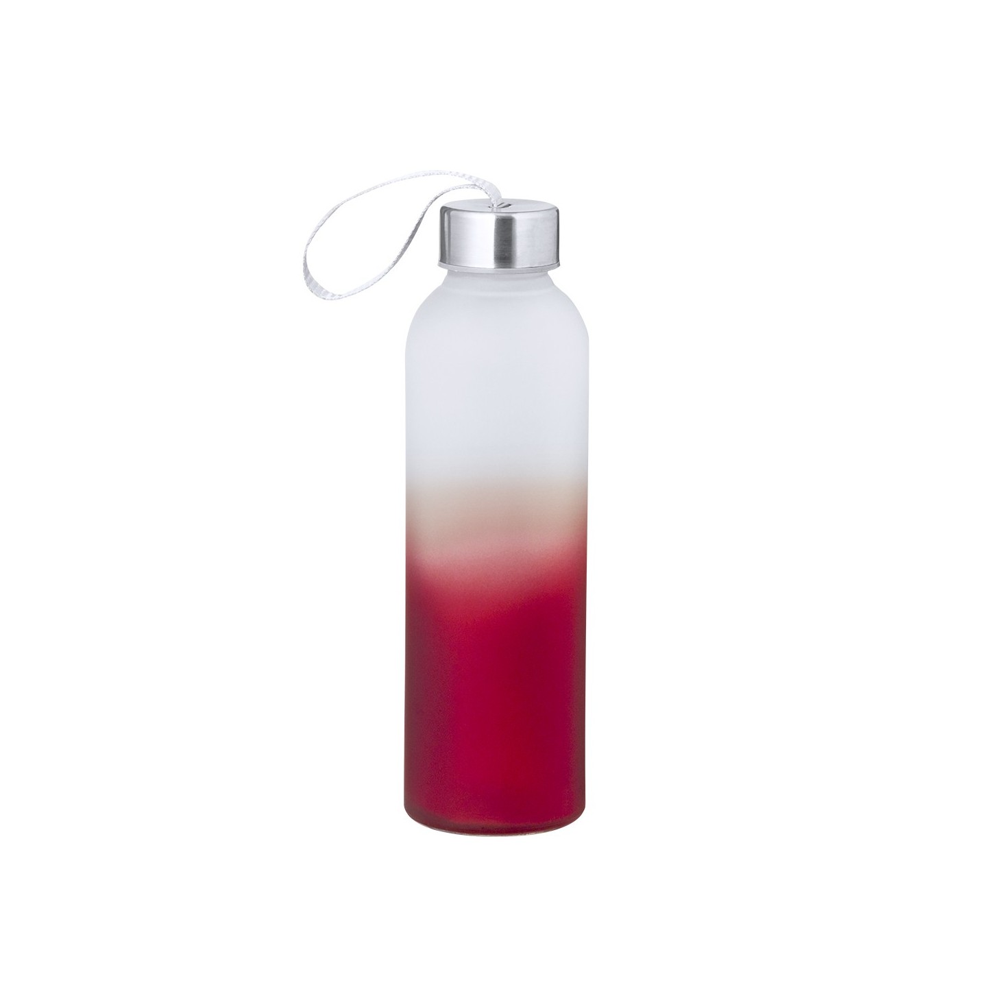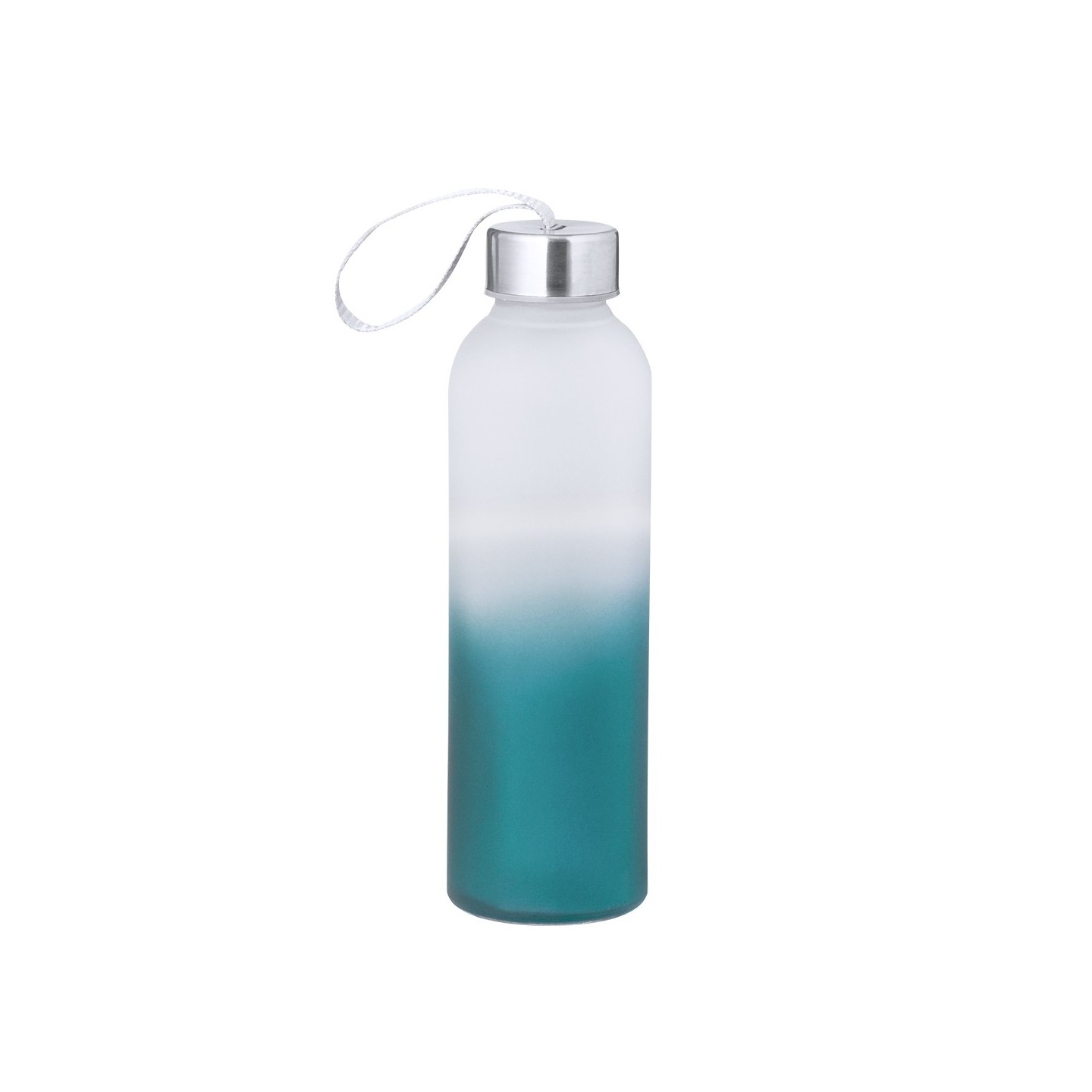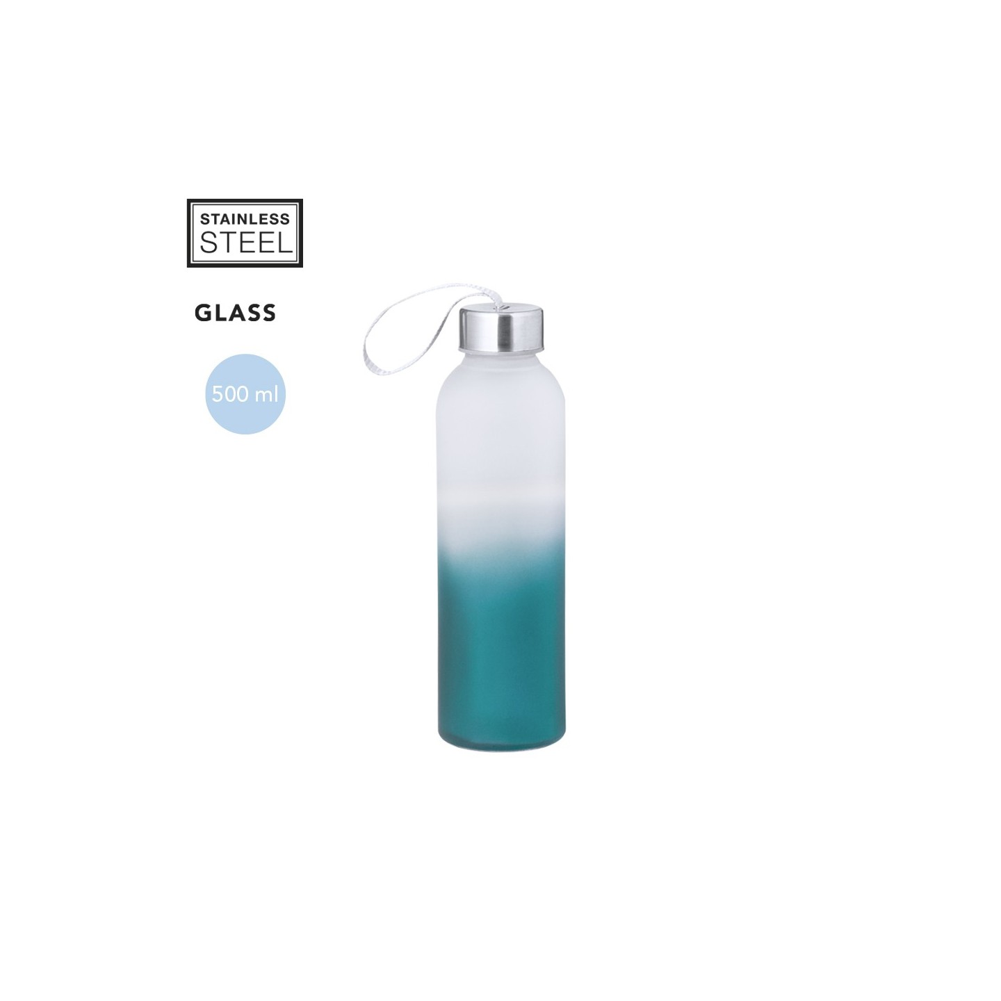 Bidón de cristal y acero inox con 500 ml de capacidad. Original diseño degradado de color blanco translúcido a diversos colores mate. Tapón de rosca con sellado perfecto con correa para su fácil transporte. Presentado individualmente en caja de diseño kraft.