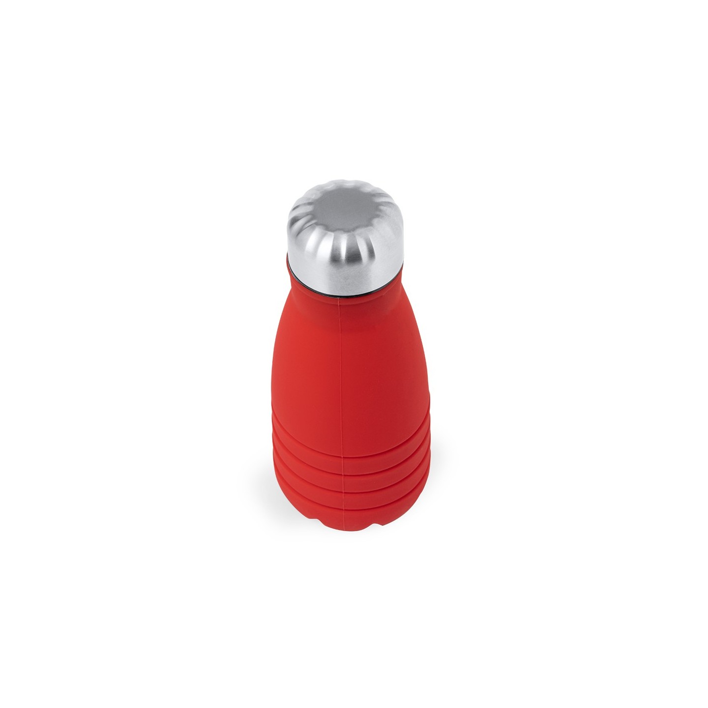 Su tapón de acero inoxidable asegura un cierre hermético, evitando derrames y manteniendo la frescura de tus bebidas. Su cuerpo flexible, de acabado mate, permite plegarlo cómodamente, optimizando su almacenamiento cuando no está en uso.