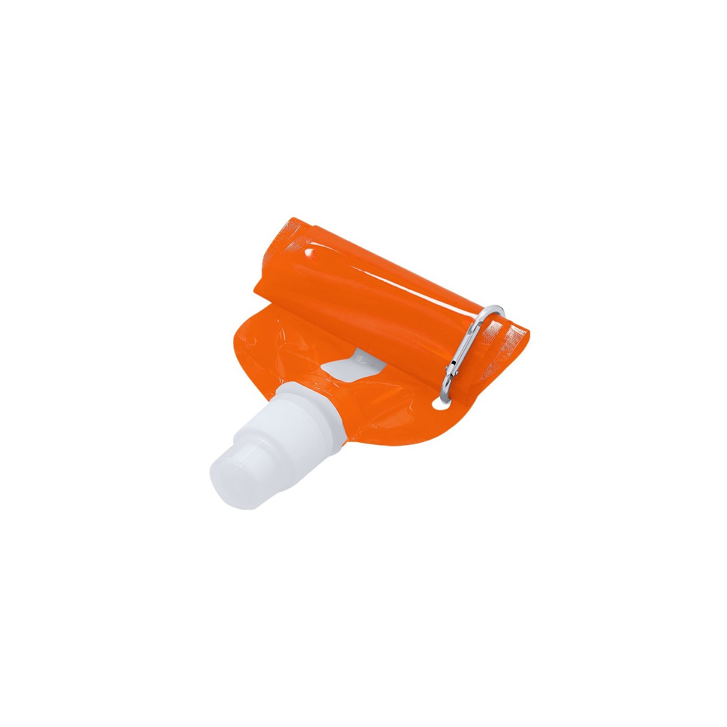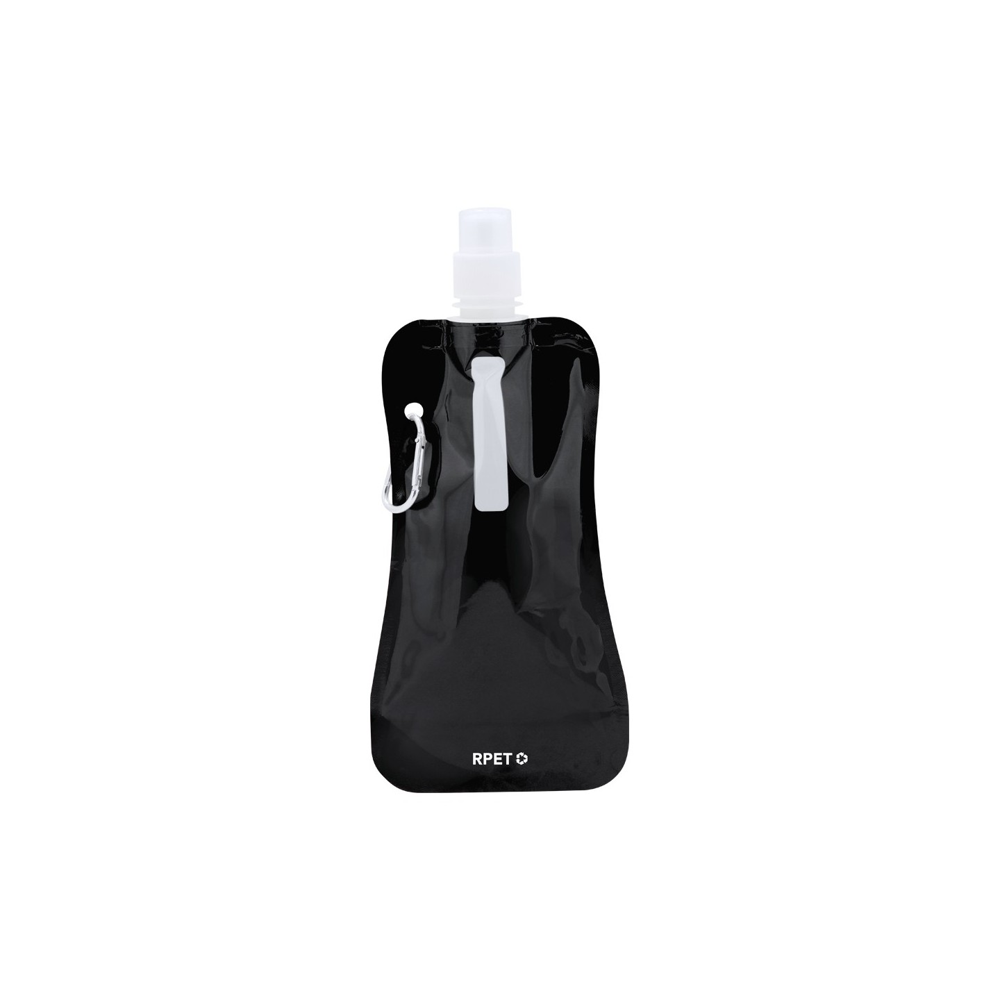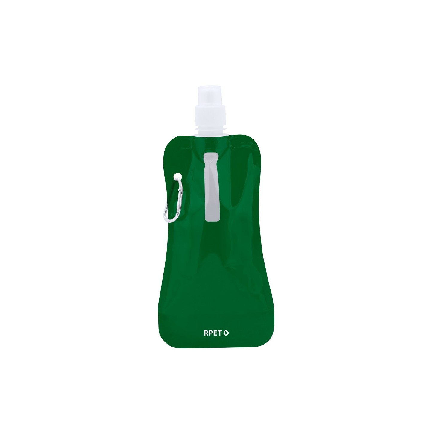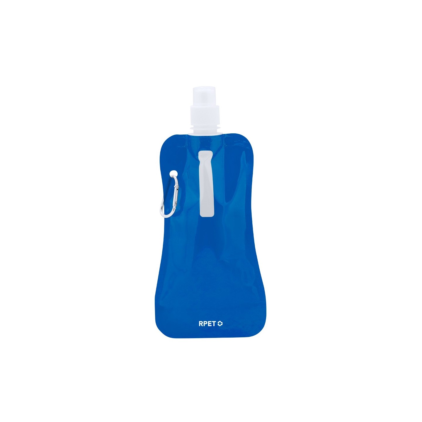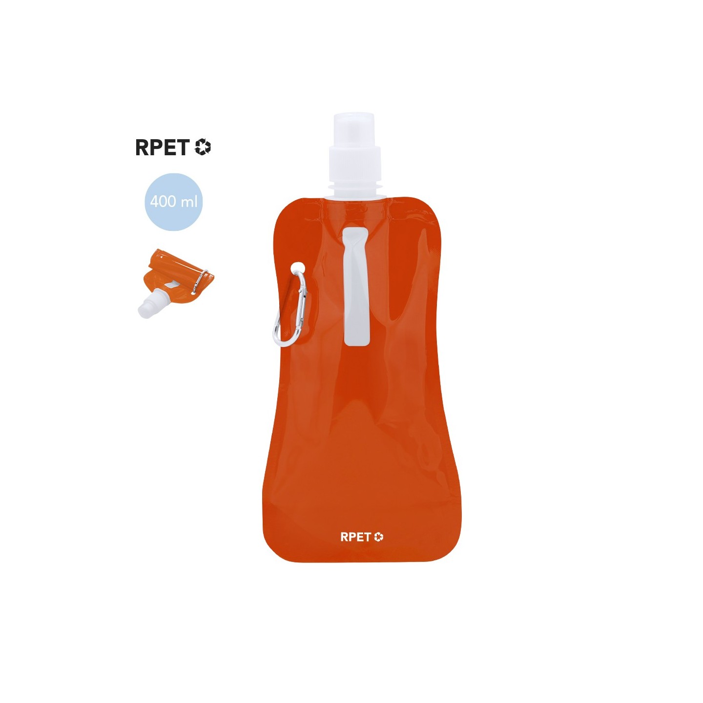 Bidón plegable RISIX de 400ml, fabricado en RPET reciclado. Incluye tapón de seguridad y mosquetón para fácil transporte. Personalizable con logotipo.