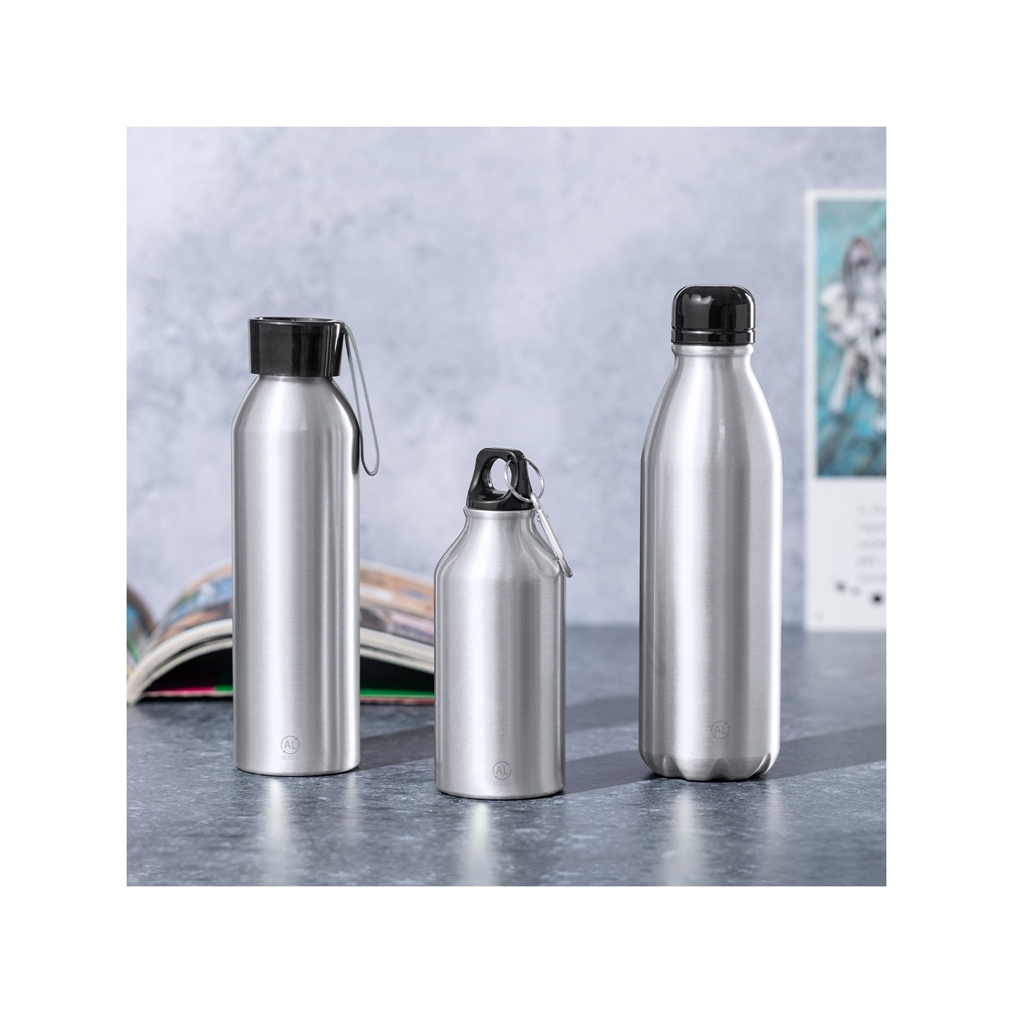 - Botellas: Disponibles en materiales como plástico (PET), acero inoxidable, vidrio y aluminio. Cada material ofrece ventajas específicas, desde la ligereza del plástico hasta la durabilidad del acero inoxidable.