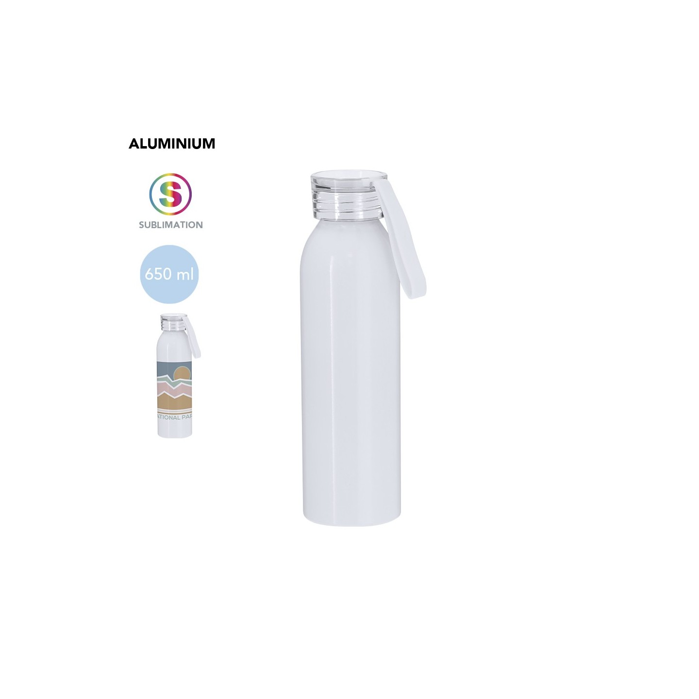 Bidón personalizable de 650 ml en aluminio resistente, con tapón a rosca y correa. Perfecto para sublimación, libre de BPA. Ideal para empresas.