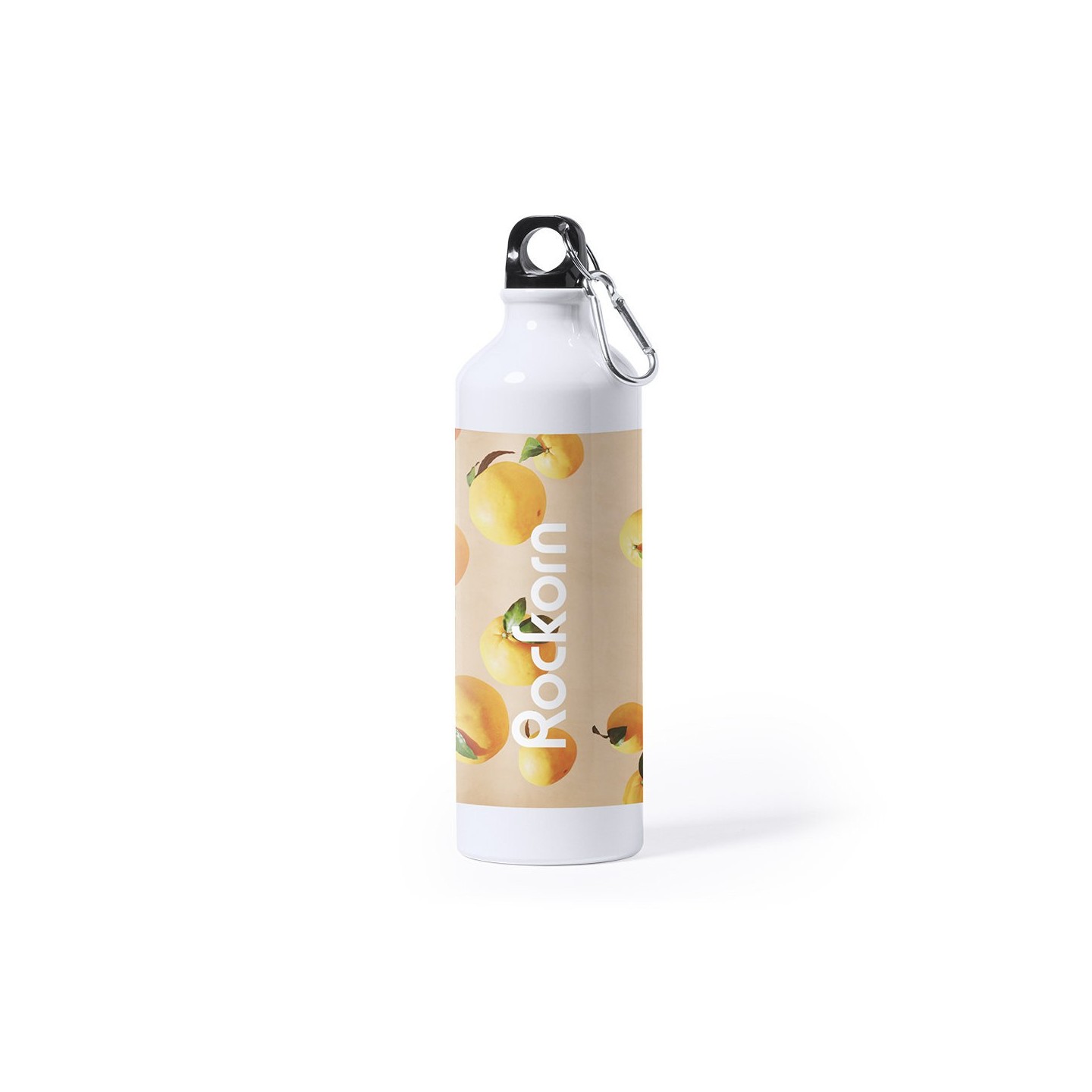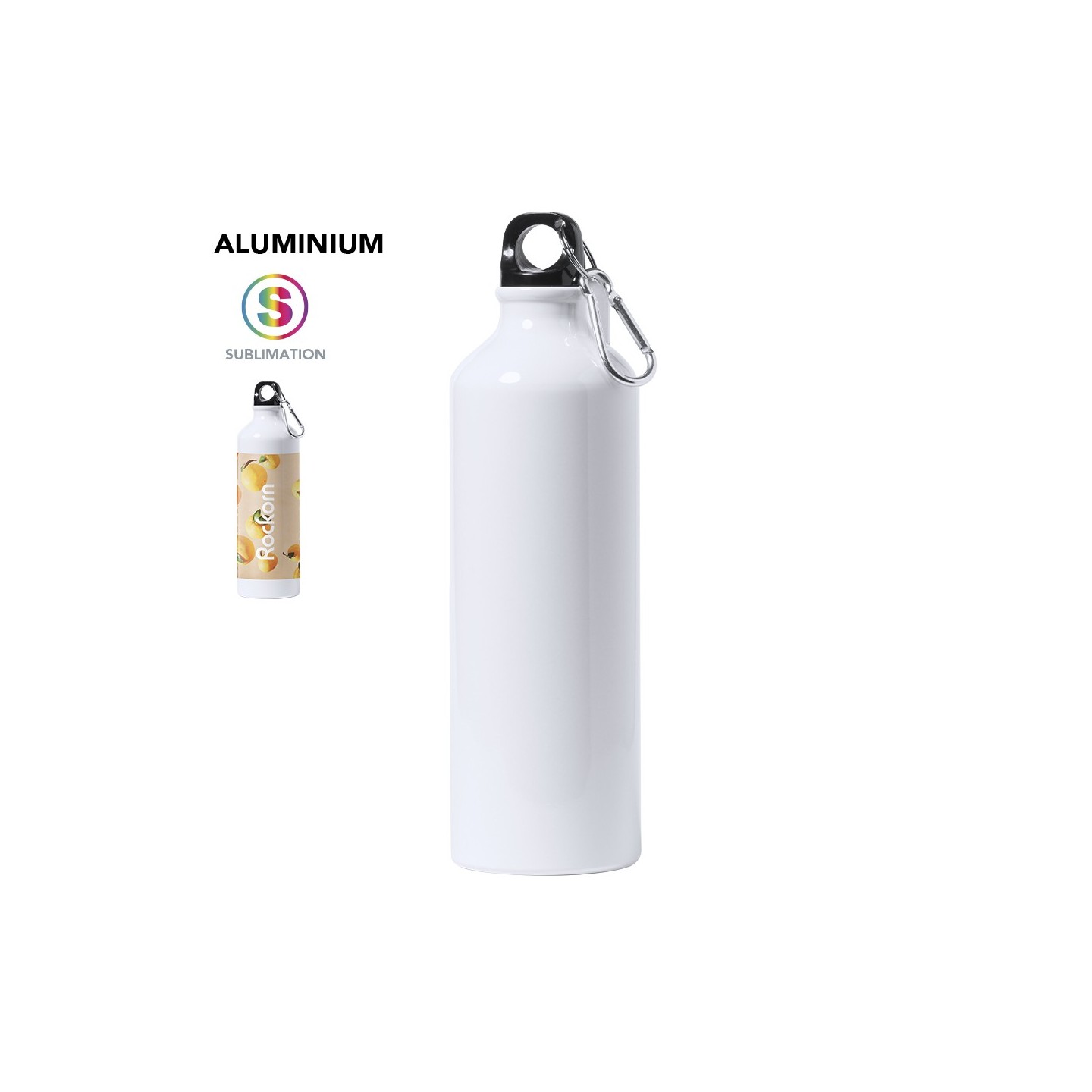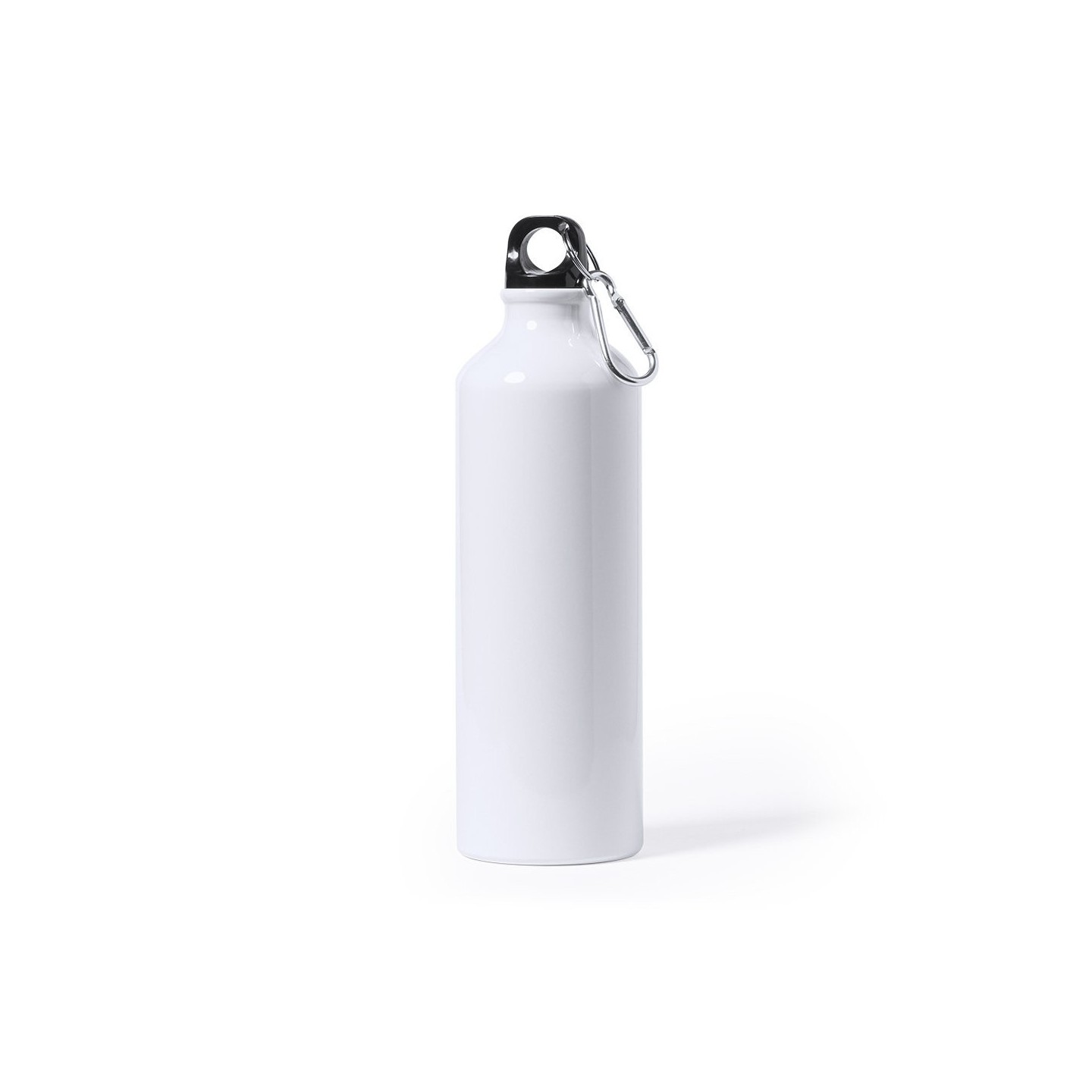 Bidón de aluminio de 800ml con diseño blanco brillante para sublimación. Tapón de seguridad y mosquetón metálico. Ideal para regalos personalizados.