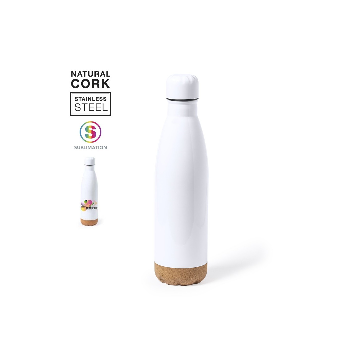 Marca tendencia con el Bidón Sublimación Pooch. Capacidad 750 ml, diseño para sublimación, acero inoxidable, acabado blanco brillo, tapón a rosca y base de corcho. Personalización y estilo en un solo bidón.