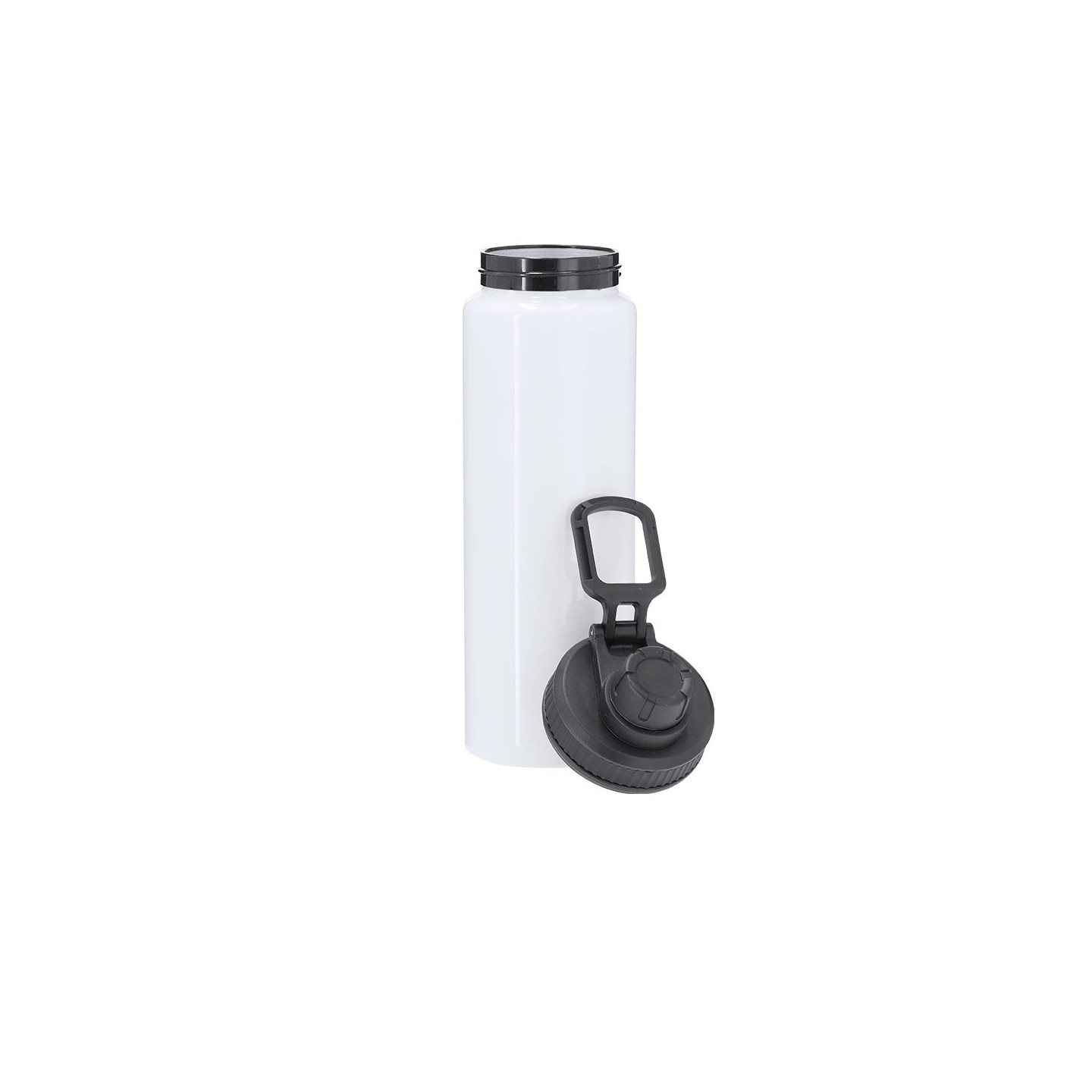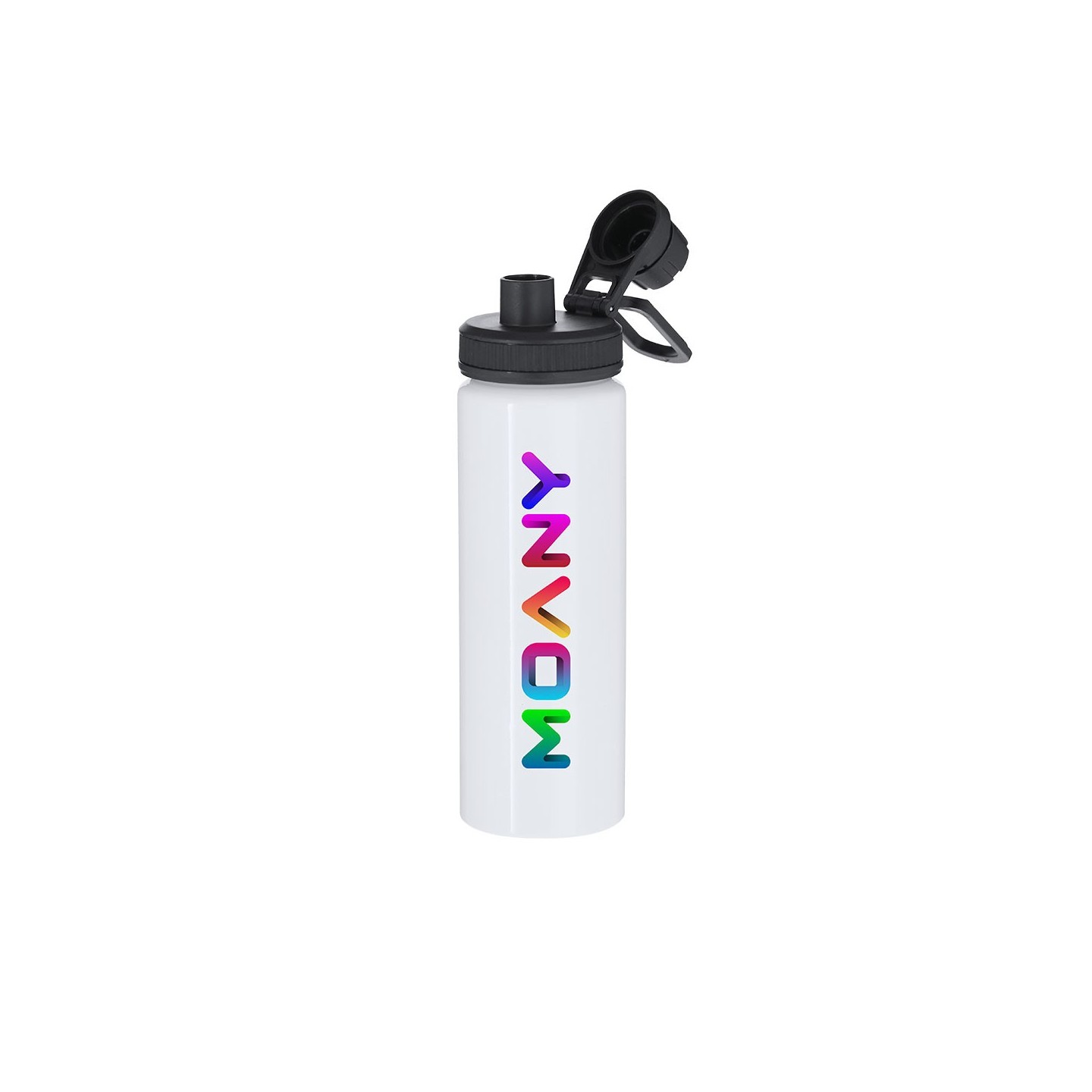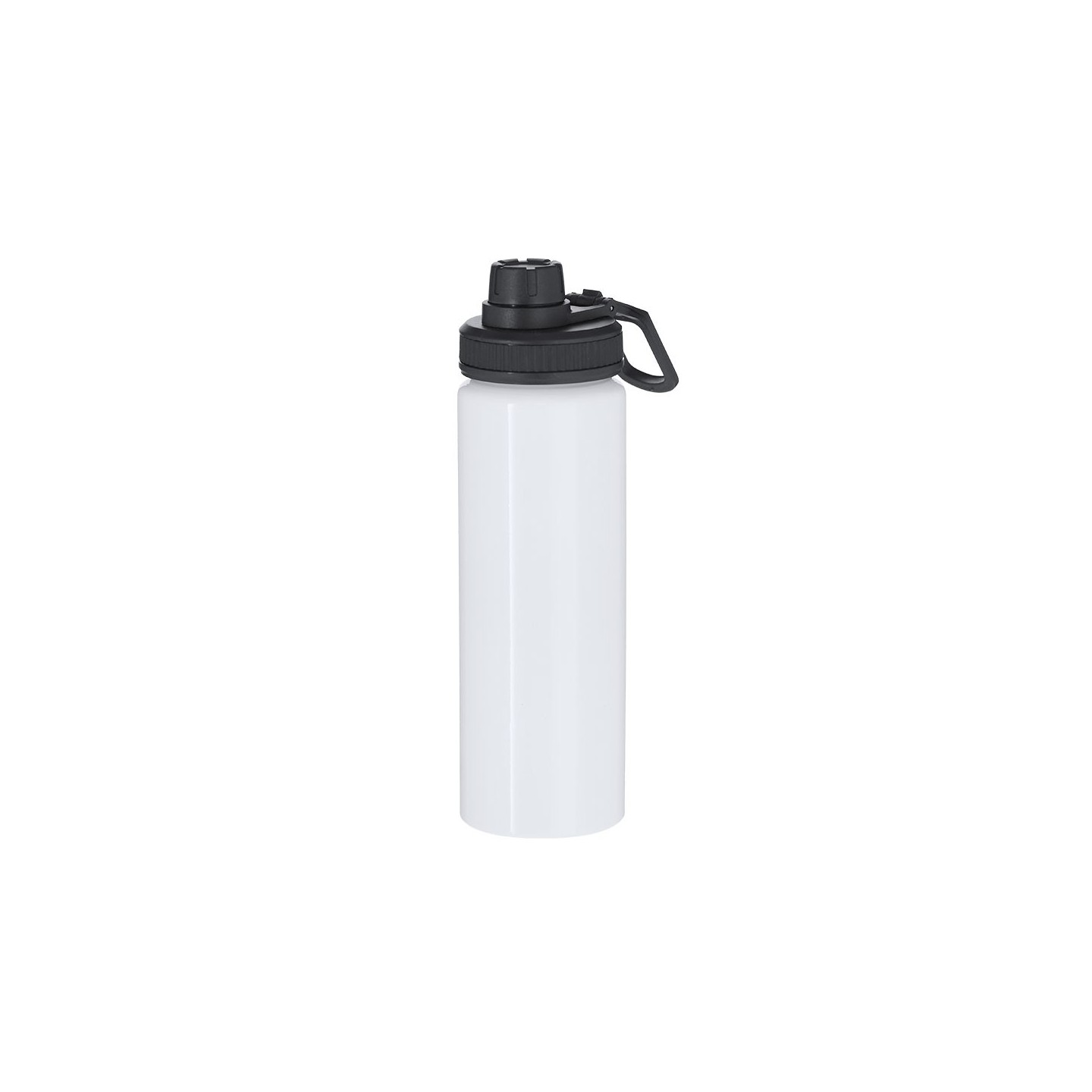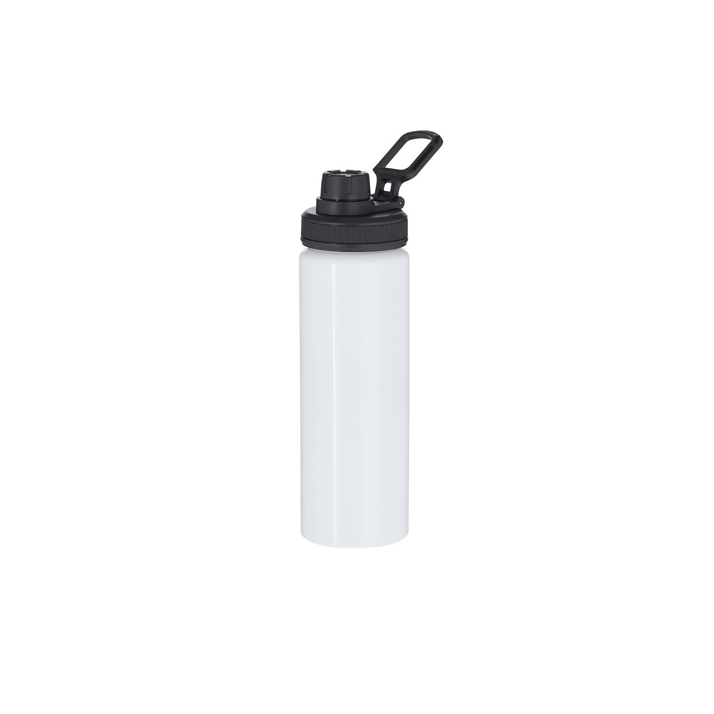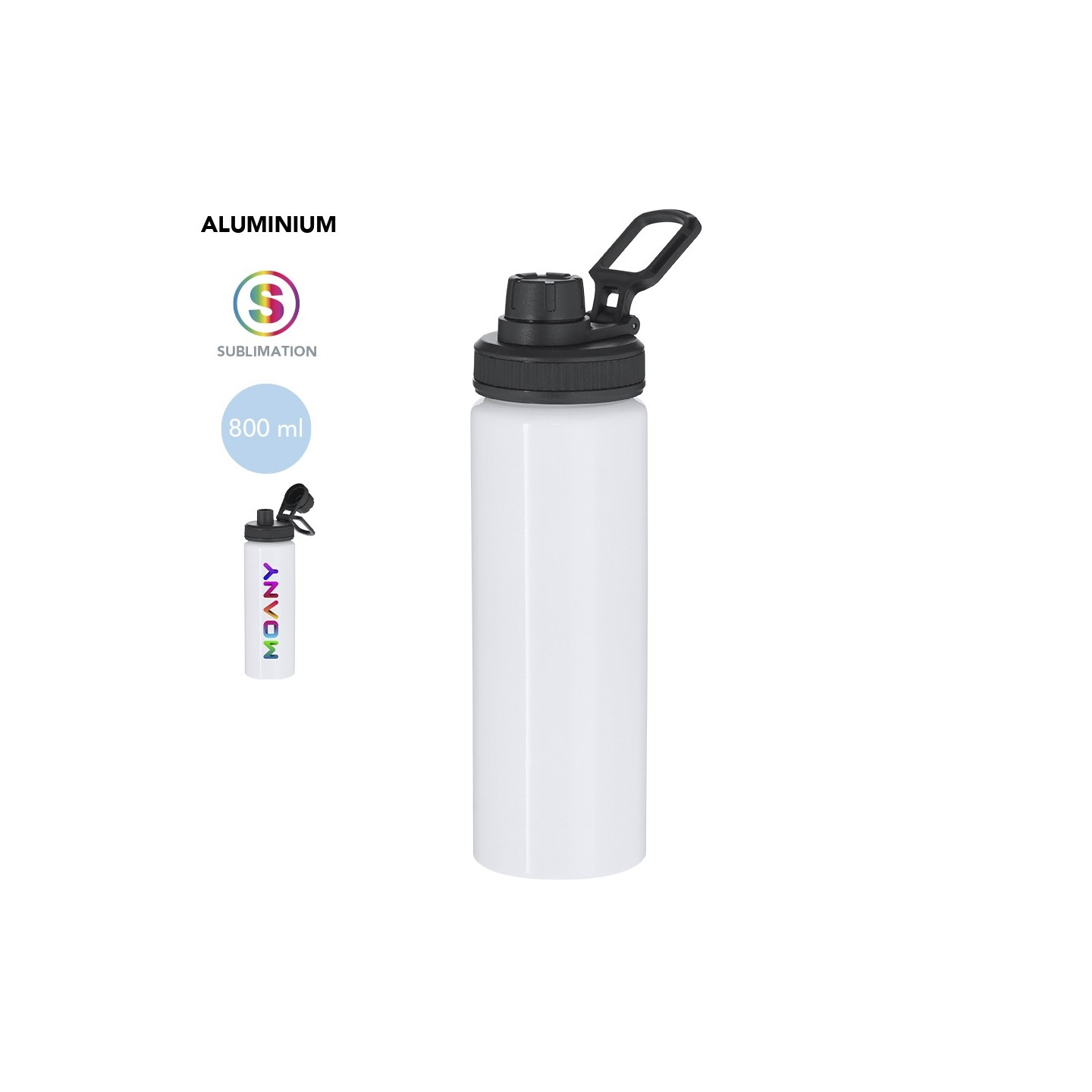 Bidón de aluminio de 800 ml con diseño sublimable, tapón a rosca, dosificador y asa ajustable. Personalizable con logotipo. Libre de BPA y fácil de transportar.