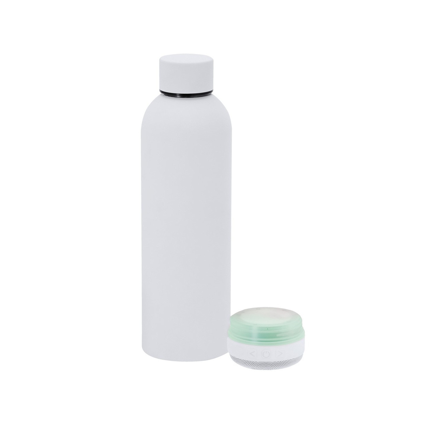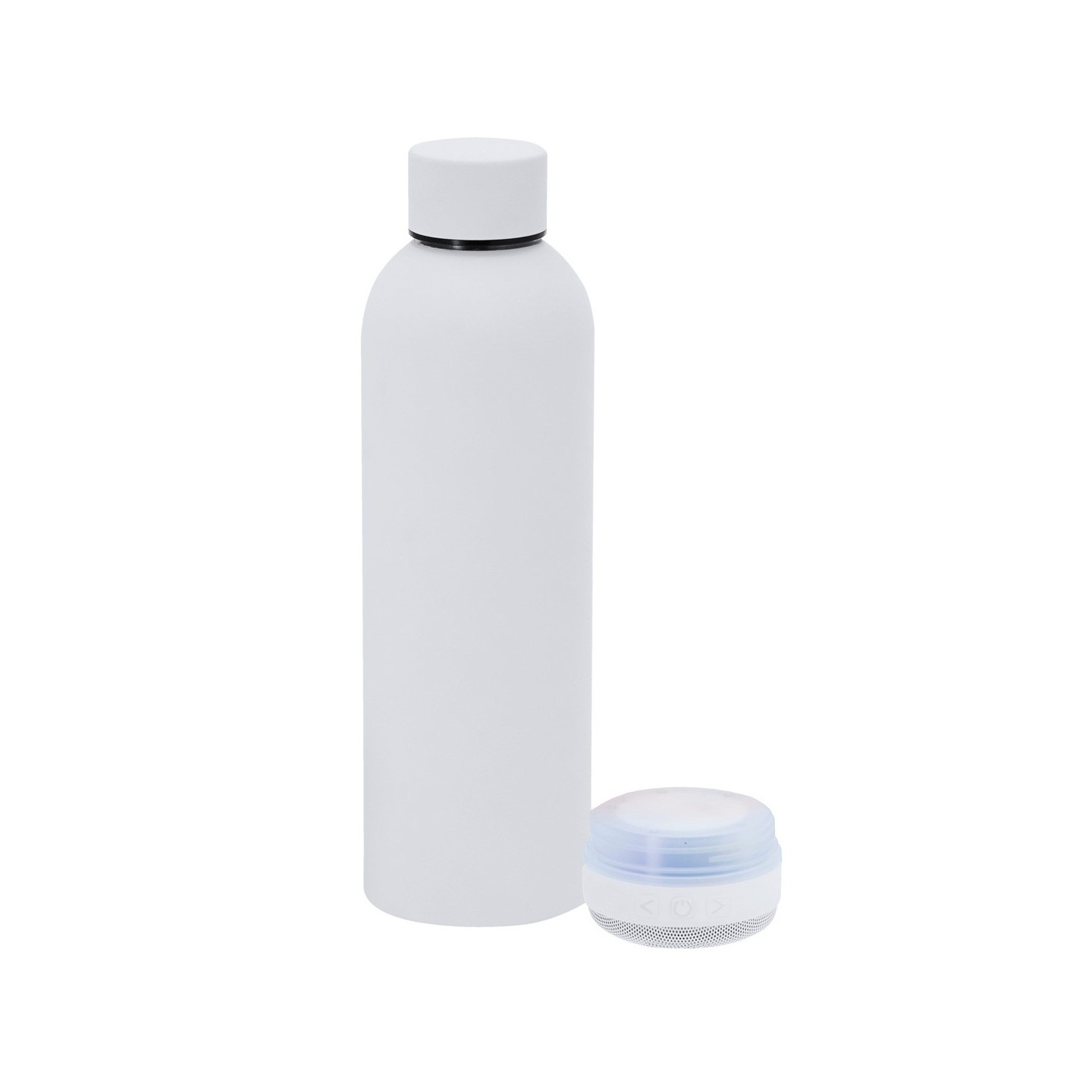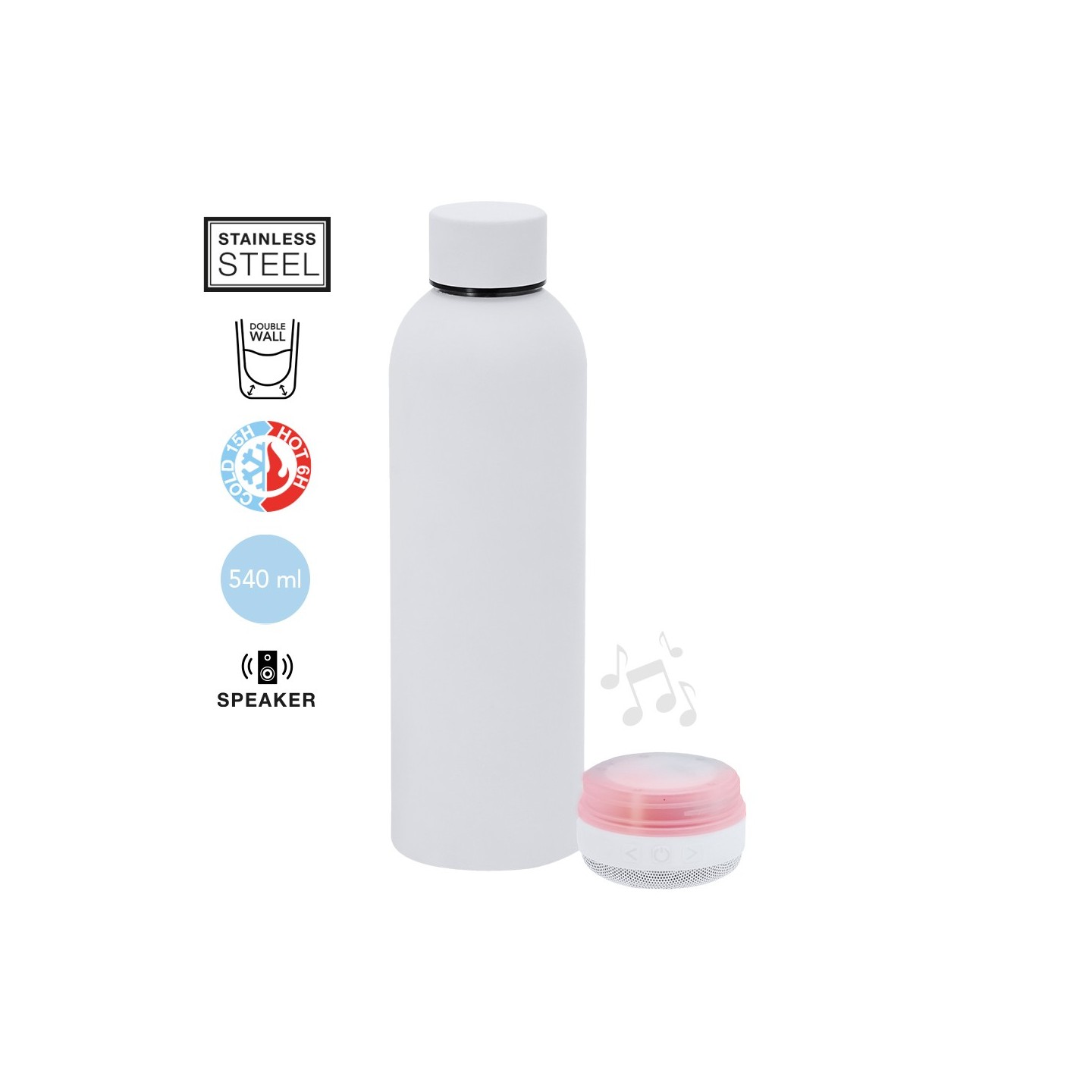 Bidón térmico de 540 ml con altavoz Bluetooth 5.3 y LED RGB. Fabricado en acero inoxidable, ideal para bebidas frías o calientes. Personalizable.