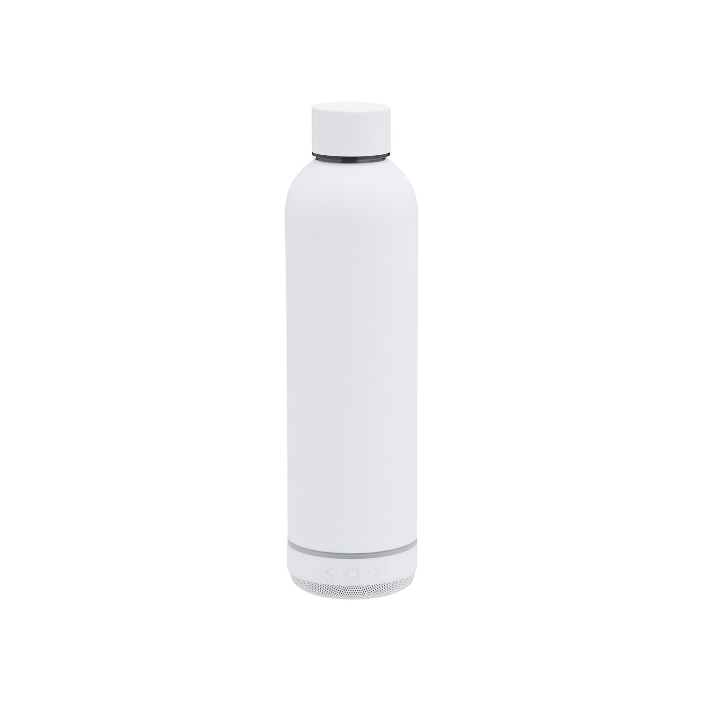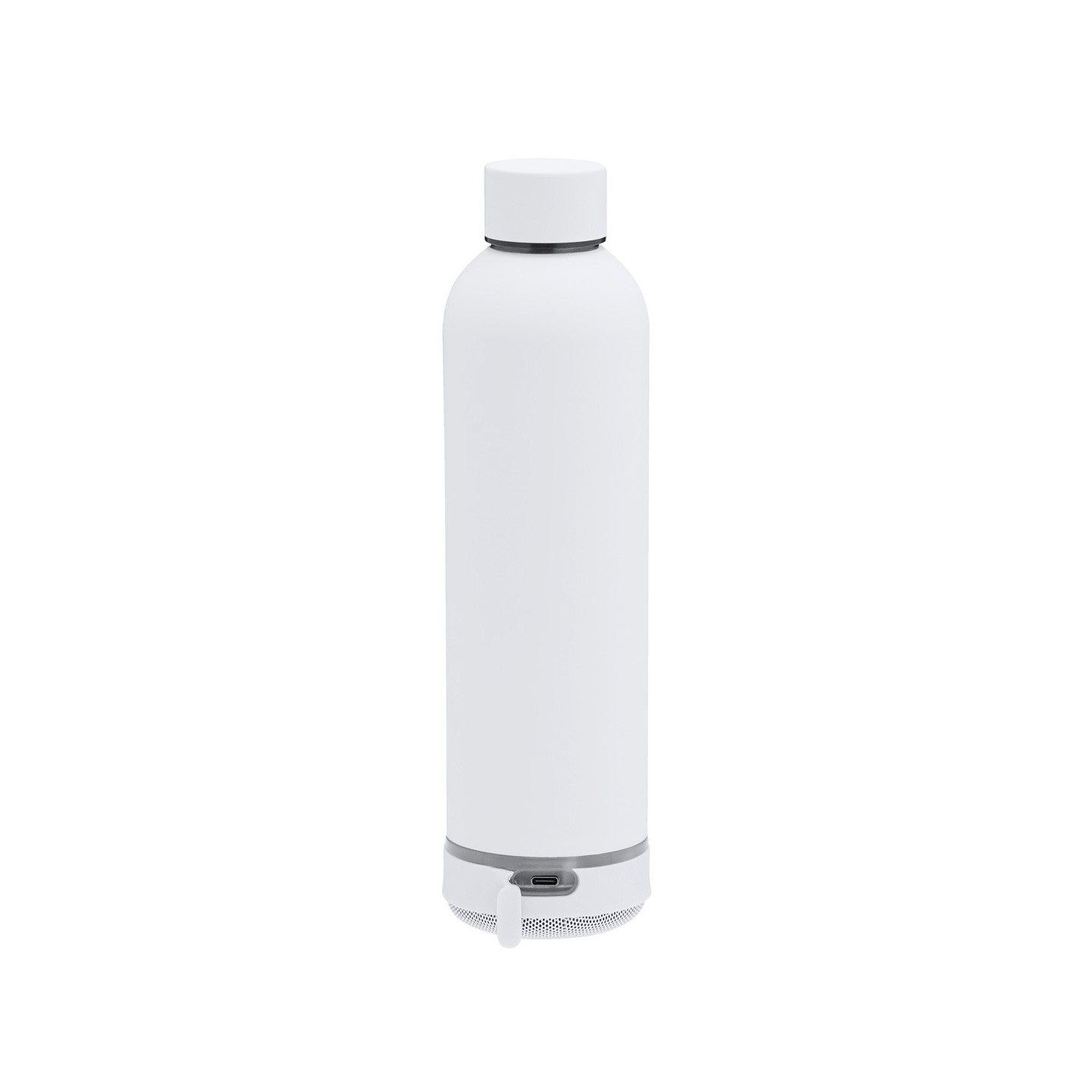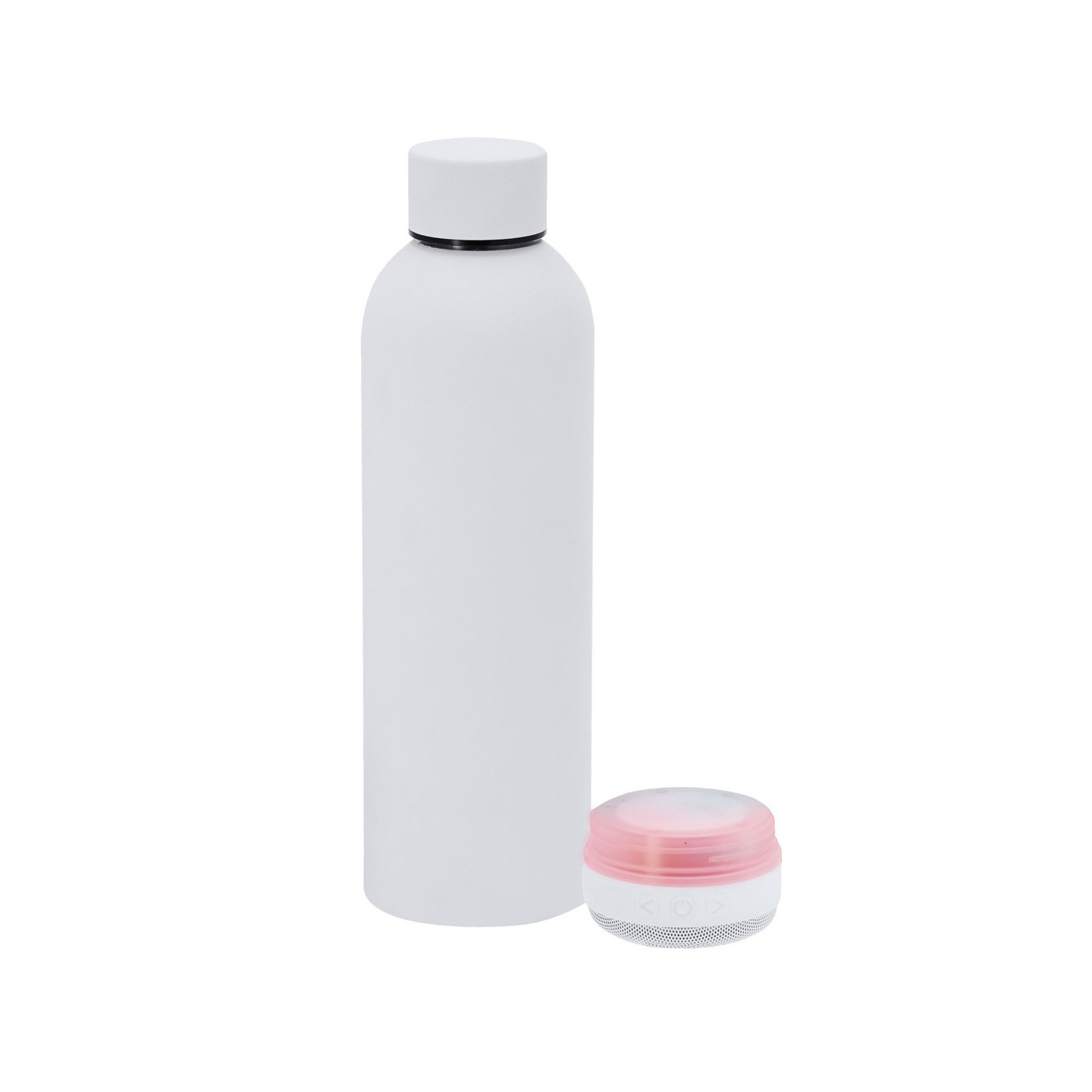 Bidón térmico de 540 ml con altavoz Bluetooth 5.3 y LED RGB. Fabricado en acero inoxidable, ideal para bebidas frías o calientes. Personalizable.