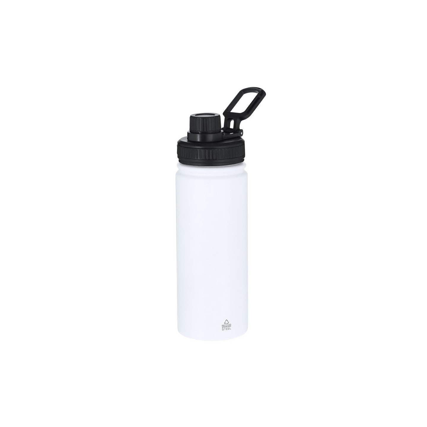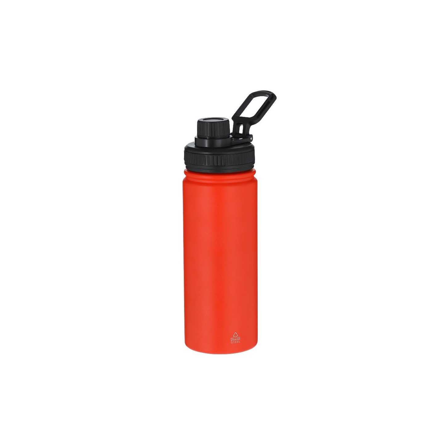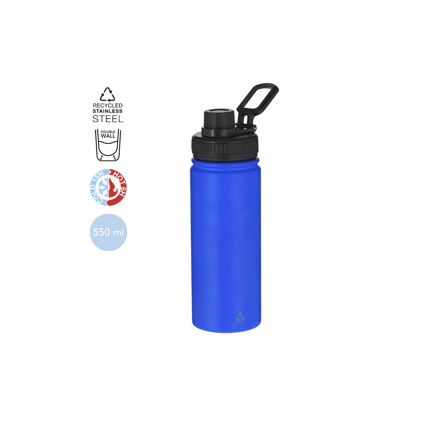 Bidón térmico de acero inoxidable reciclado de 550 ml, con tapa a rosca y asa ajustable. Mantiene el frío 15h y el calor 6h. Personalizable con tu logotipo.