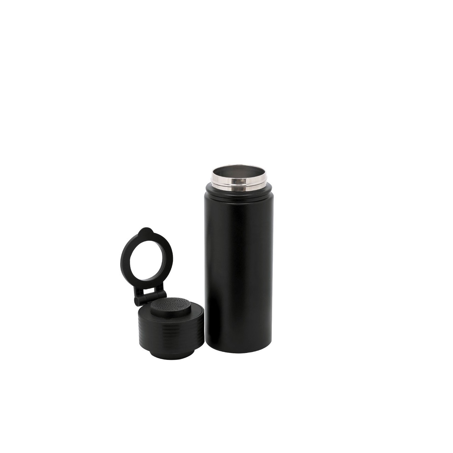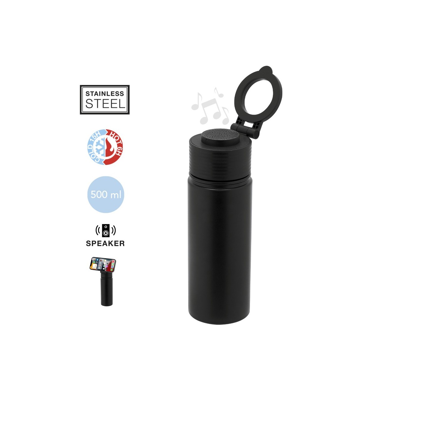 Bidón térmico con altavoz Bluetooth 5.4, 500 ml, acero inoxidable, mantiene las bebidas frías 15H/calientes 6H. Personalizable con logotipo.