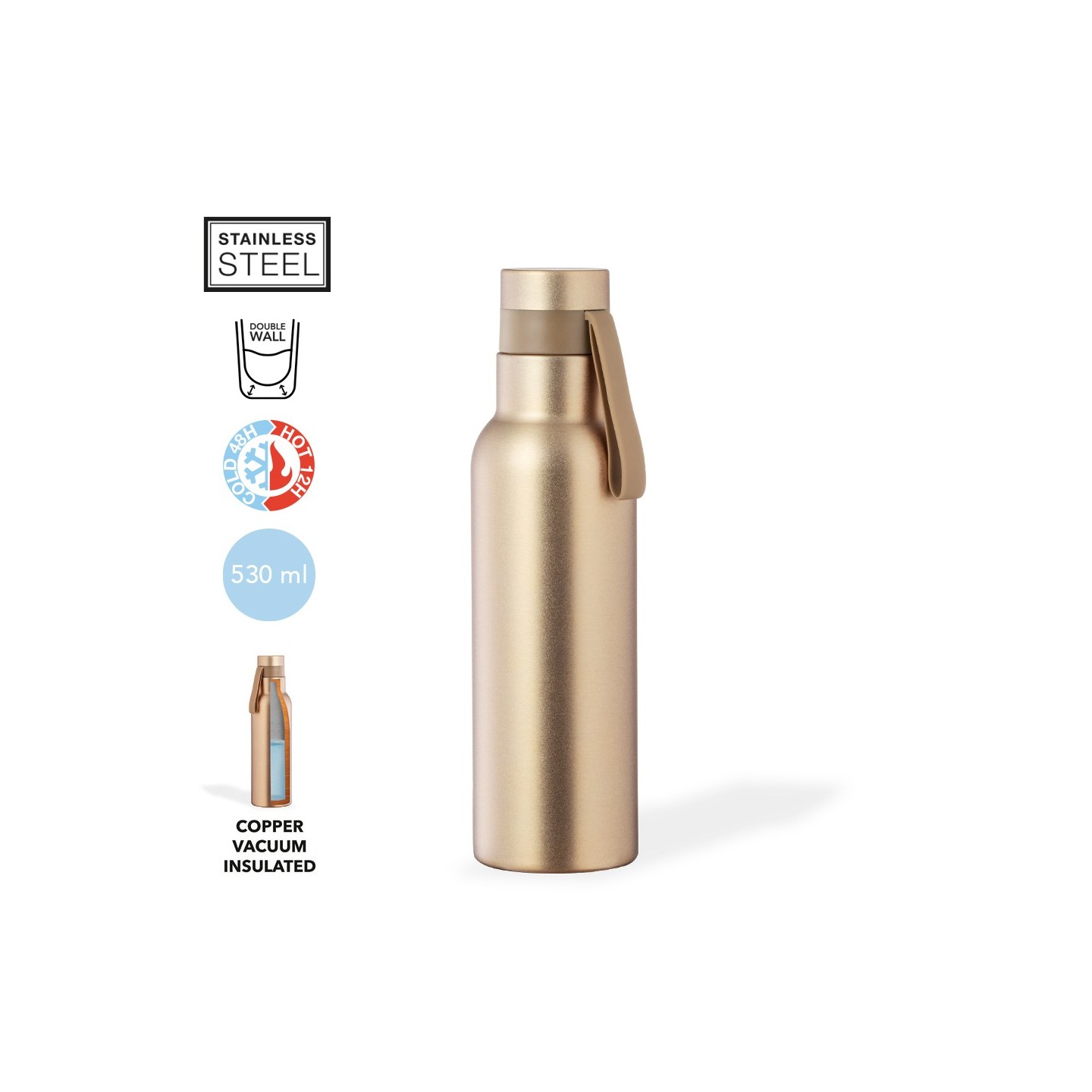 Su diseño incluye un innovador aislamiento de cobre al vacío, que permite mantener el calor de las bebidas durante hasta 12 horas y el frío durante hasta 48 horas. Ya sea en invierno o en verano, podrás disfrutar de tus bebidas calientes o refrescantes sin preocuparte por la temperatura exterior.