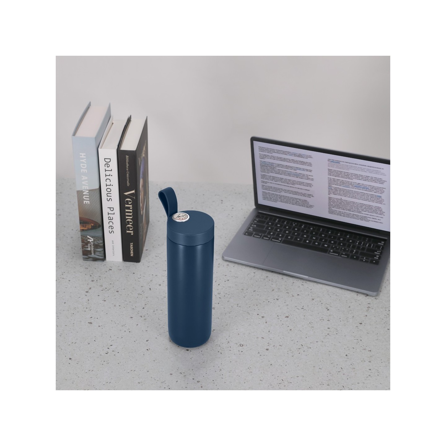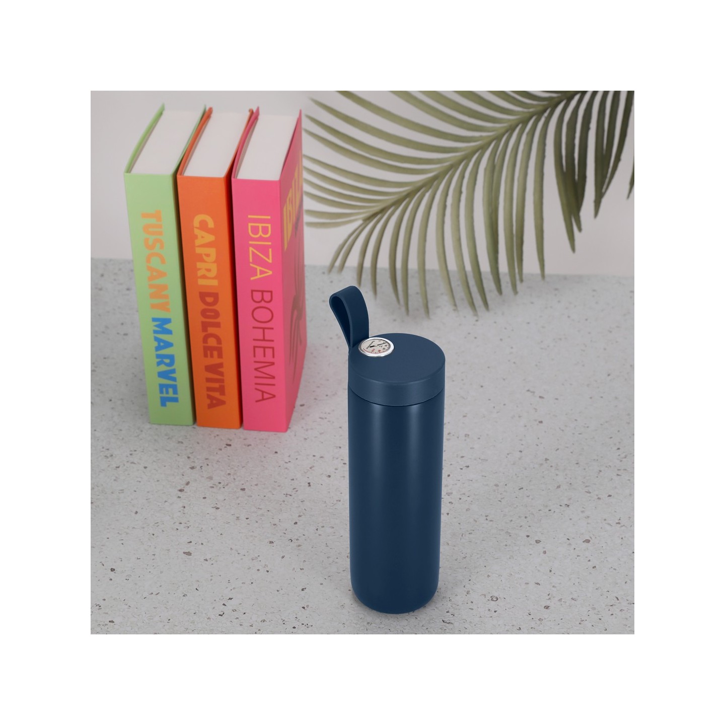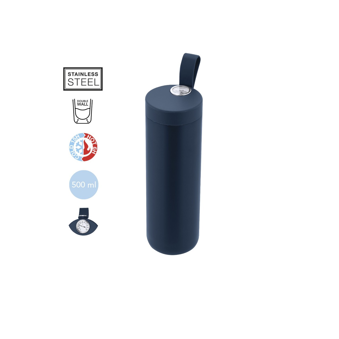 Bidón Térmico ROYAN de 500 ml, acero inoxidable, mantiene bebidas frías 15h y calientes 6h. Personalizable con tu logotipo. Medidor de temperatura analógico y asa integrada.