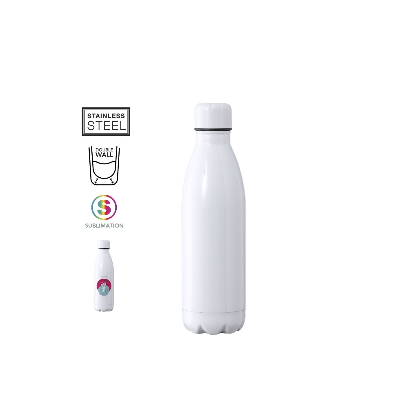 El bidón Sublimación Varn destaca por su acabado blanco brillo y su tapón a rosca a juego. Además, está libre de BPA, garantizando la seguridad de tus bebidas.