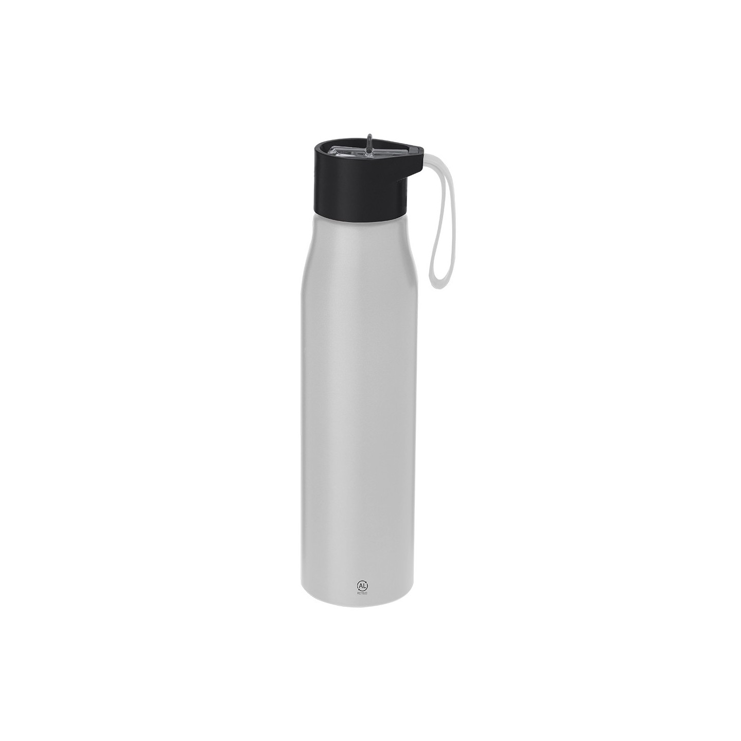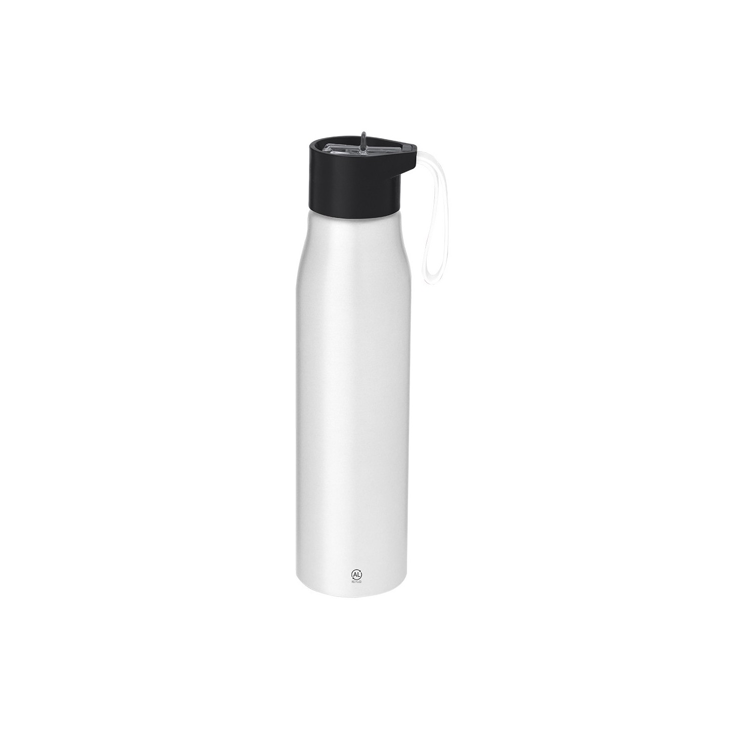 Bidón THORUP de 700 ml, aluminio reciclado, acabado mate. Fácil apertura, dosificador con pajita y correa de silicona. Personalizable con tu logotipo.