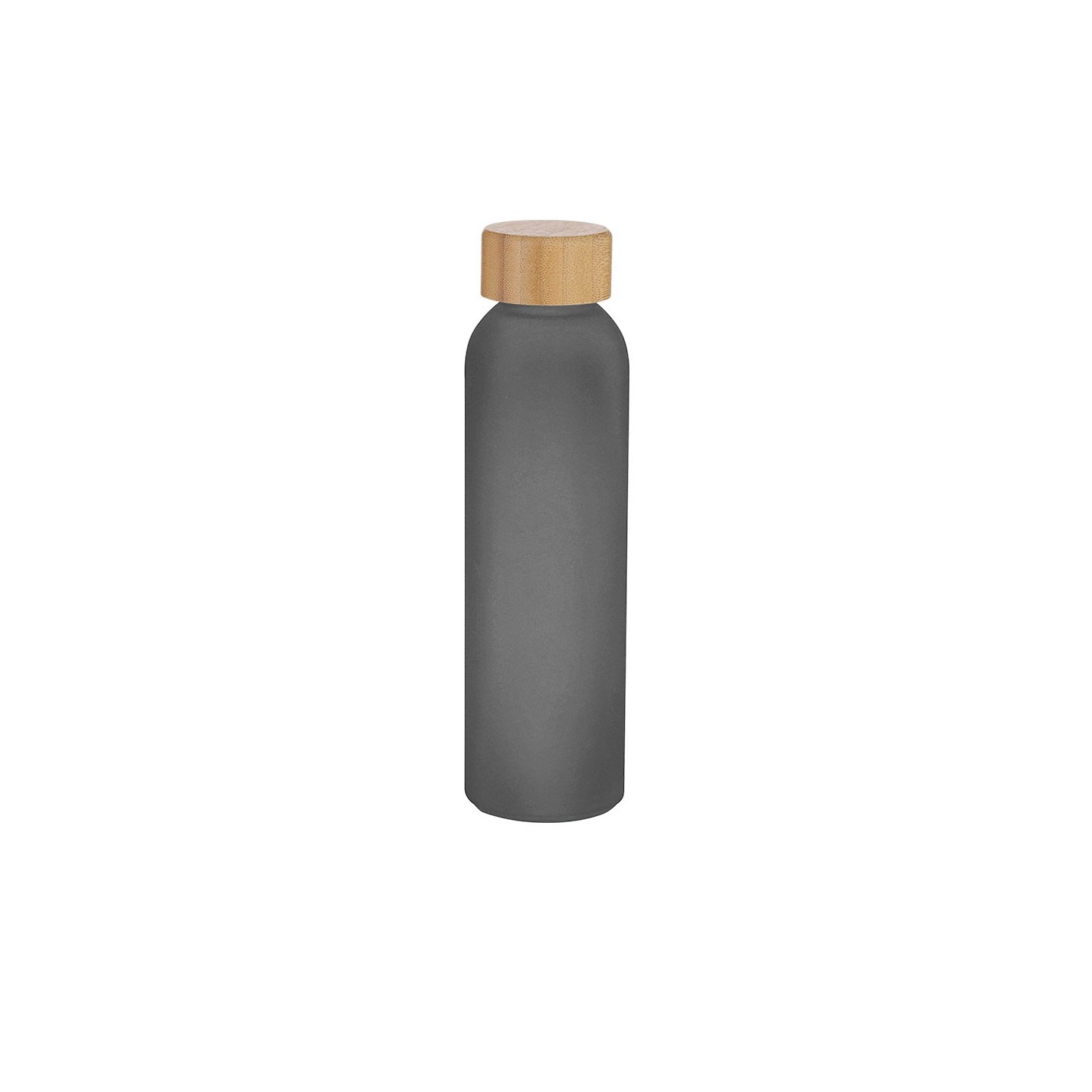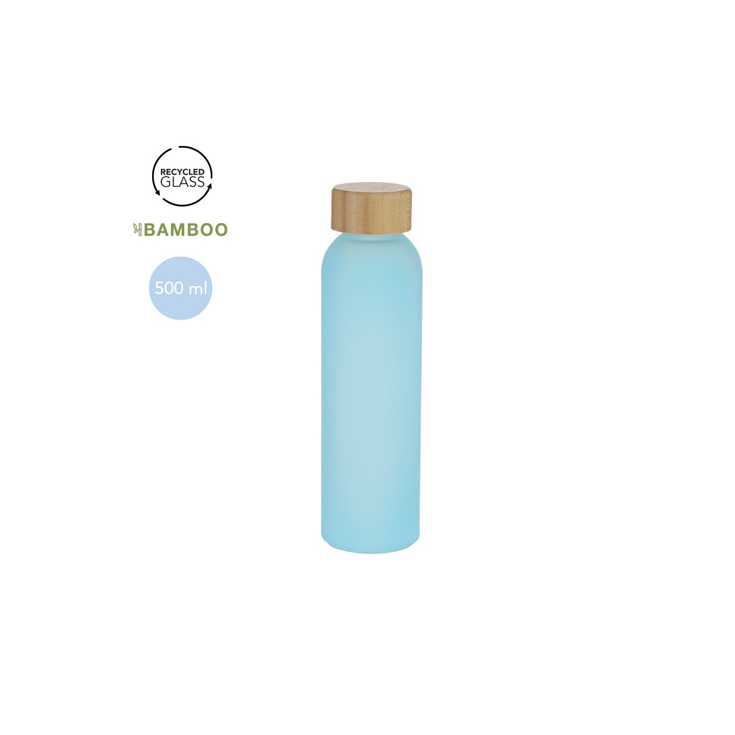 Bidón TISTAK de cristal reciclado de 500 ml con tapón de bambú. Ideal para personalizar con tu logo. Ecológico y práctico para tus campañas.