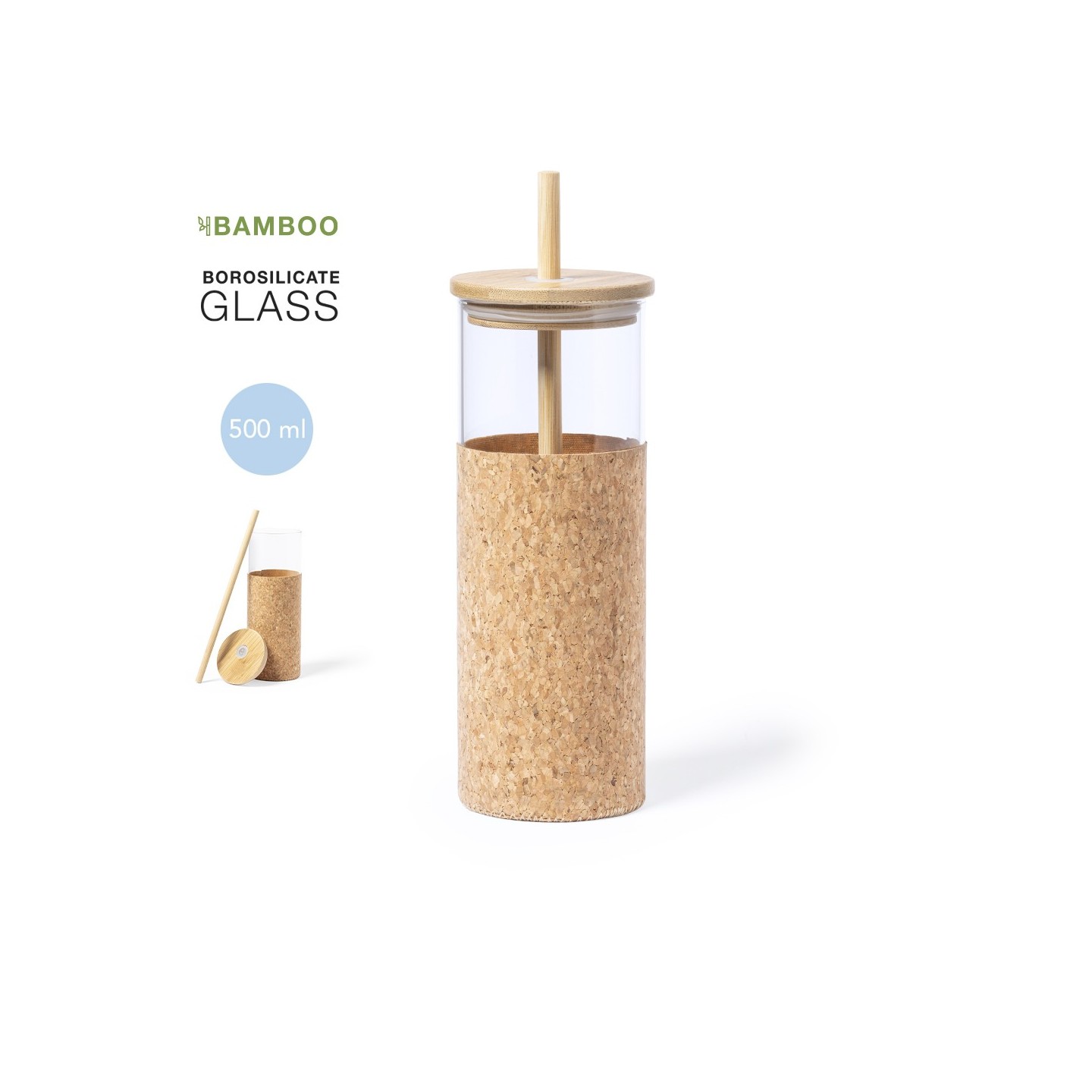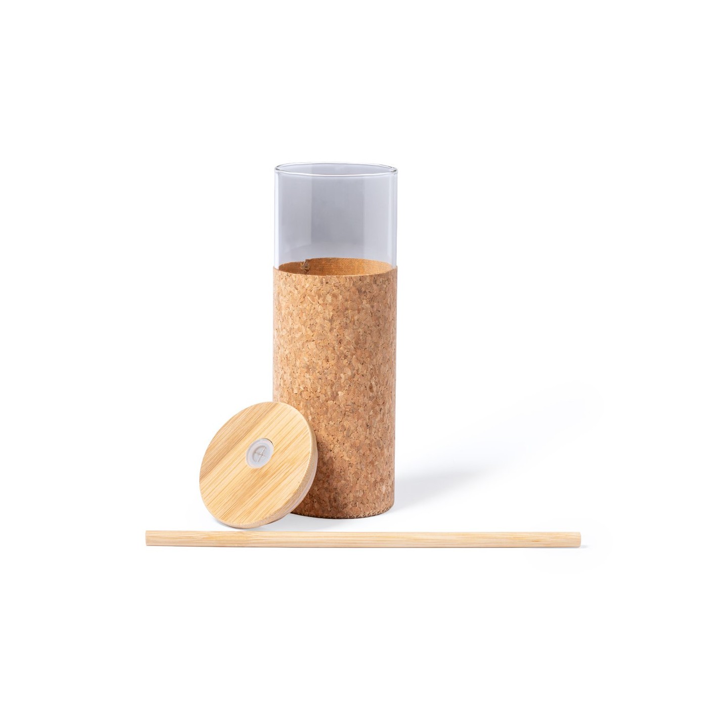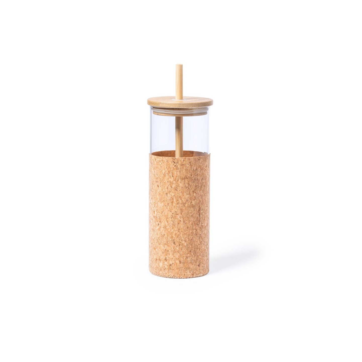 El bidón Tromury dislumbra con su alta calidad en un diseño nature. Cuerpo de cristal resistente, funda de corcho, tapón de bambú y pajita reutilizable. Ideal para regalos personalizados.