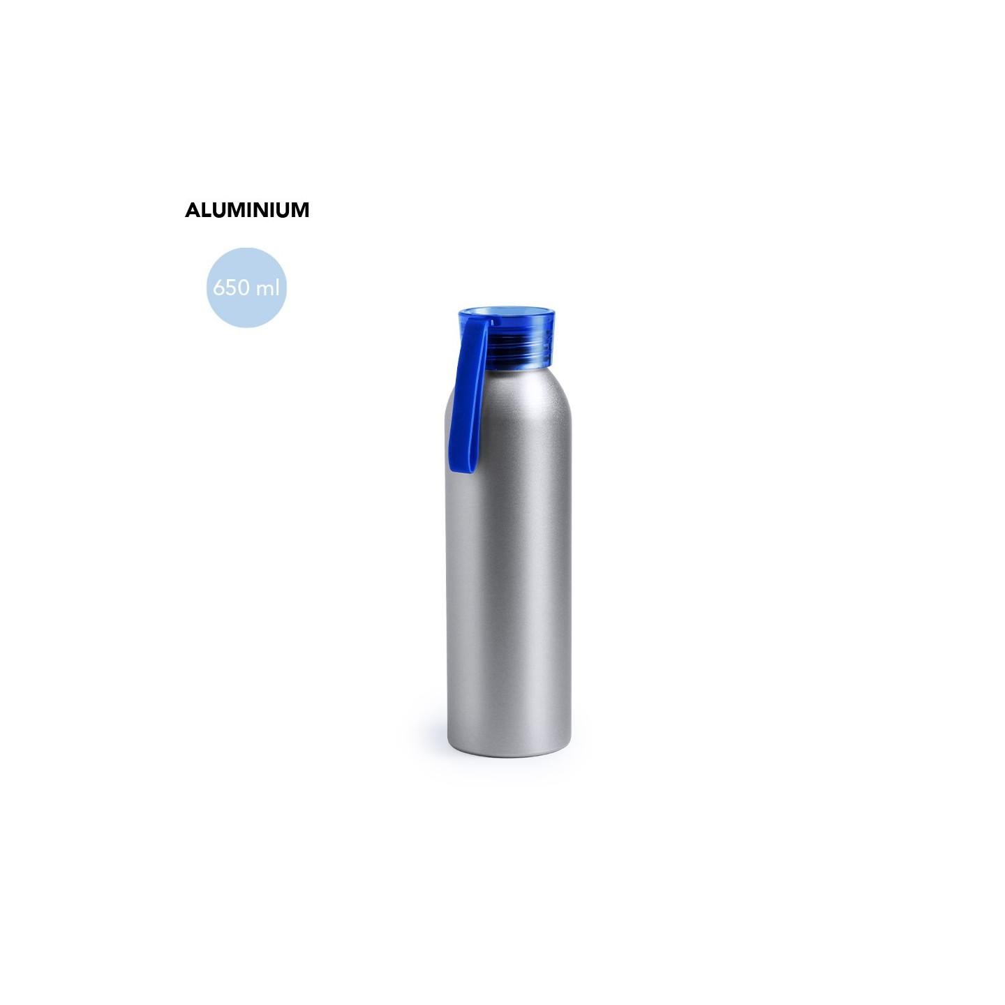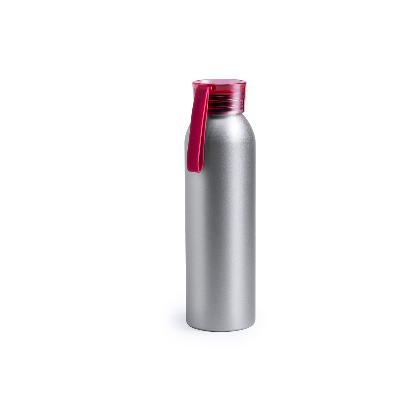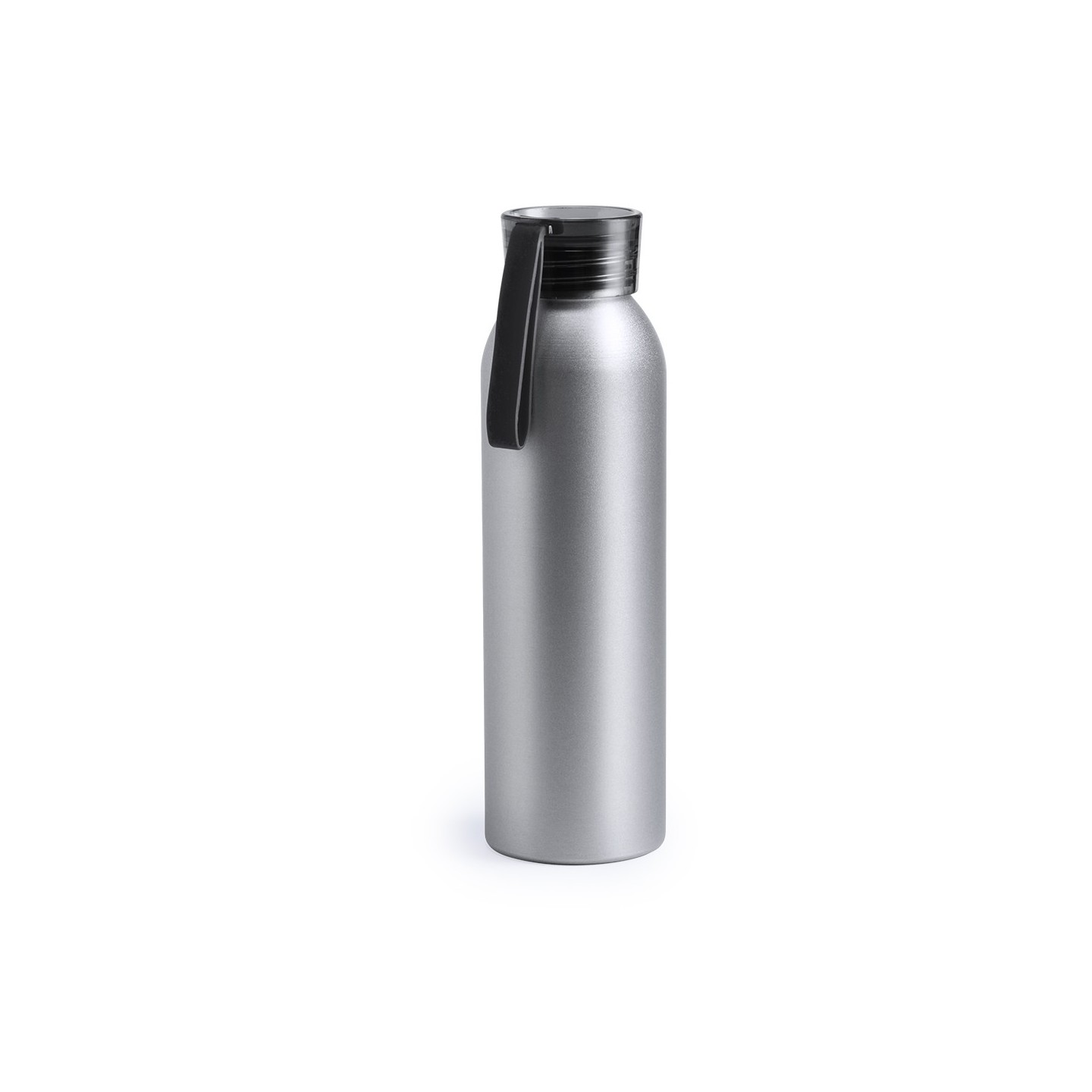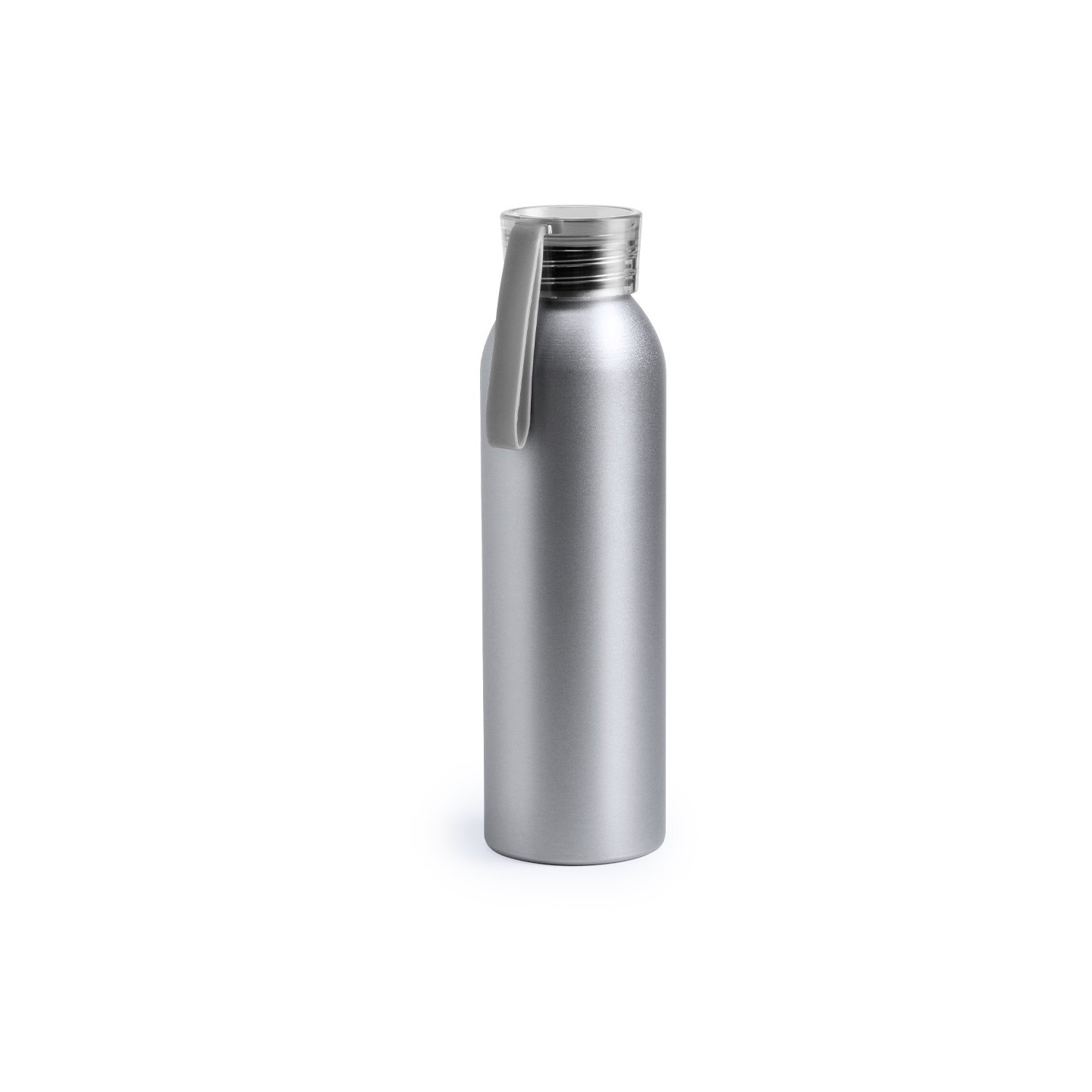 El Bidón Tuke les de aluminio de 650ml, diseño plateado con tapón de seguridad en colores transparentes y cinta de transporte. ¡Práctico y estilizado para tus actividades diarias!