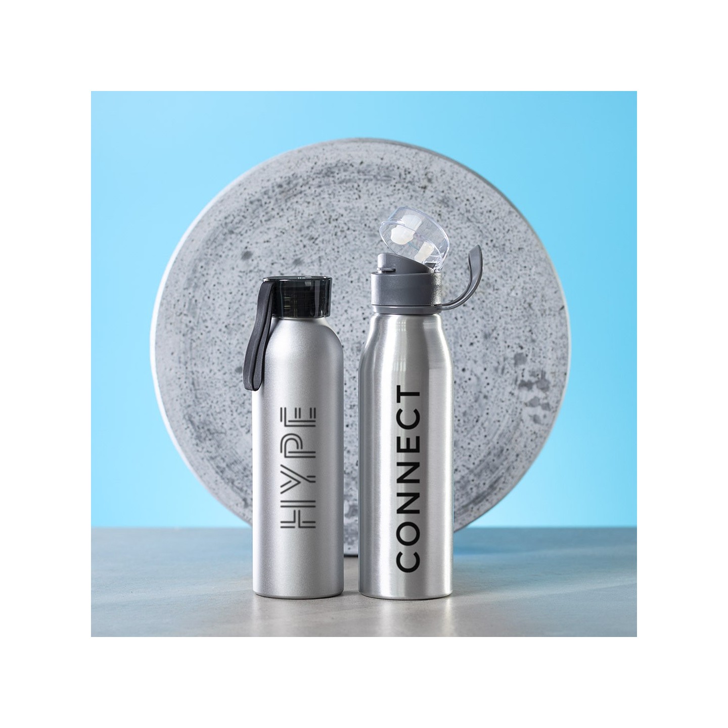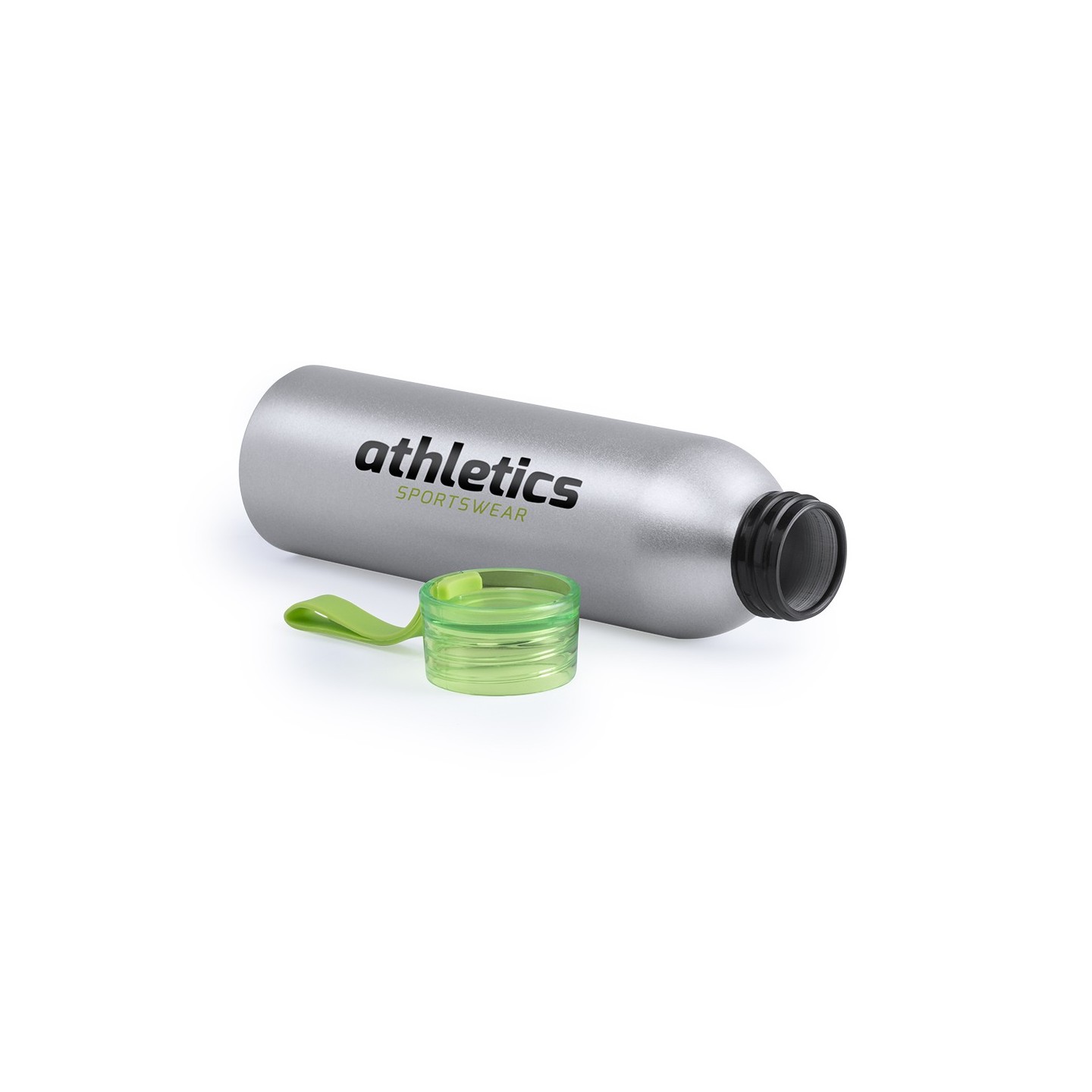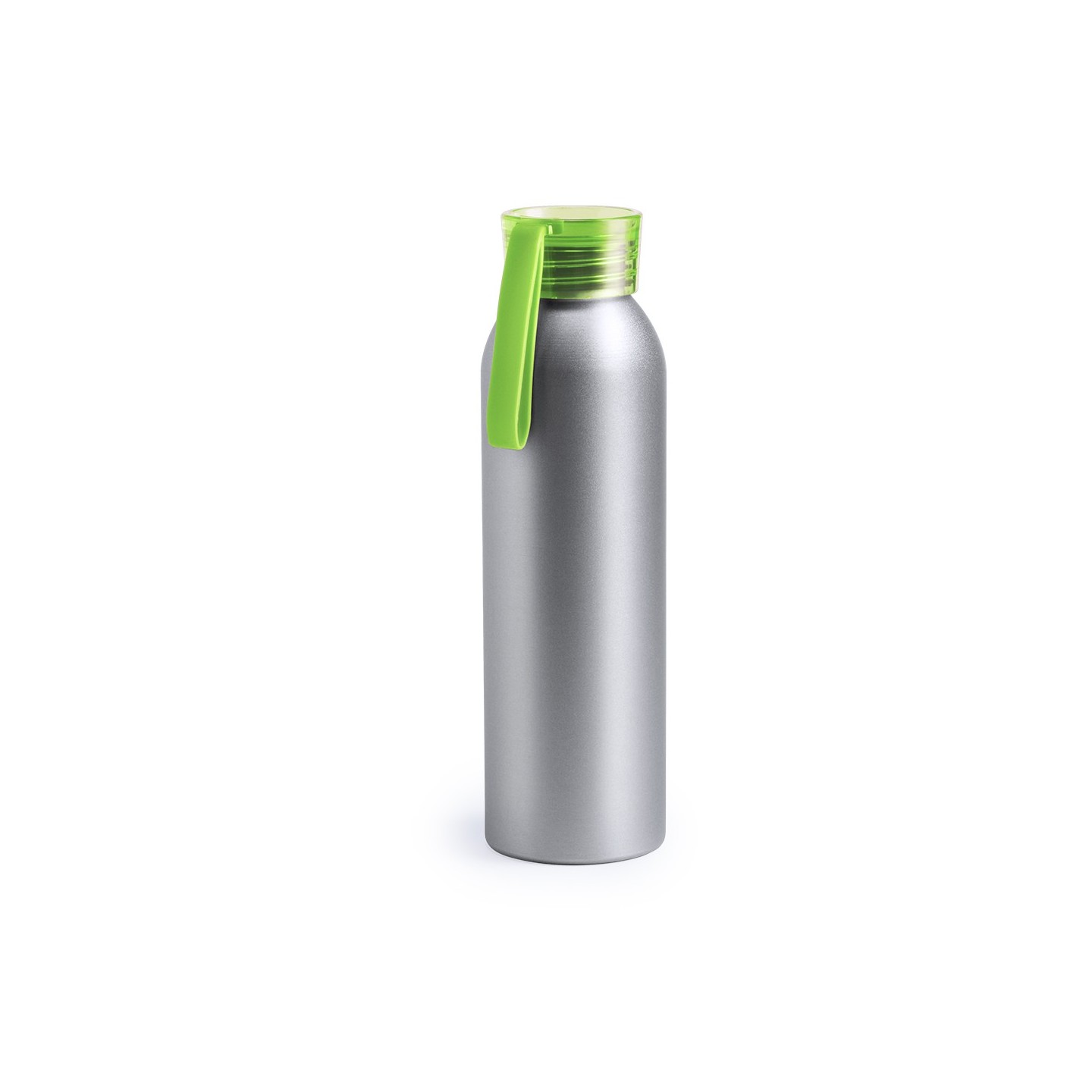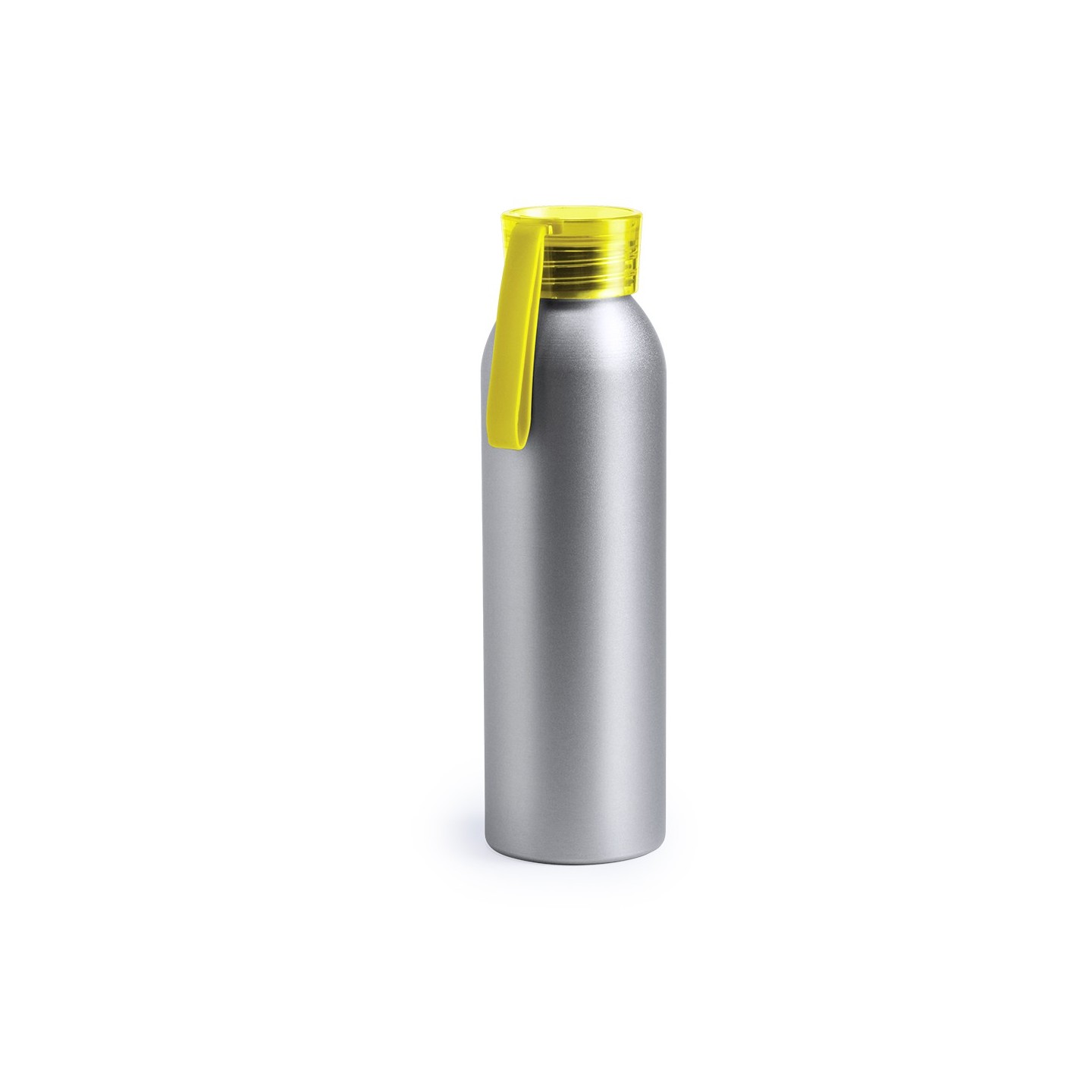 El Bidón Tuke les de aluminio de 650ml, diseño plateado con tapón de seguridad en colores transparentes y cinta de transporte. ¡Práctico y estilizado para tus actividades diarias!