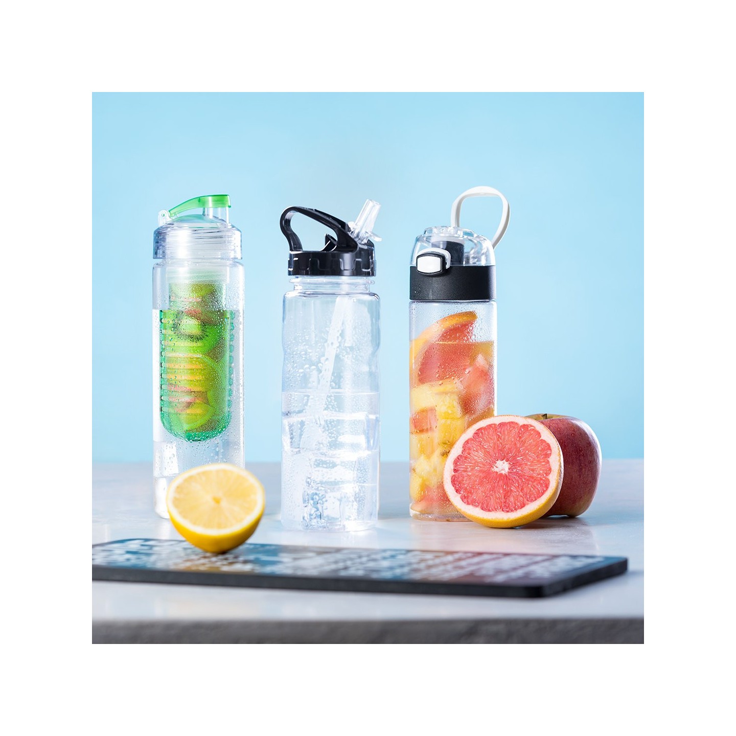 - Botellas: Disponibles en materiales como plástico (PET), acero inoxidable, vidrio y aluminio. Cada material ofrece ventajas específicas, desde la ligereza del plástico hasta la durabilidad del acero inoxidable.