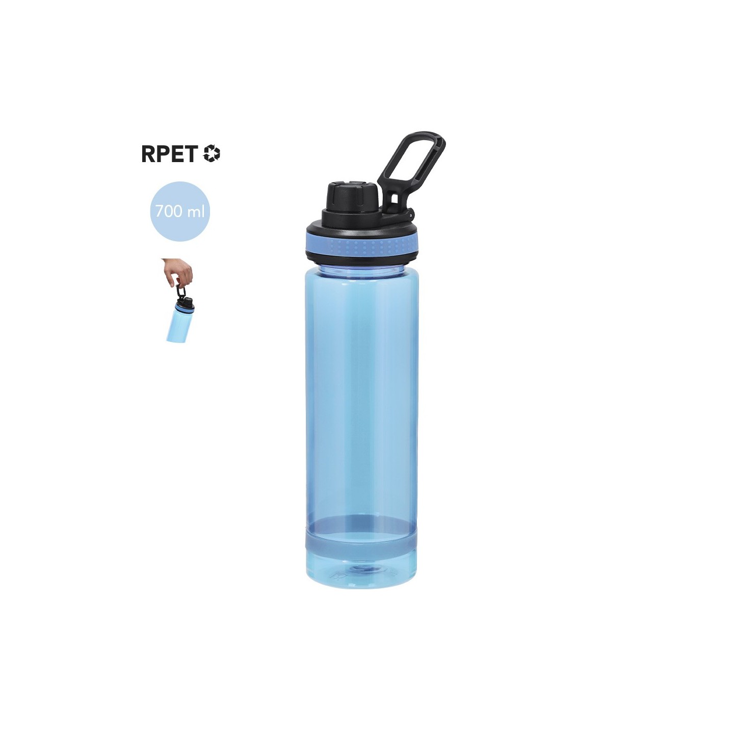 El Bidón Ziffel de 700 ml, fabricado en RPET, presenta un diseño translúcido mate con tapa a rosca y asa de transporte. Personalizable y libre de BPA, ideal para un estilo de vida sostenible.