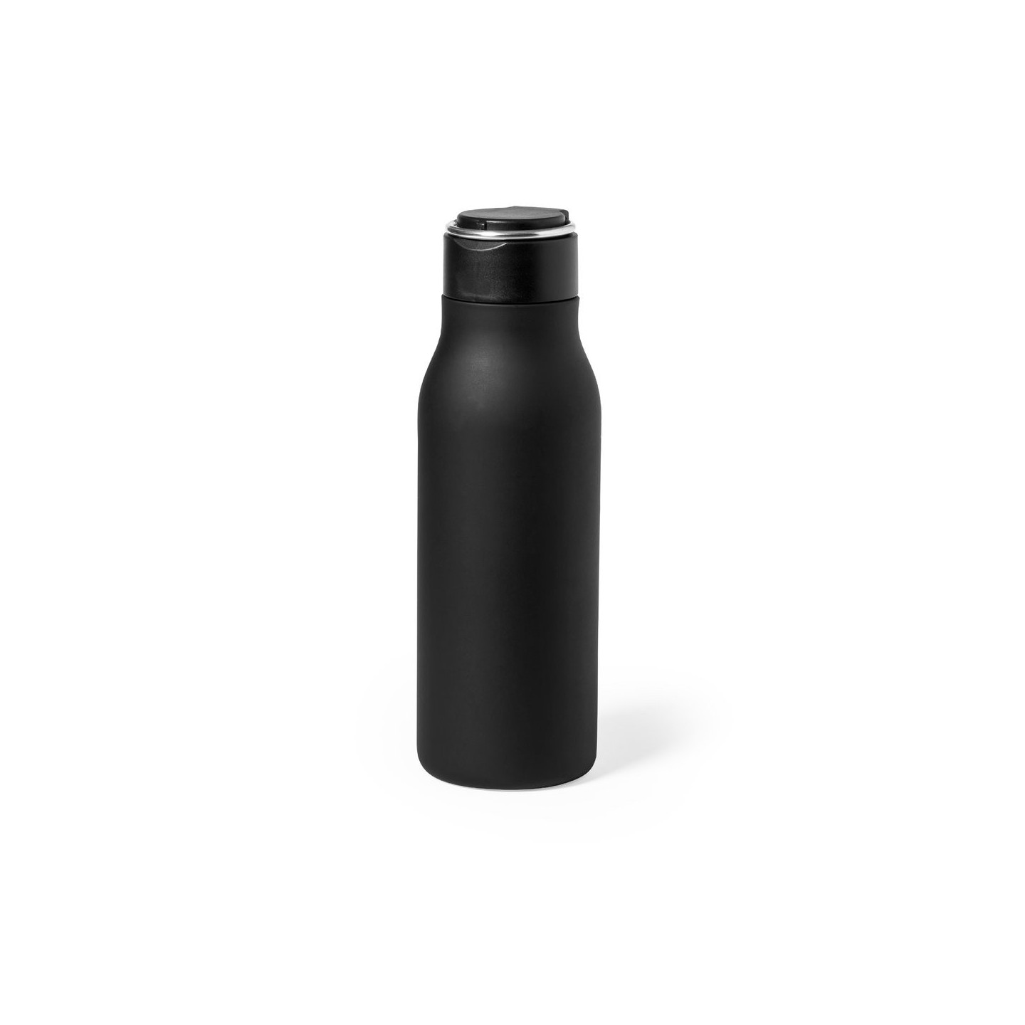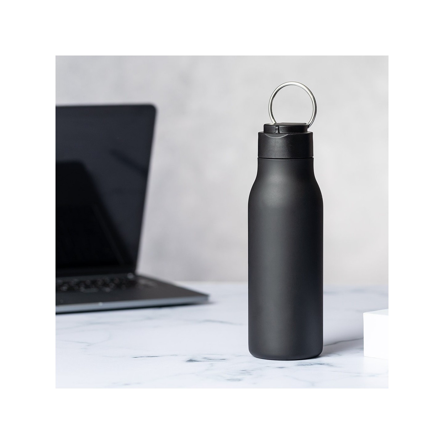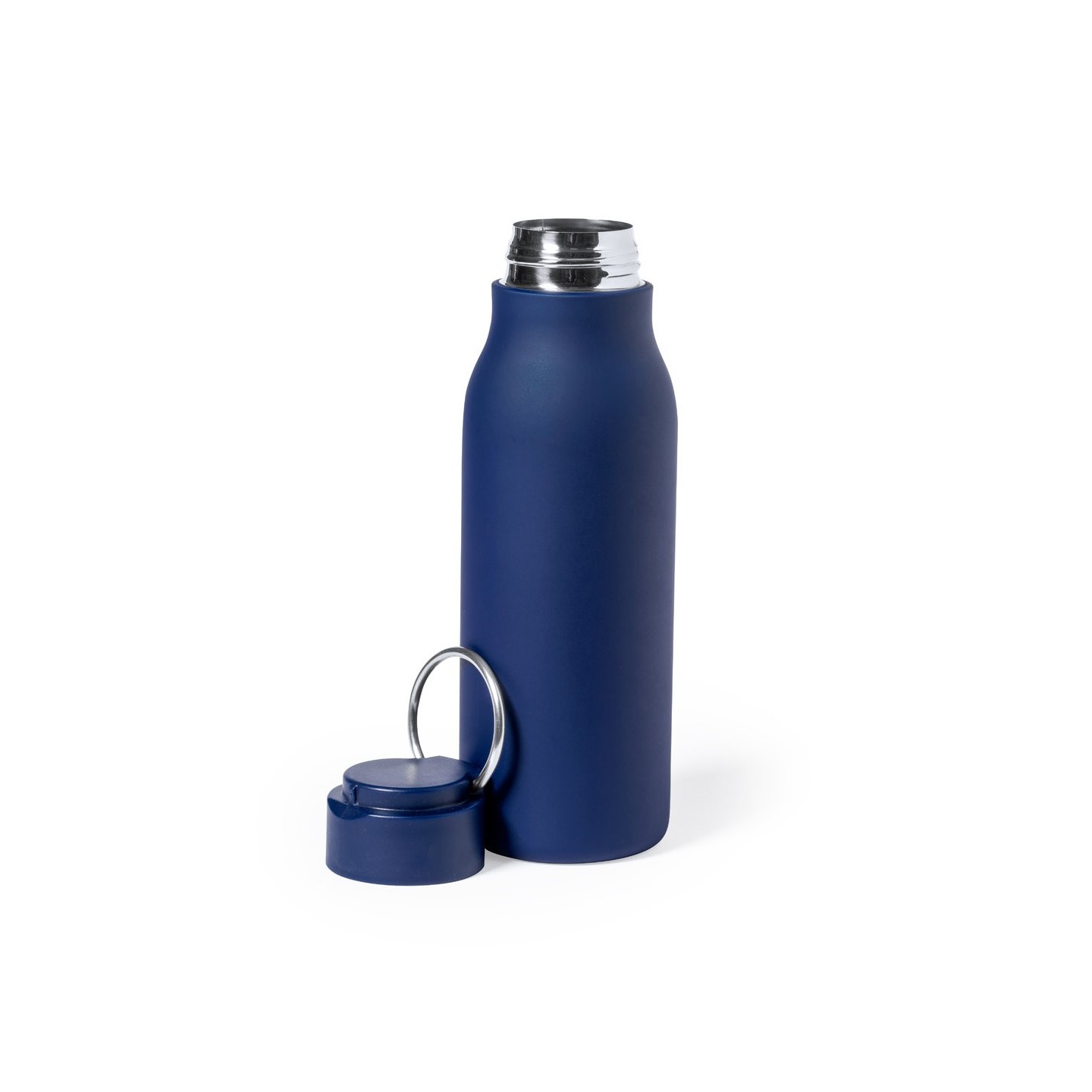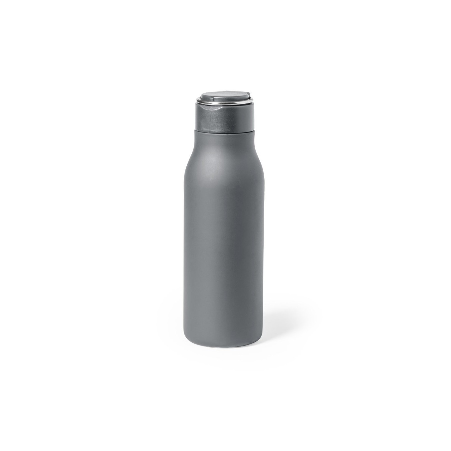 El tapón a rosca a juego es libre de BPA y cuenta con una práctica anilla de transporte integrada. Además, este bidón presenta un diseño plegable y un elegante acabado cromado, agregando estilo y funcionalidad.