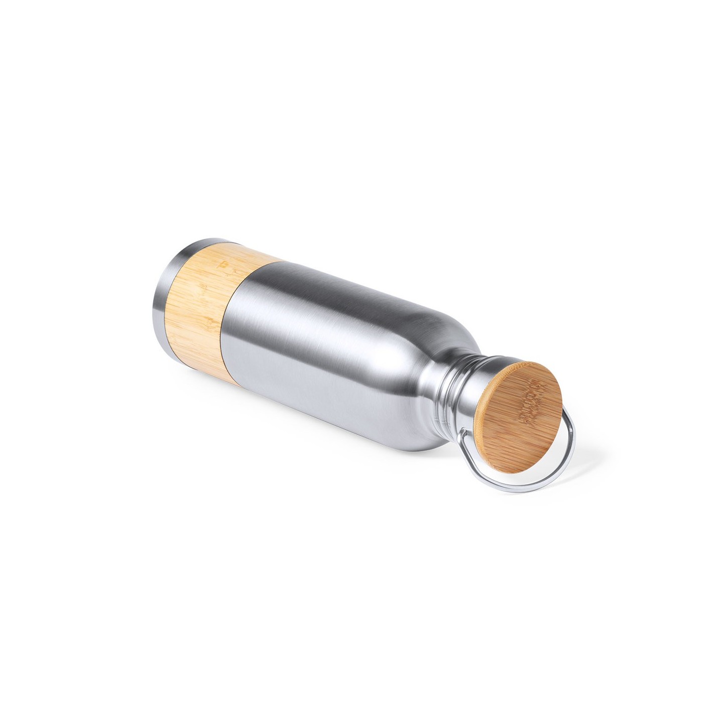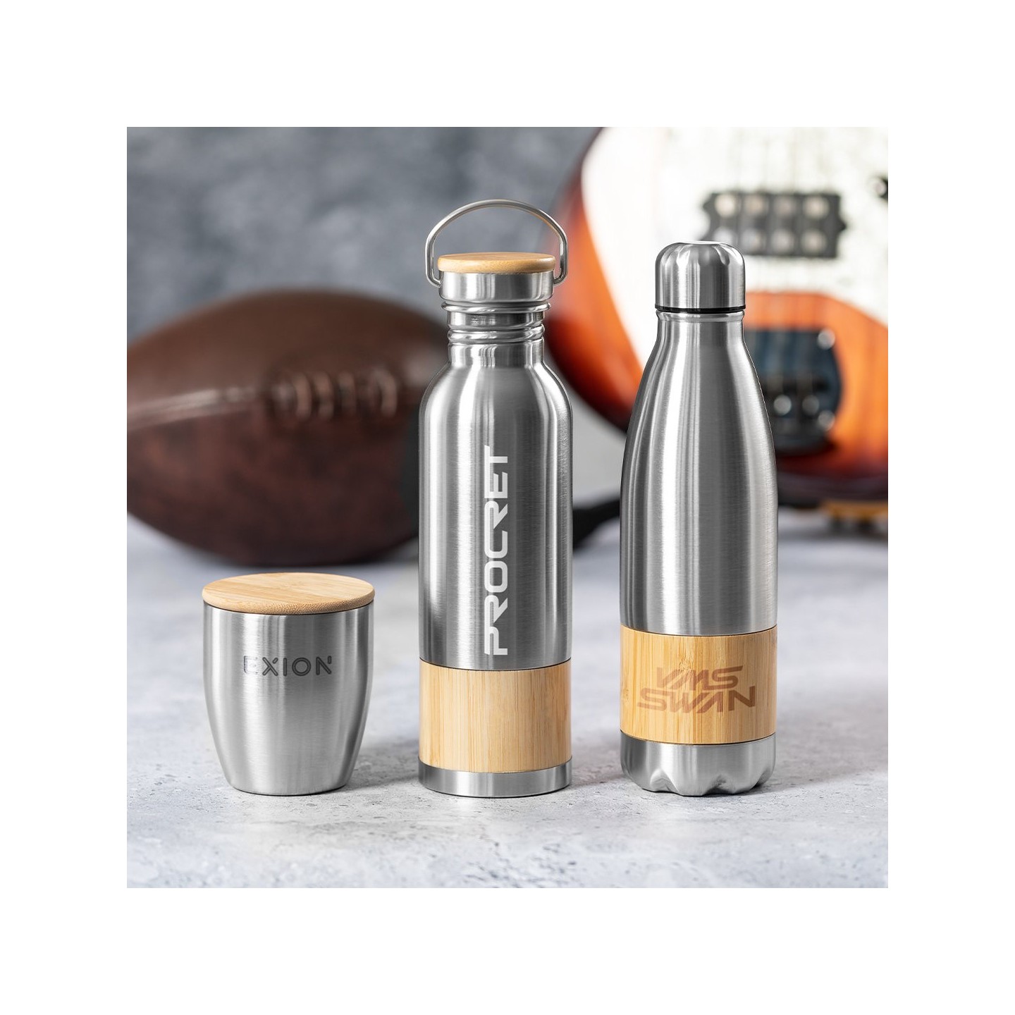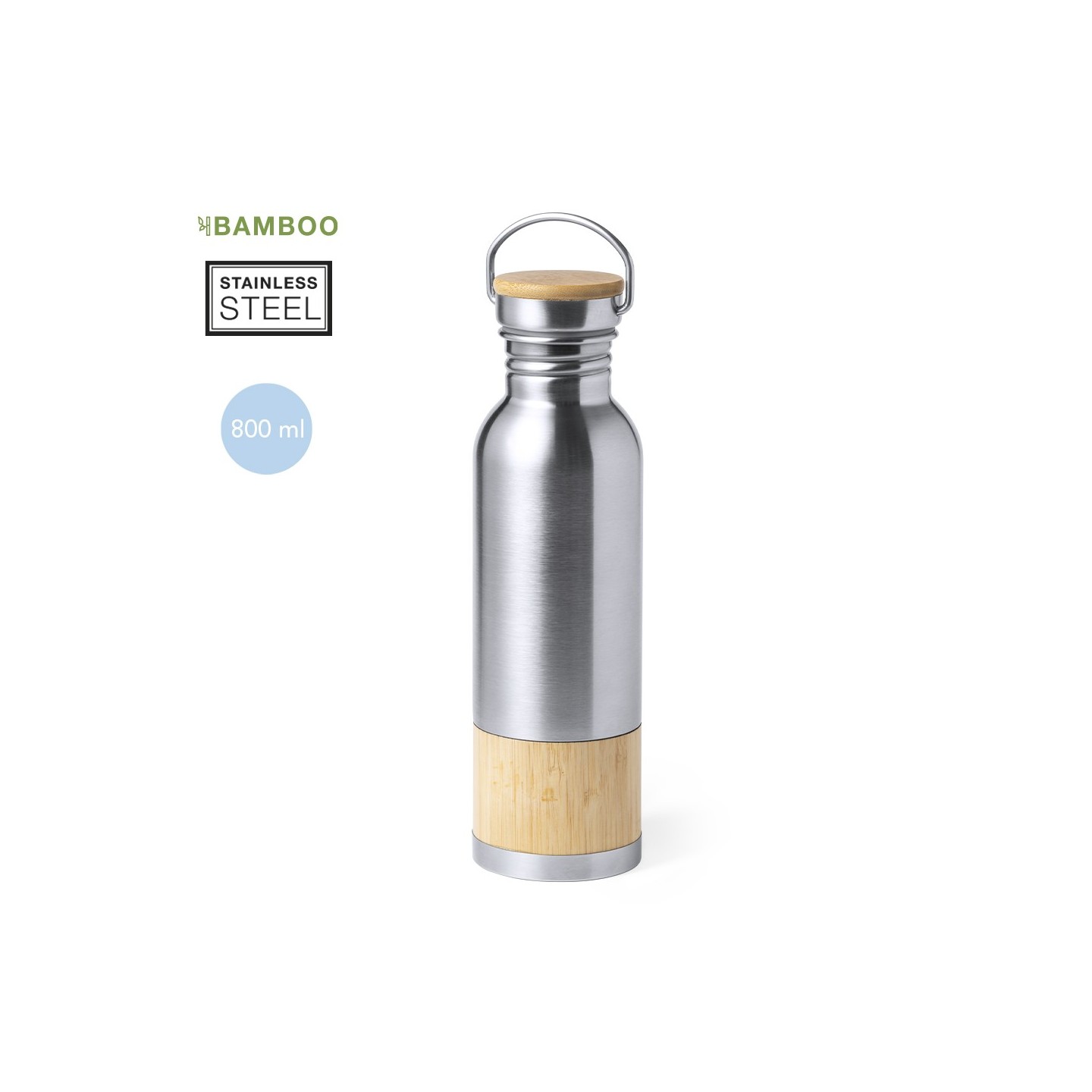 El cuerpo del bidón está fabricado en acero inoxidable de alta calidad, que garantiza su durabilidad y resistencia. Además, cuenta con una elegante franja de bambú que le da un toque único y distintivo.