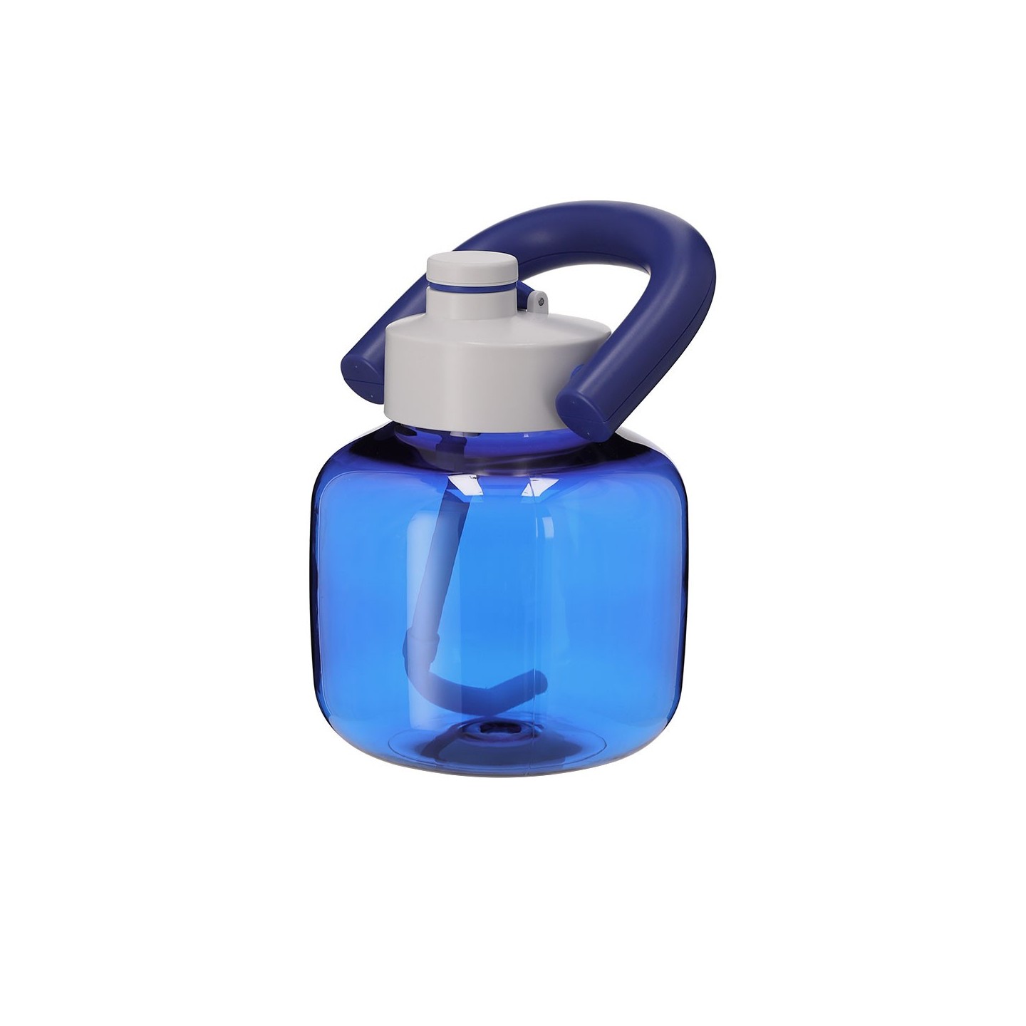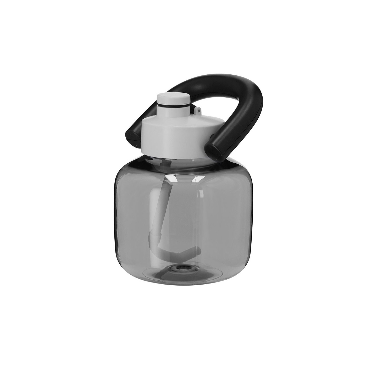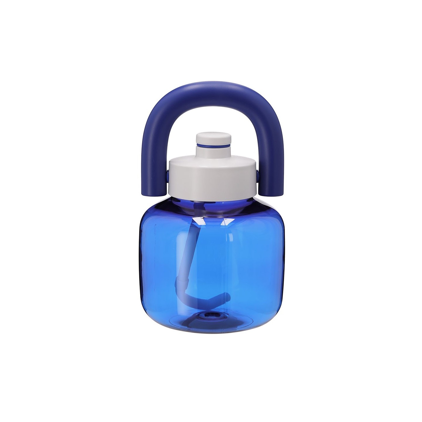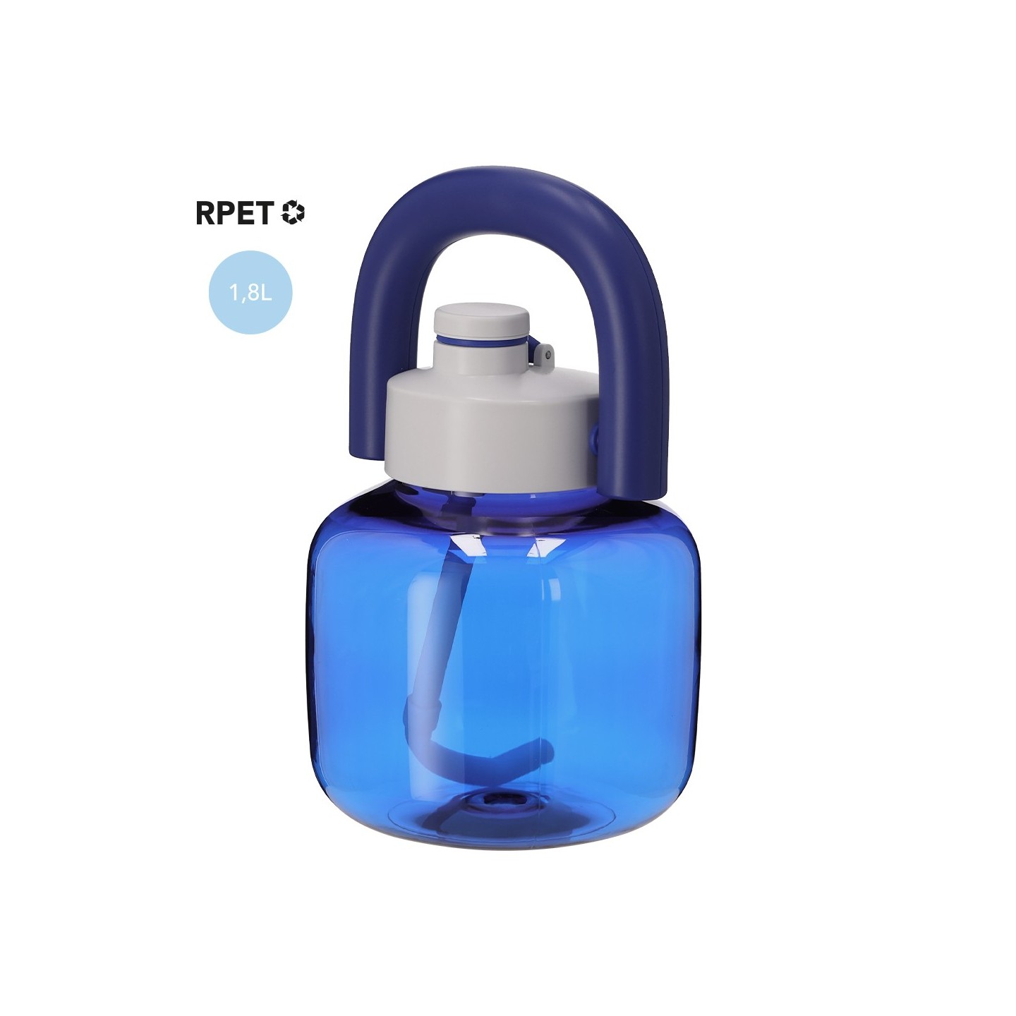 Bidón HEIZA de 1,8 L fabricado en RPET con forma de kettlebell, incluye cierre a rosca, pajita y asa. Ideal para personalizar y fomentar la sostenibilidad.
