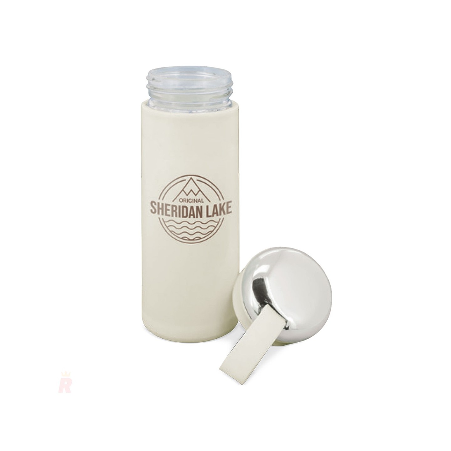 Bidón eco-friendly de 350 ml, fabricado en cristal y polipropileno reciclado con asa de transporte a juego. Personalizable con logotipo. Disponible en 5 colores.