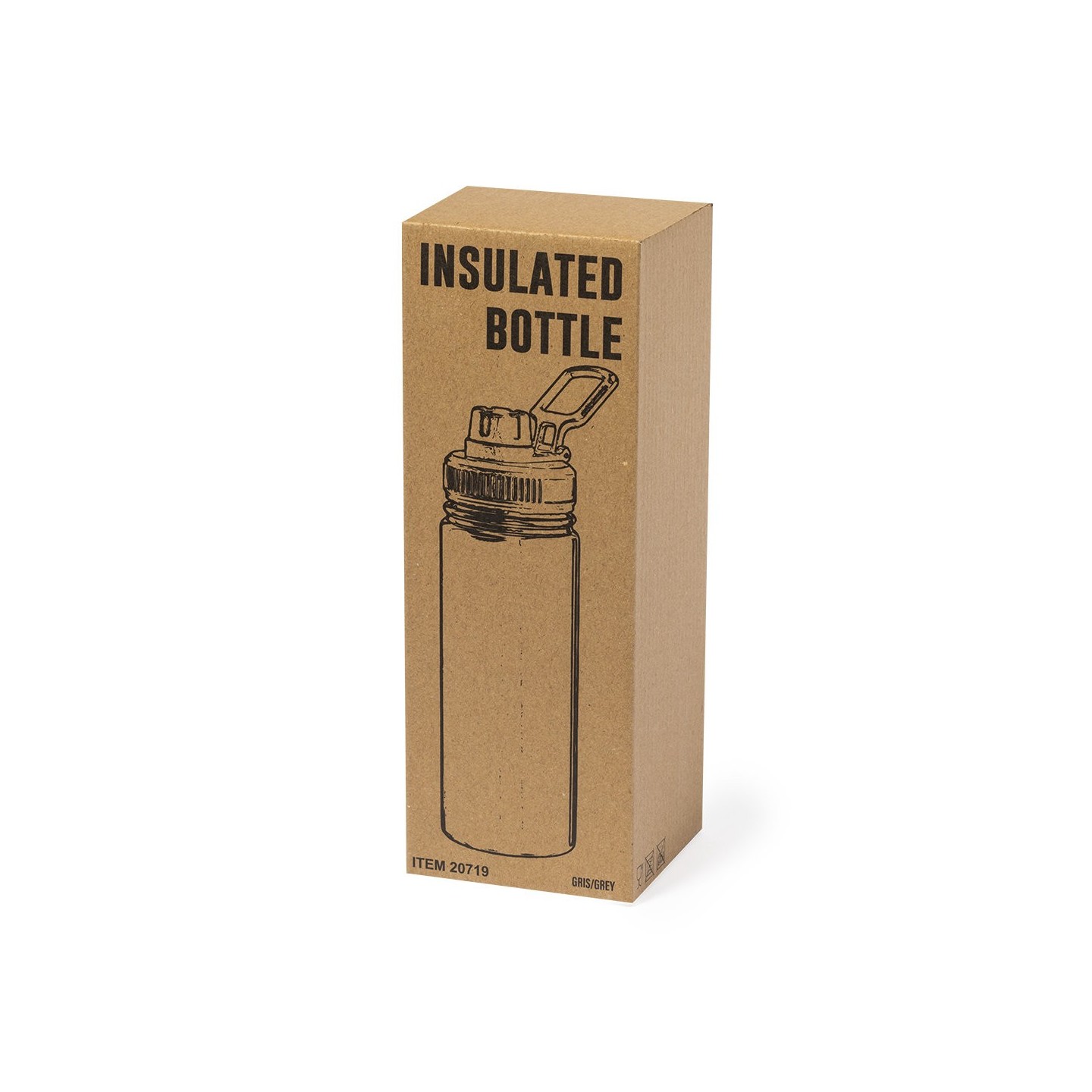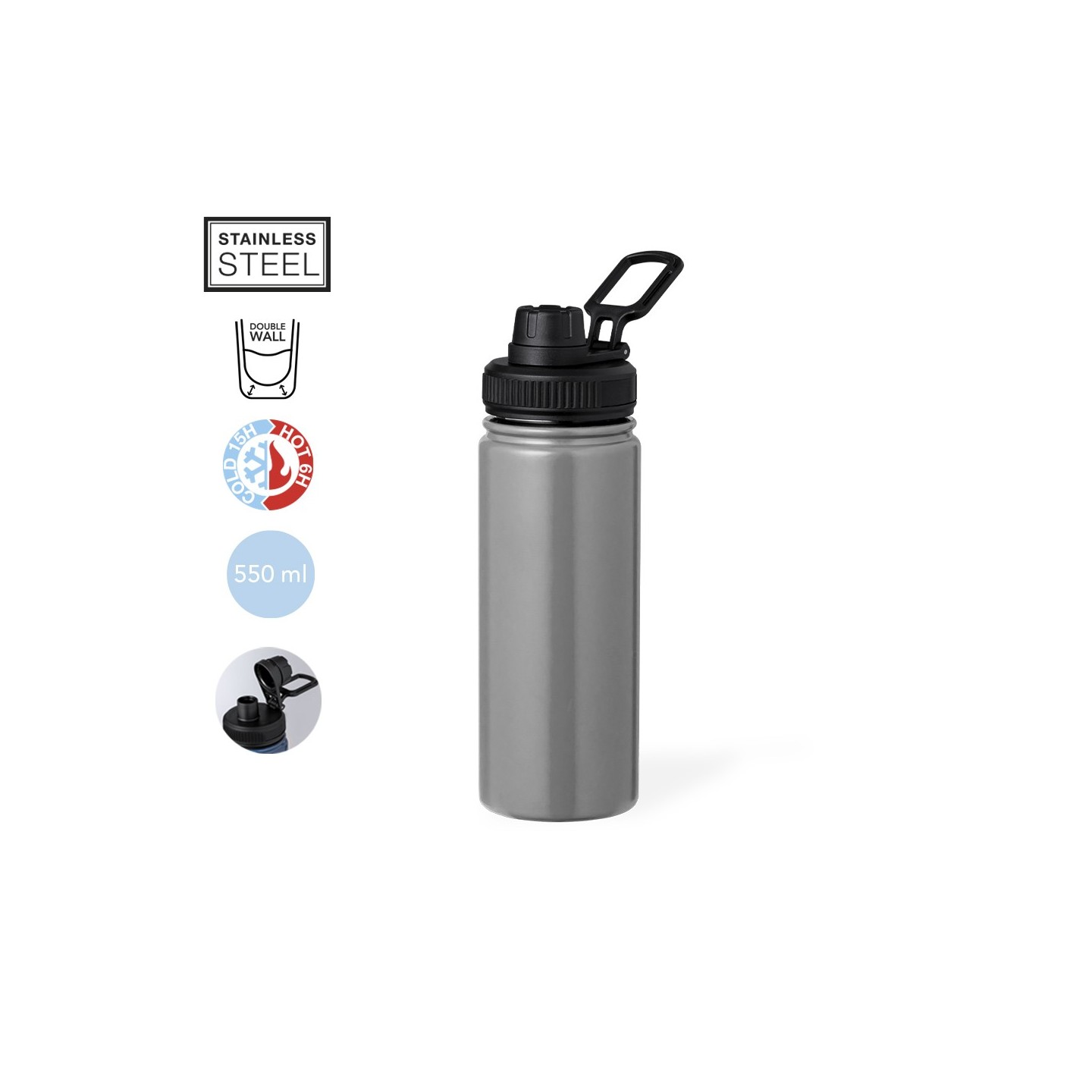 El Bidón térmico Corvac es de acero inoxidable, 550ml. Tapa a rosca, asa ajustable. Personalizable. Presentado en caja kraft.