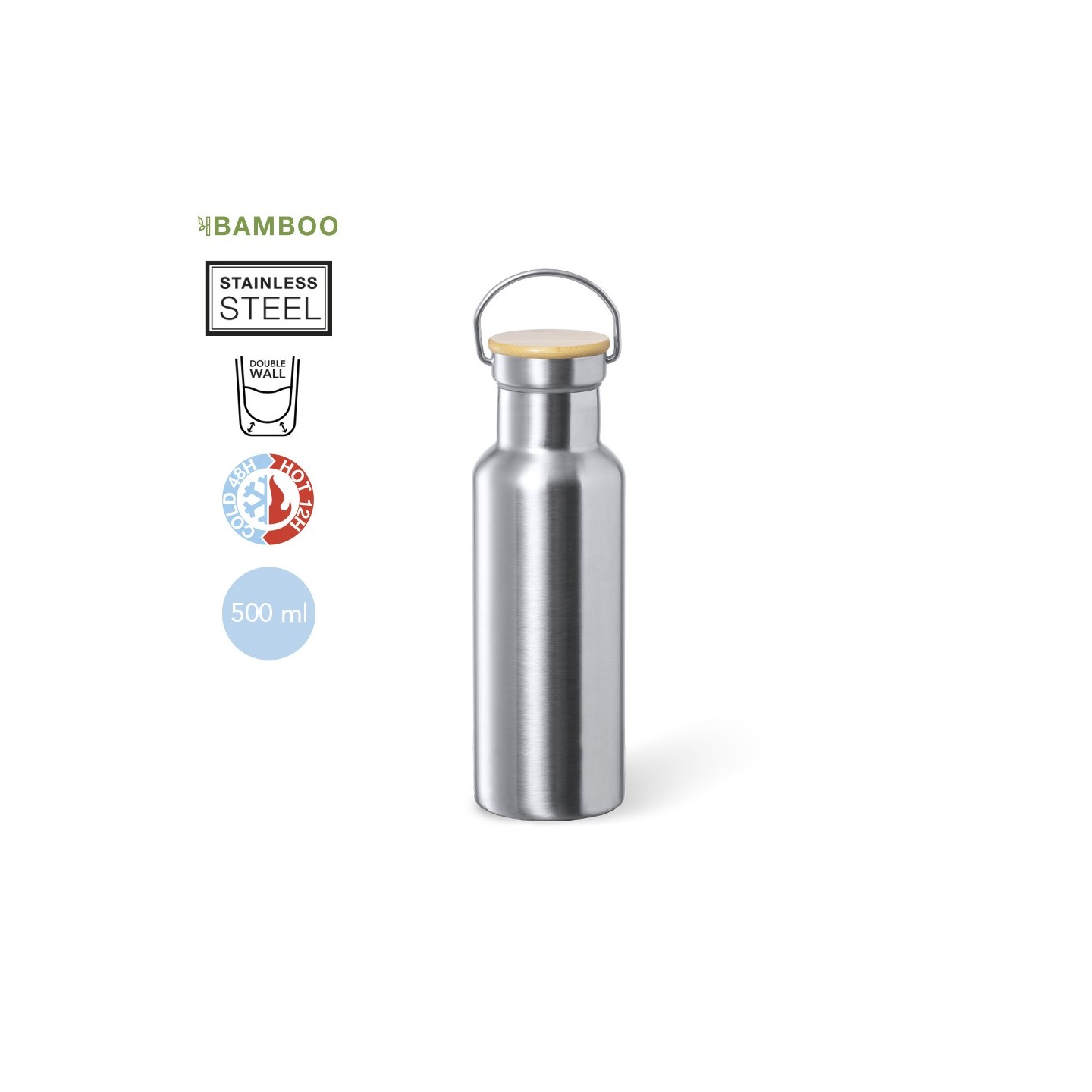 El bidón térmico Duky es de acero inoxidable, 500 ml de capacidad, tapón de bambú, libre de BPA. Mantén tus bebidas calientes o frías por más tiempo.