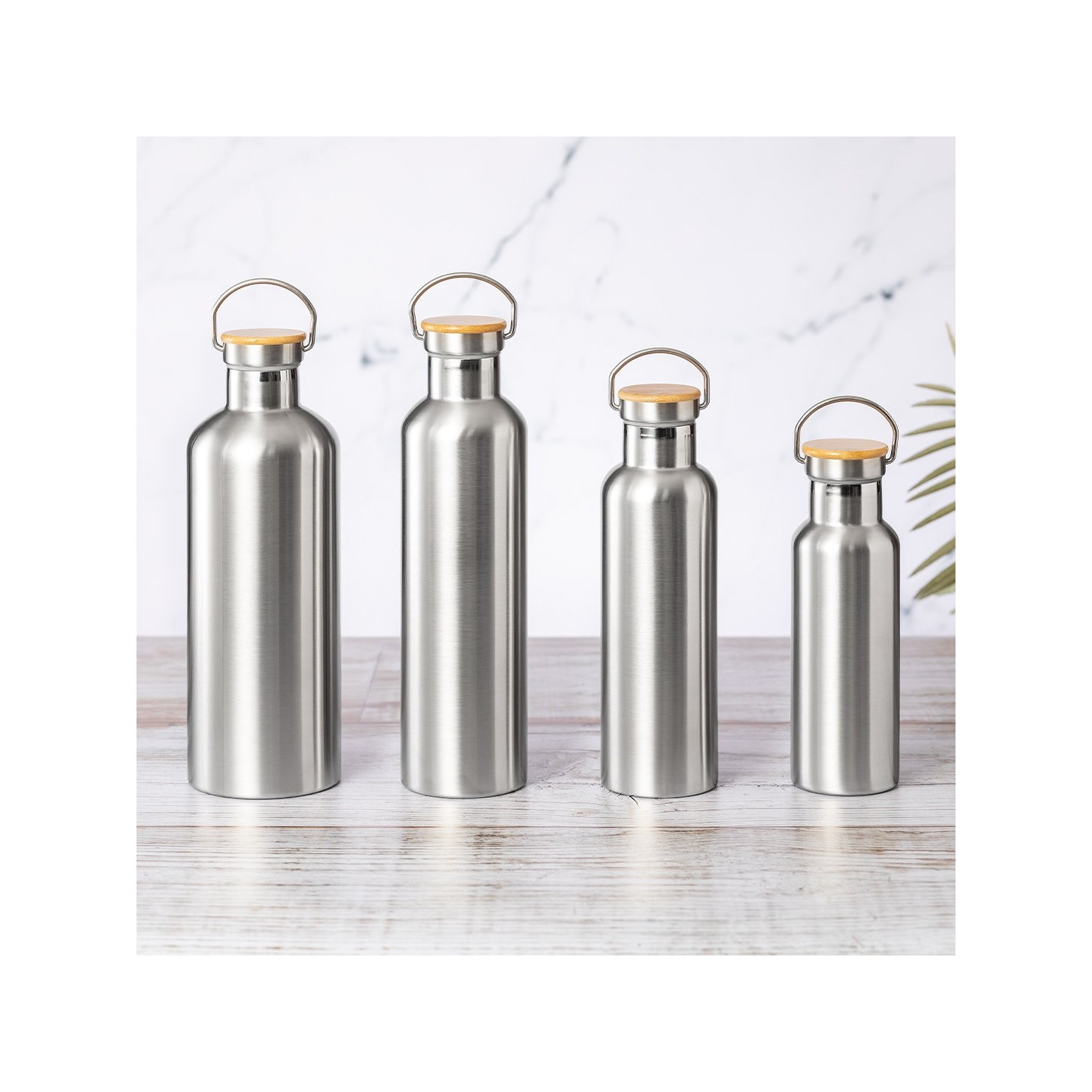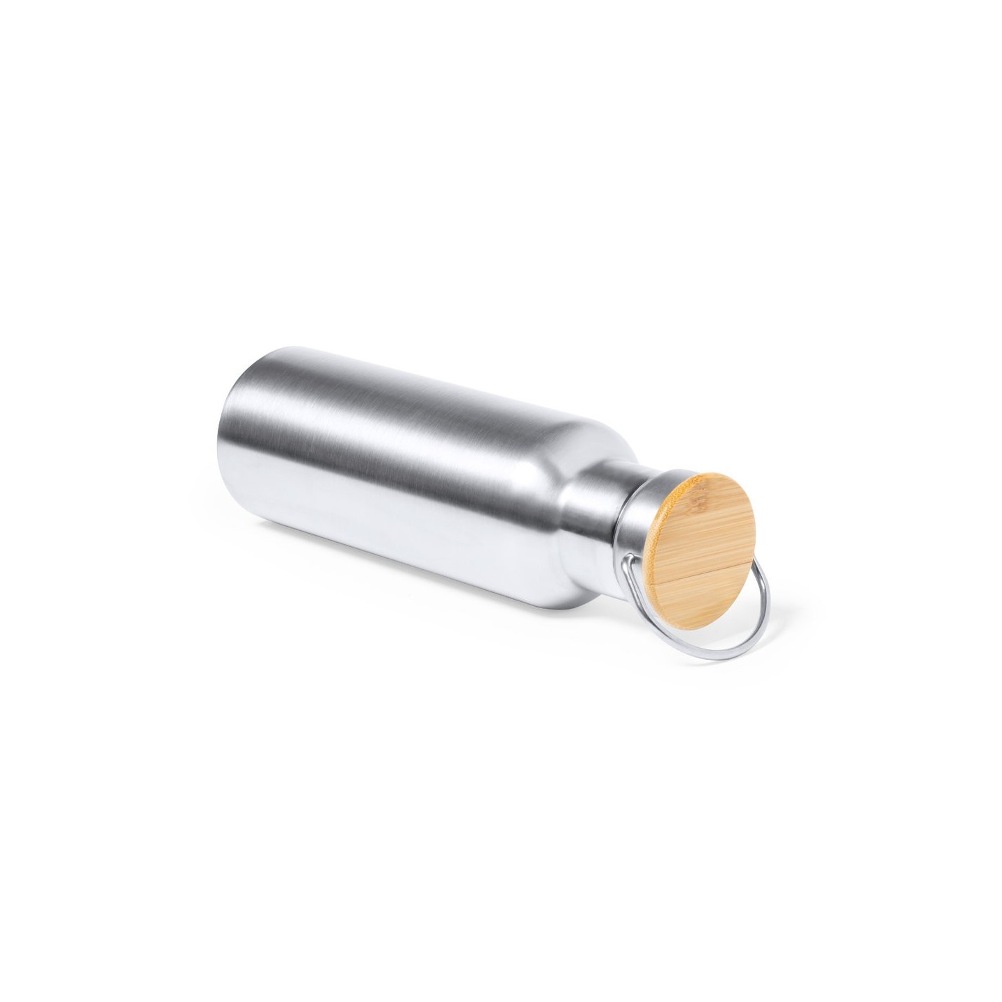 El acabado mate le da un aspecto elegante y moderno, mientras que el original tapón a rosca en acero inoxidable, con detalle de bambú y asa integrada, añade practicidad y estilo al diseño.