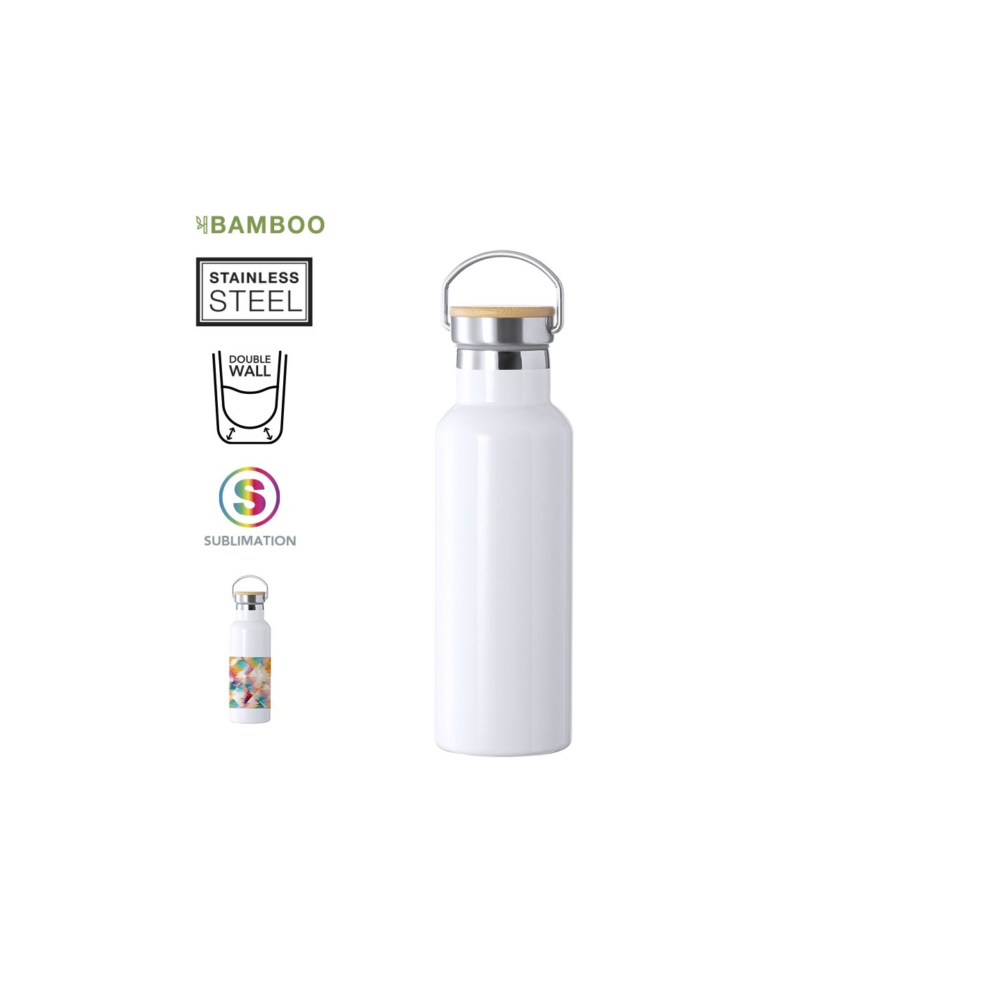 Bidón térmico de acero inoxidable de 500 ml, ideal para sublimación. Diseño elegante en blanco con tapón a rosca de acero inoxidable y detalle de bambú. Libre de BPA, presentado en caja kraft.