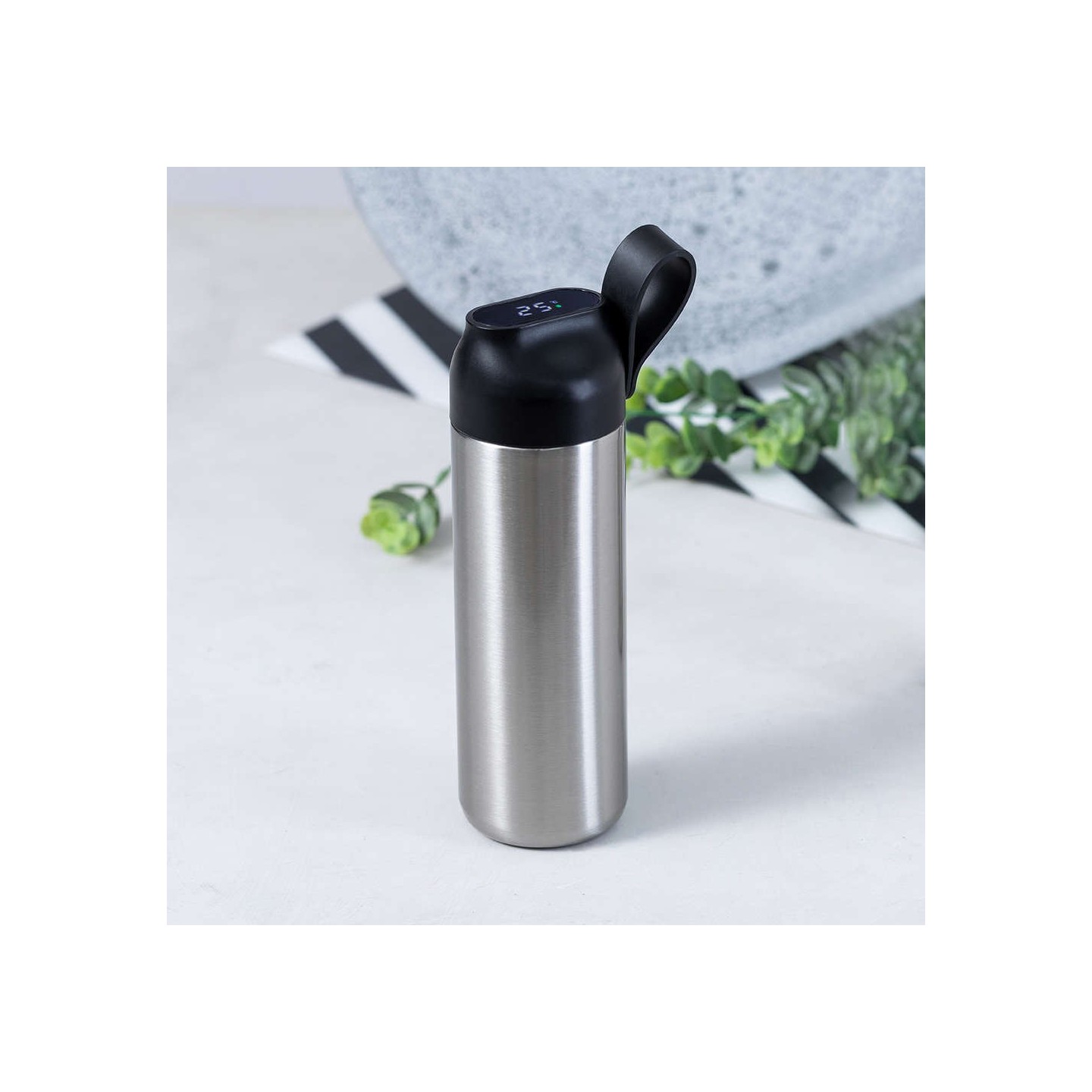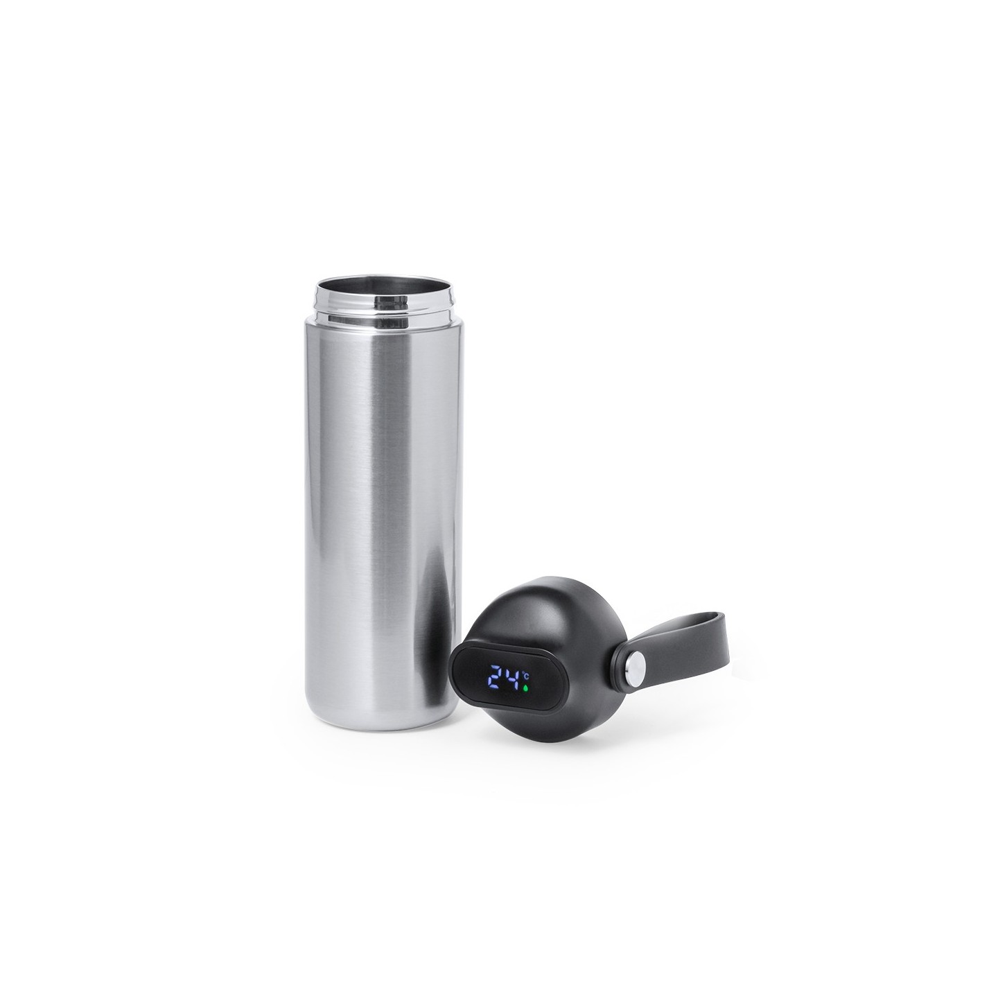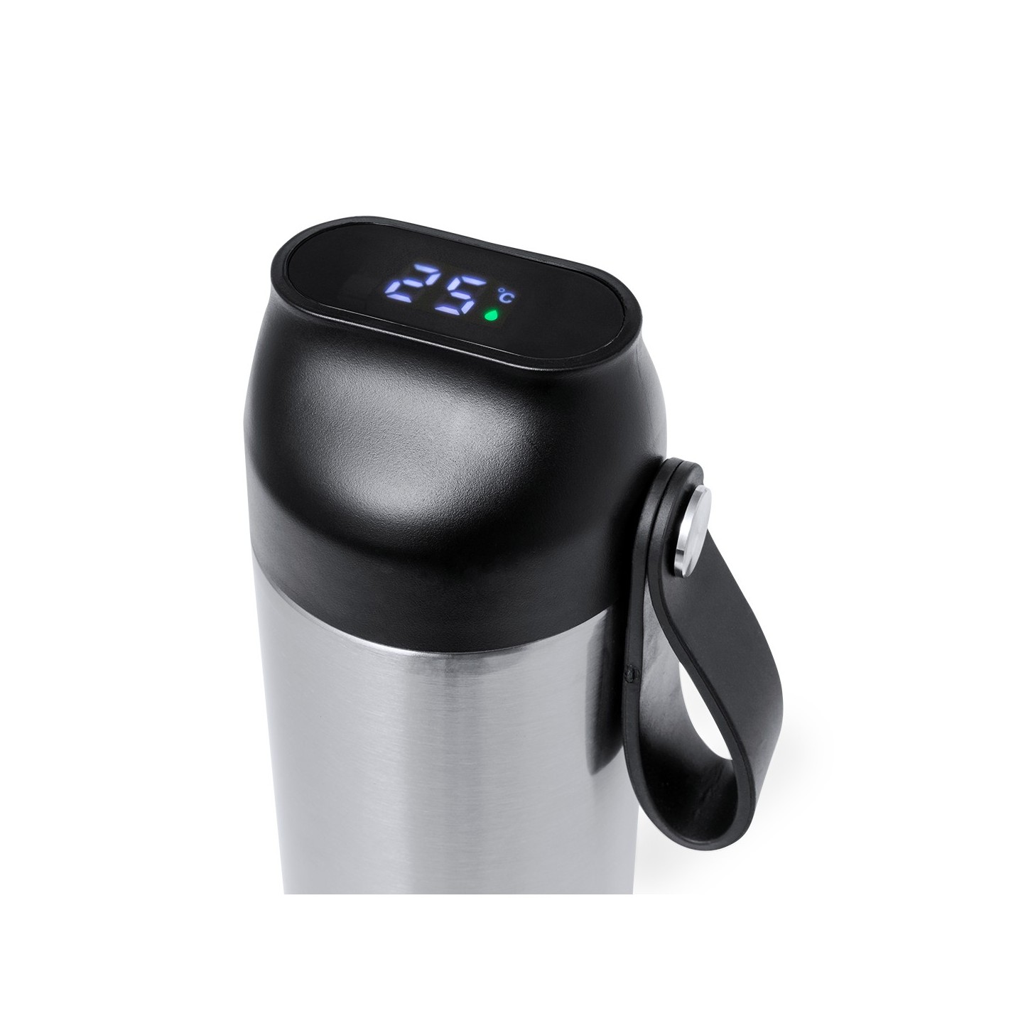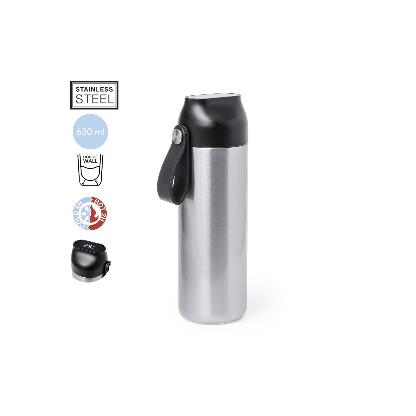 El Bidón Térmico Troy es de 630 ml, acero inoxidable, asa integrada, tapón con medidor de temperatura táctil. Ideal para llevar tus bebidas.