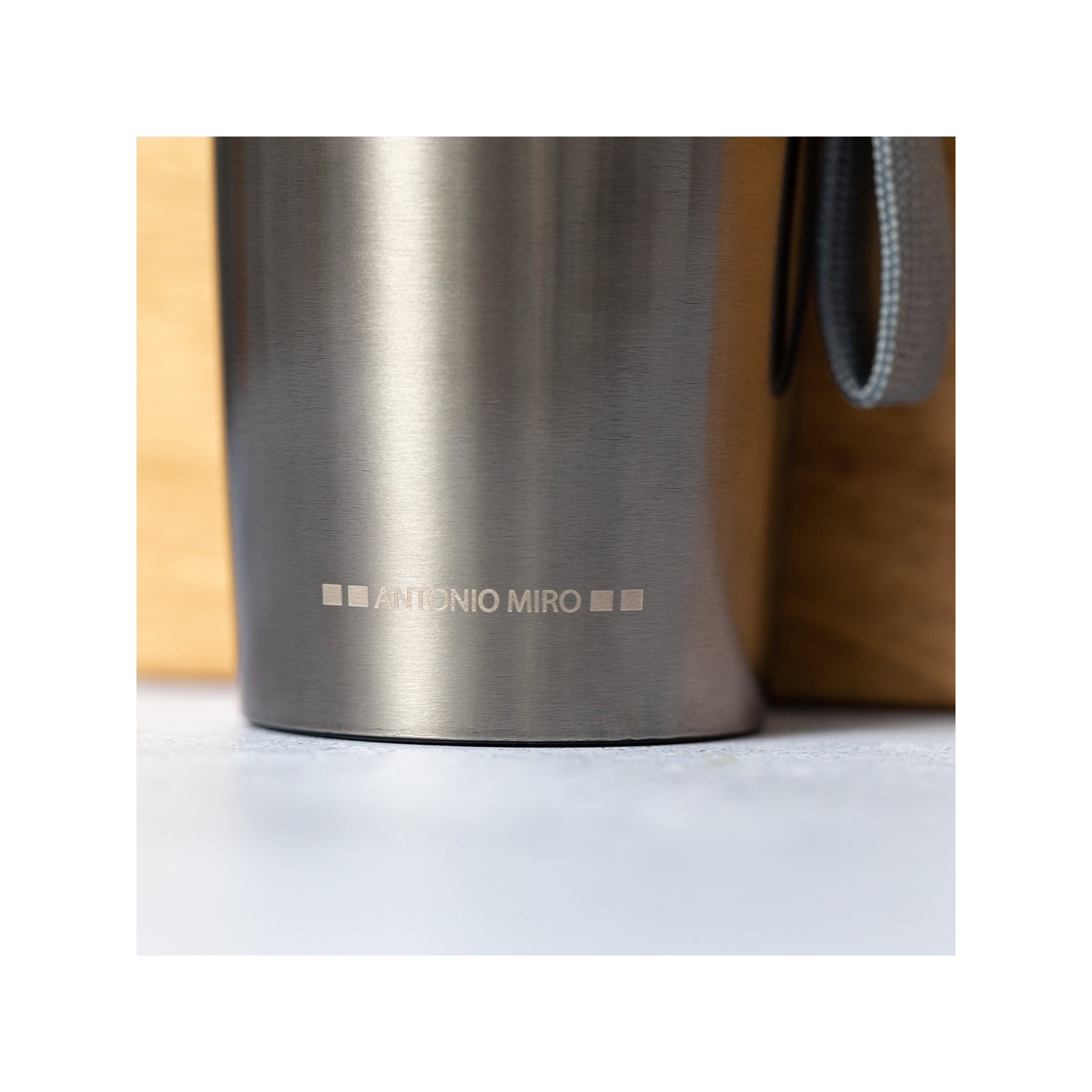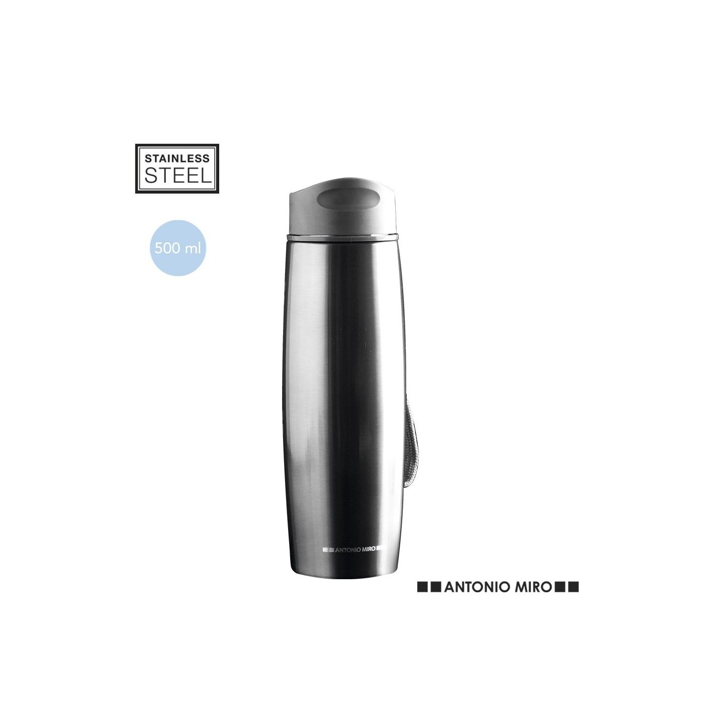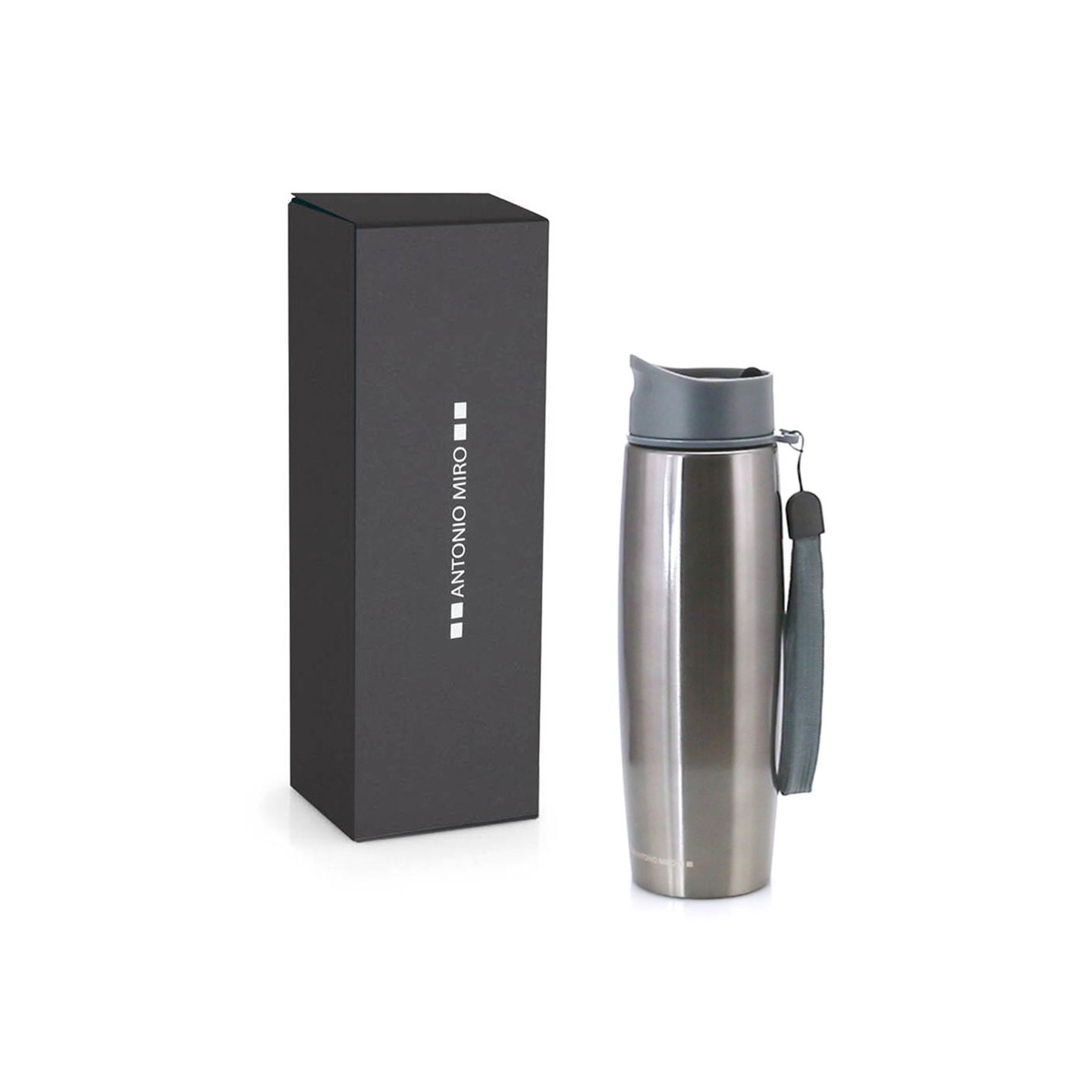 El Bidón Termo Kabol de Antonio Miró es de acero inoxidable, 500ml de capacidad, diseño elegante con cuerpo metalizado y accesorios en colores sobrios. Tapa dosificadora de seguridad. Presentado en caja con logotipo.