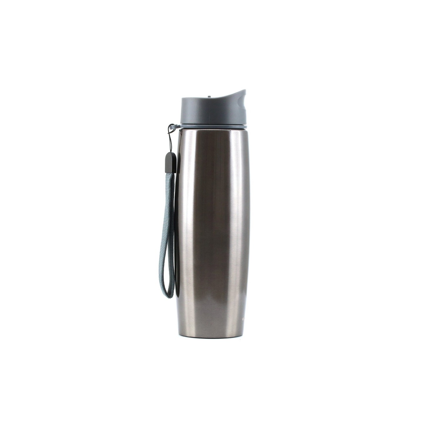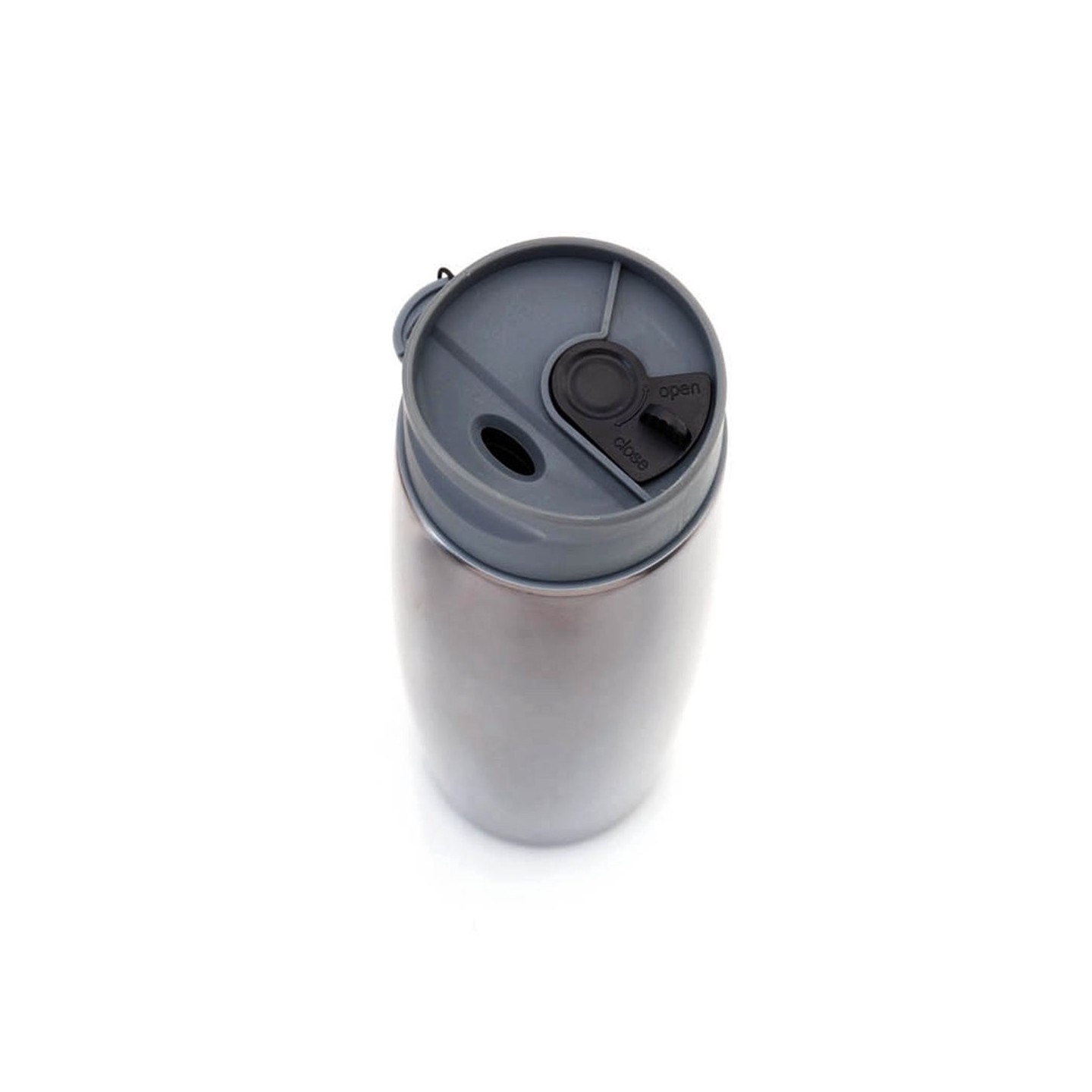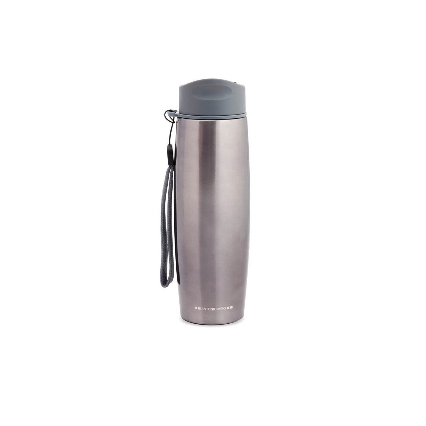 El Bidón Termo Kabol de Antonio Miró es de acero inoxidable, 500ml de capacidad, diseño elegante con cuerpo metalizado y accesorios en colores sobrios. Tapa dosificadora de seguridad. Presentado en caja con logotipo.