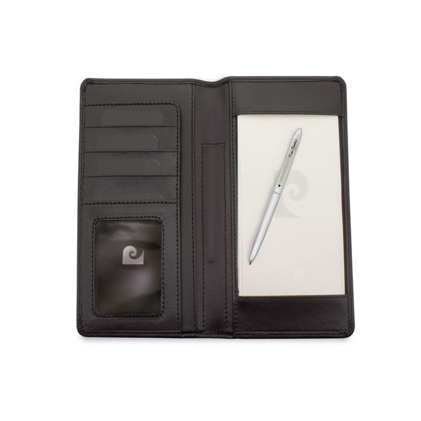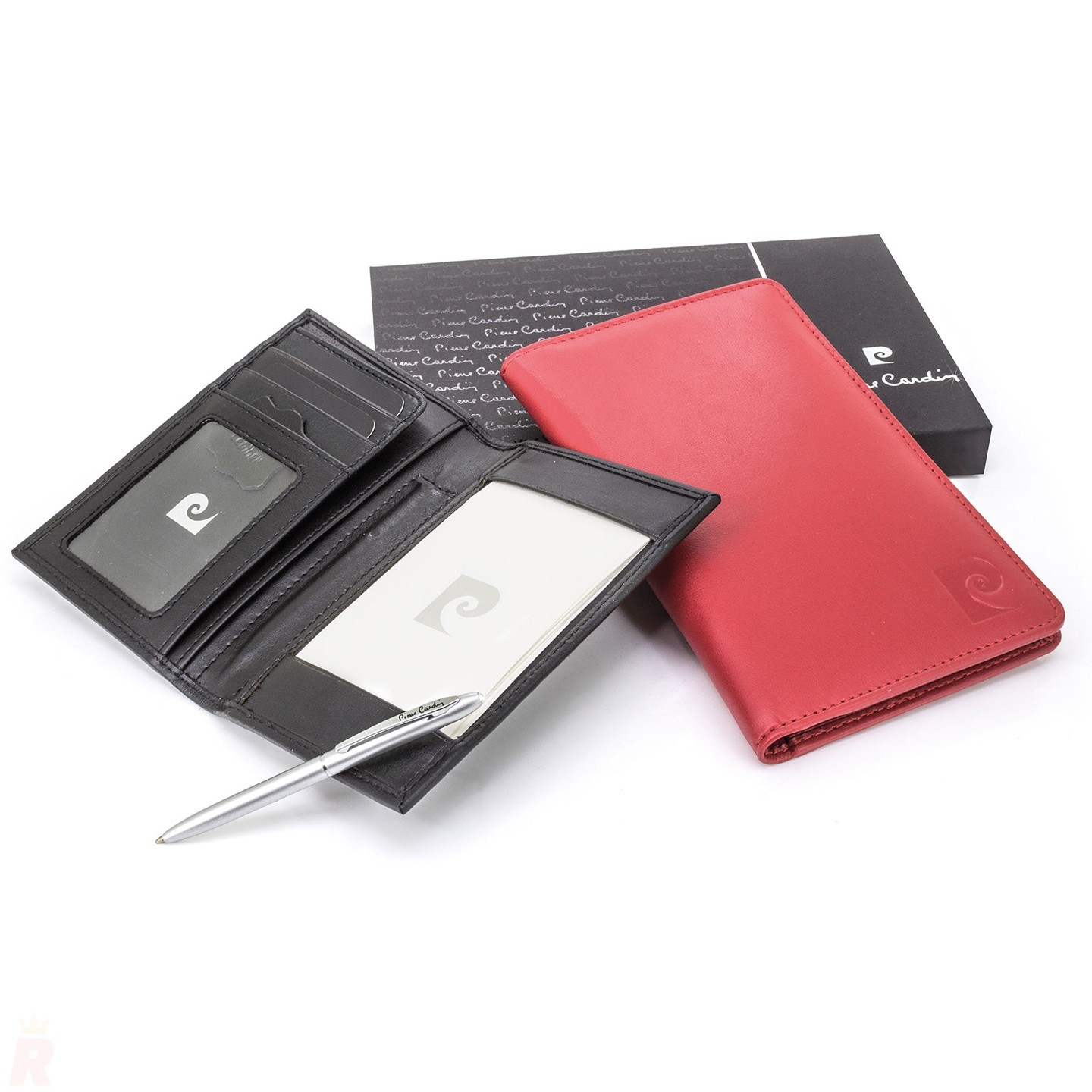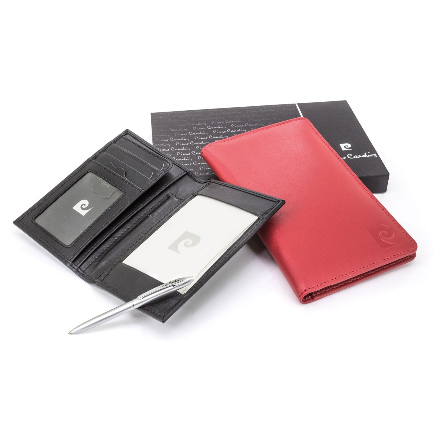 Elegante portatarjetas de piel natural Pierre Cardin con billetera, 4 ranuras para tarjetas, espacio para móvil, bloc de notas y bolígrafo. Presentado en estuche de luj