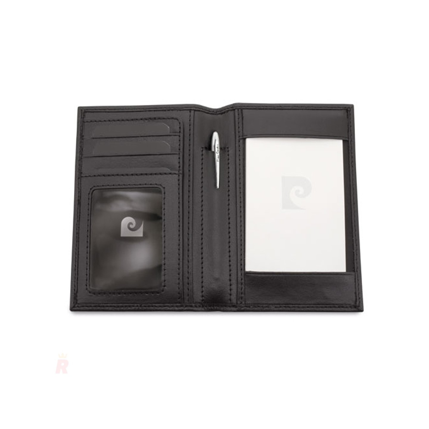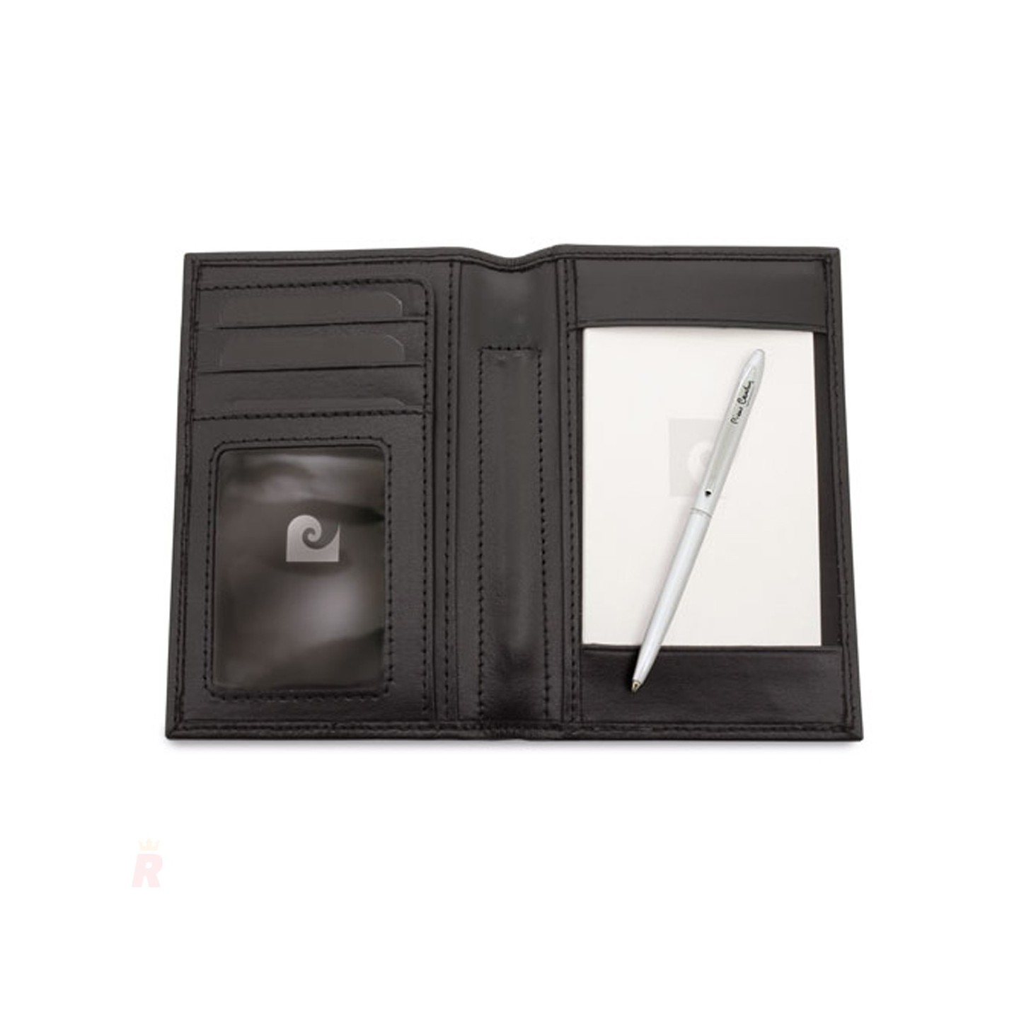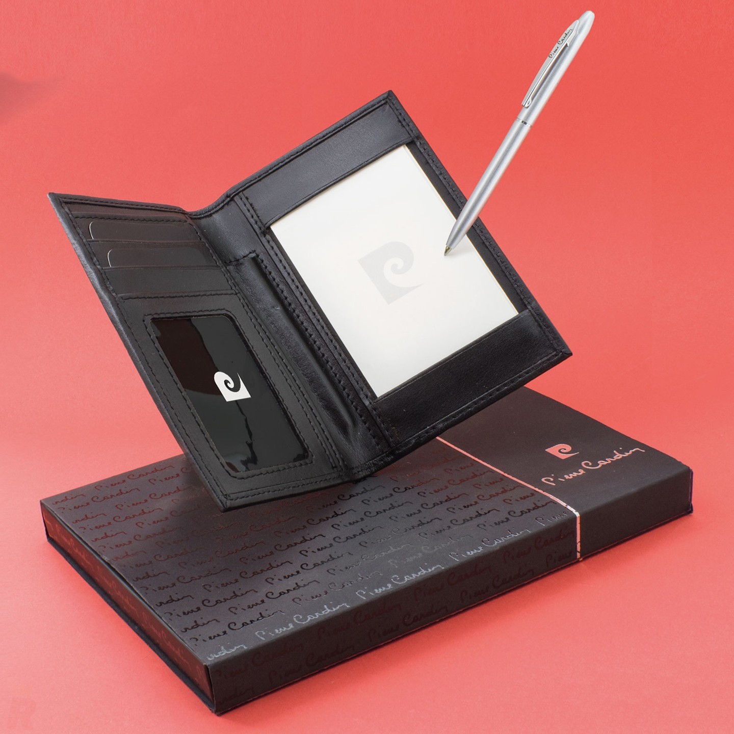 Exclusivo portatarjetas de piel natural Pierre Cardin con ranuras para tarjetas y documentos. Incluye bloc y bolígrafo elegante, presentado en un estuche de lujo. Ideal para regalos corporativos.