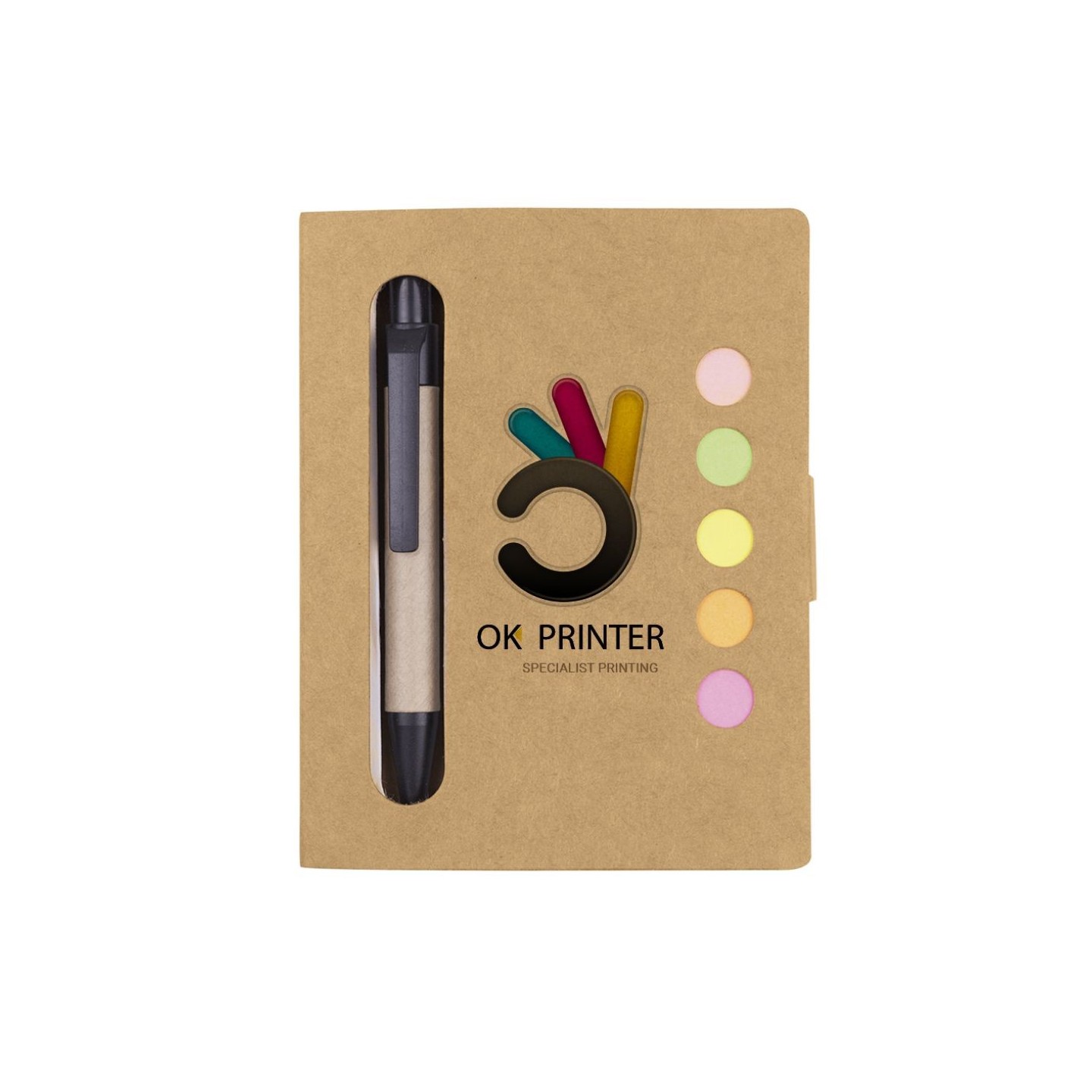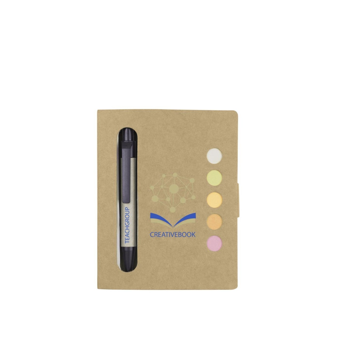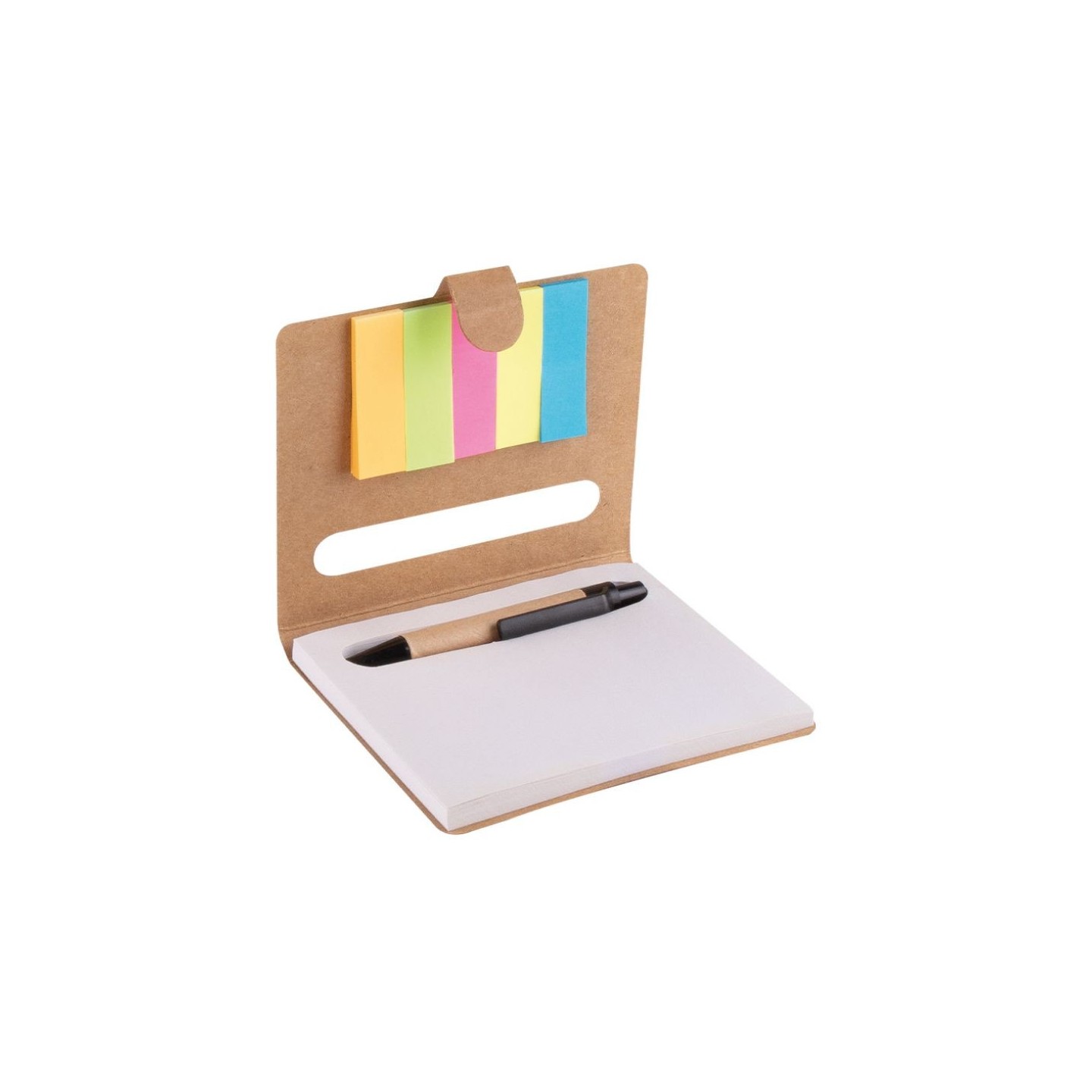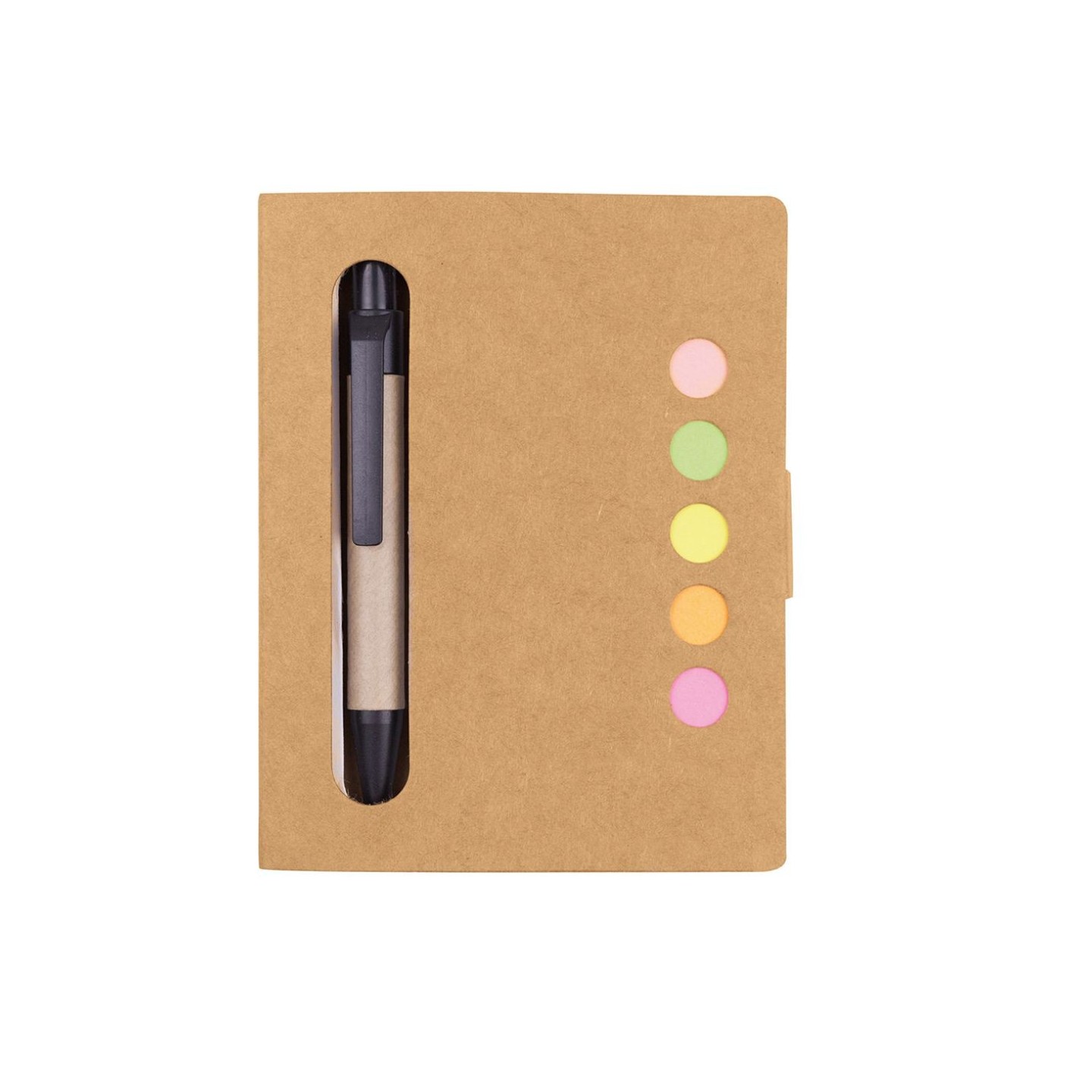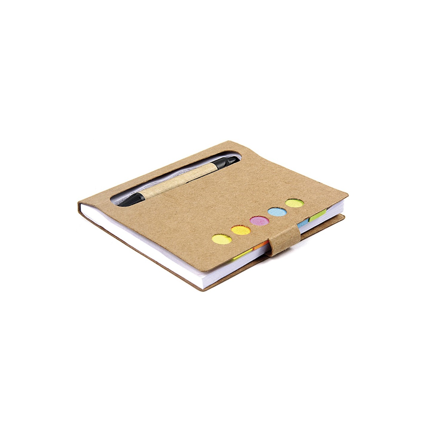 El Bloc de Notas Note es una libreta ecológica en cartón reciclado con 50 páginas y notas adhesivas en colores, acompañada por un bolígrafo. Ideal para regalos corporativos.