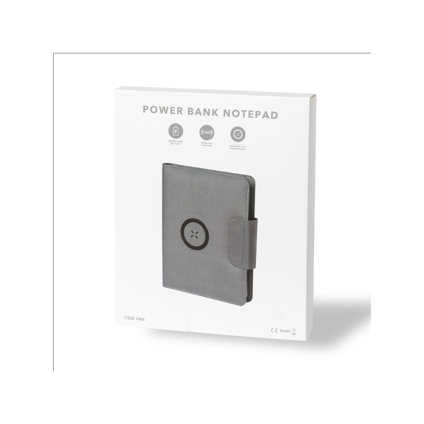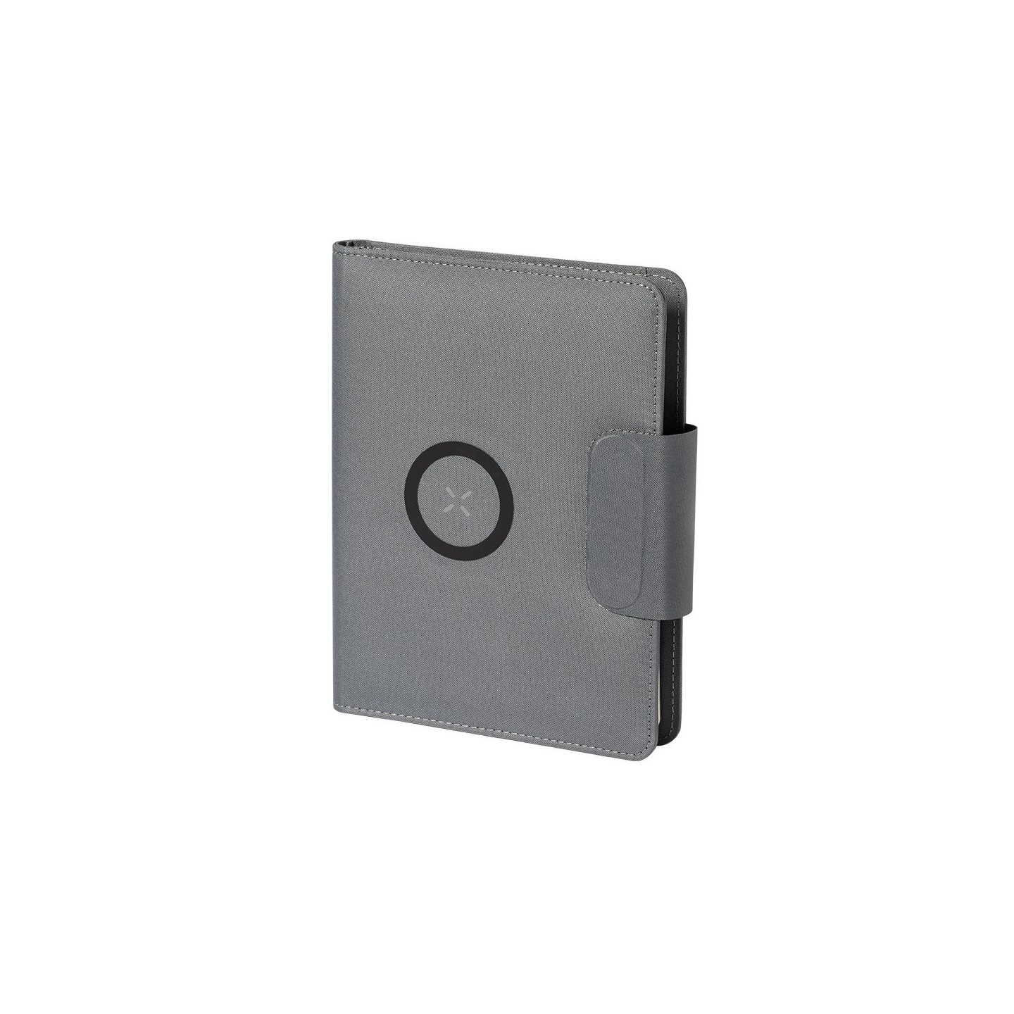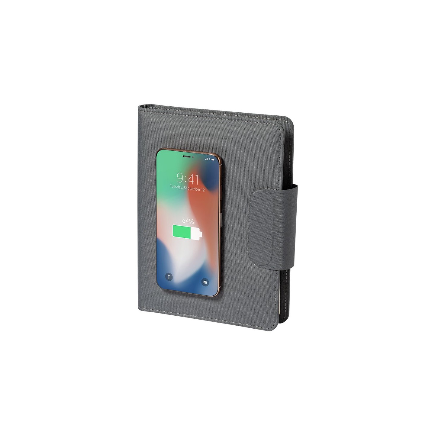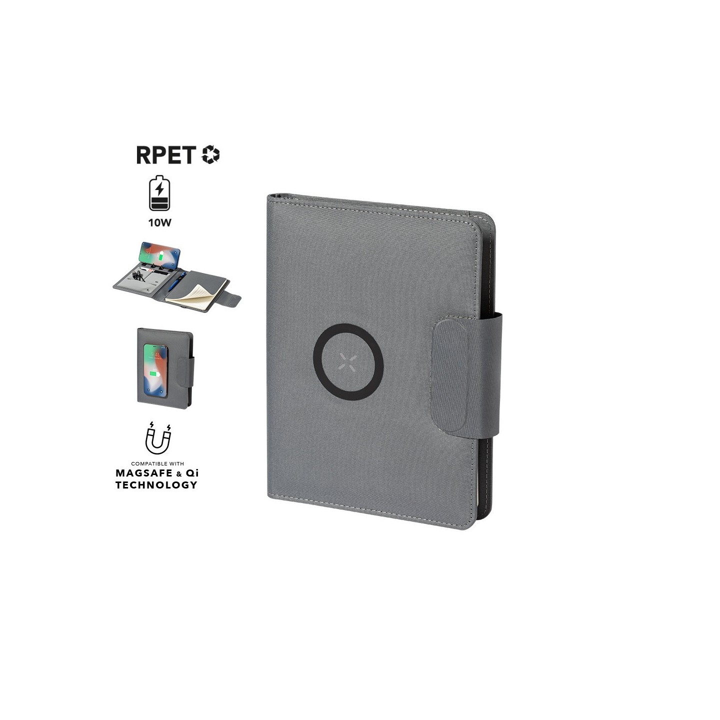 Con cierre magnético y etiqueta interior con distintivo RPET. Incluye cargador inalámbrico 10W integrado en portada, con fijación magnética para poder usar el dispositivo mientras se produce la carga del mismo e incluyendo anillo adhesivo, válido para todos los dispositivos con tecnología Magsafe y Qi.