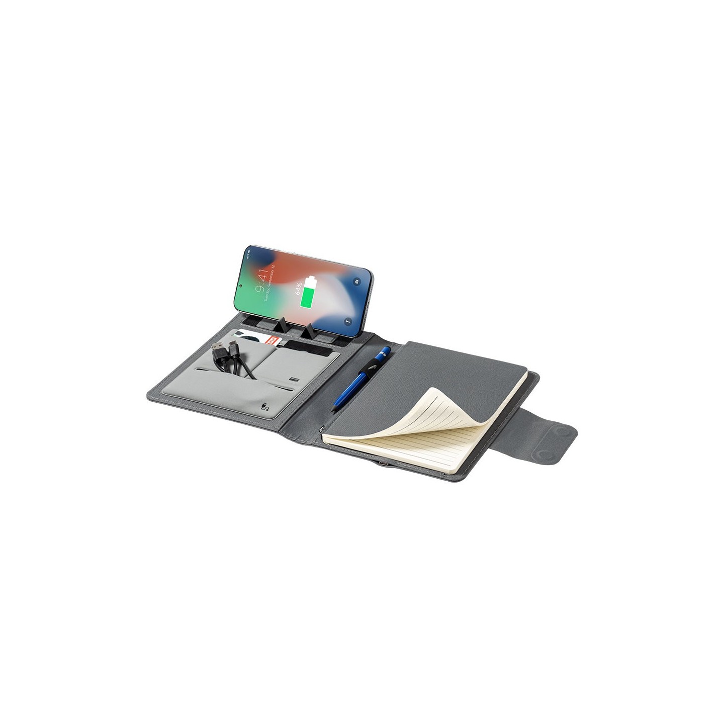 El bloc multifunción Dambier es una carpeta/bloc con cargador inalámbrico, compartimentos para tarjetas y soporte para smartphone. Sostenible y práctico.