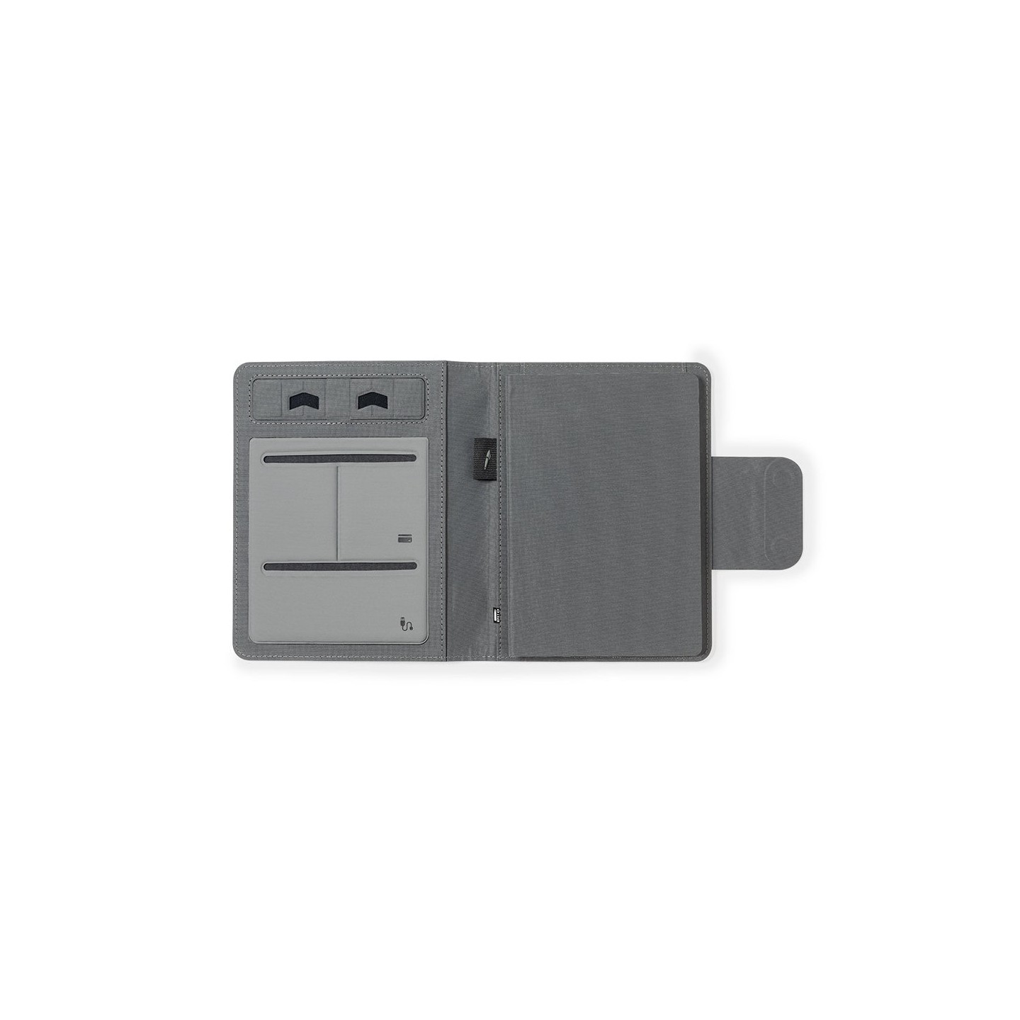 Batería integrada de 5.000 mAh de capacidad de carga, con puerto Tipo C de entrada/salida y LEDs indicadores de estado de carga, con cable incluido. Interior con soporte para smartphone y multitud de compartimentos para tarjetas, incluidos soporte para bolígrafo y bloc A5 con 65 hojas de disposición a una raya.