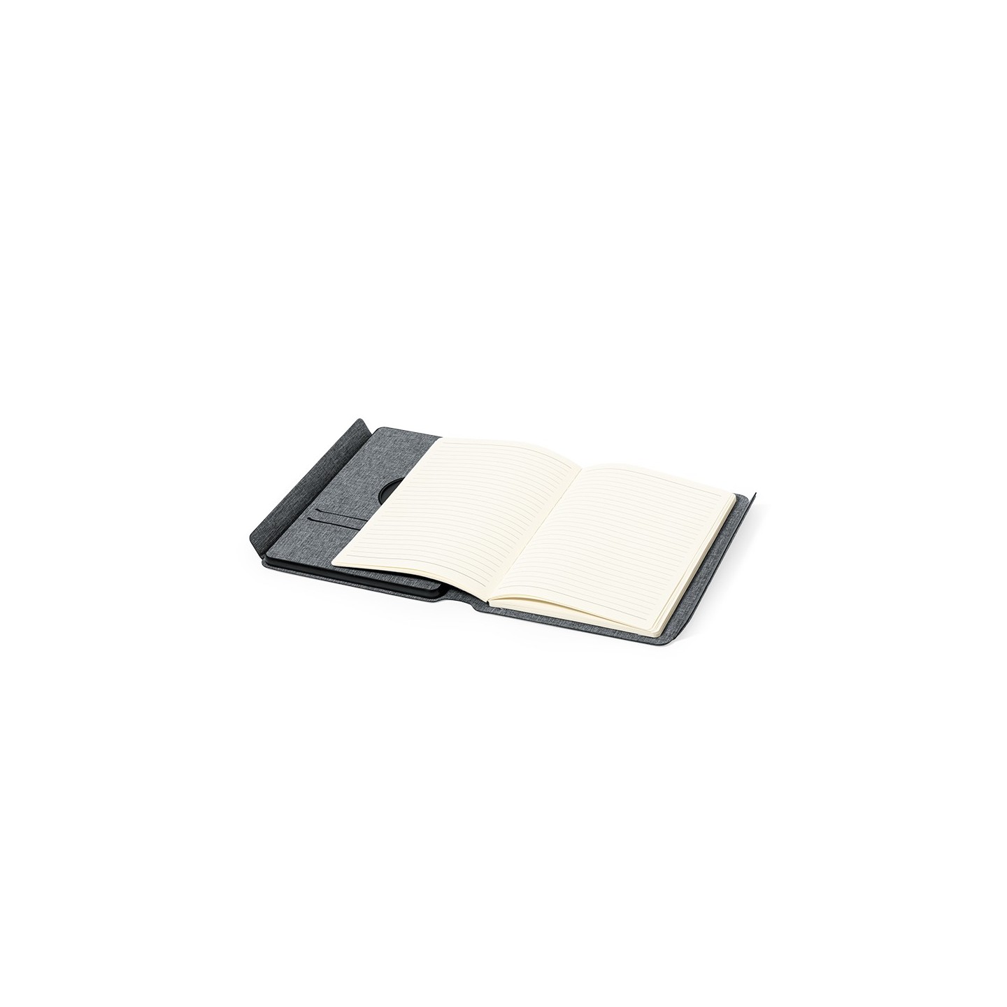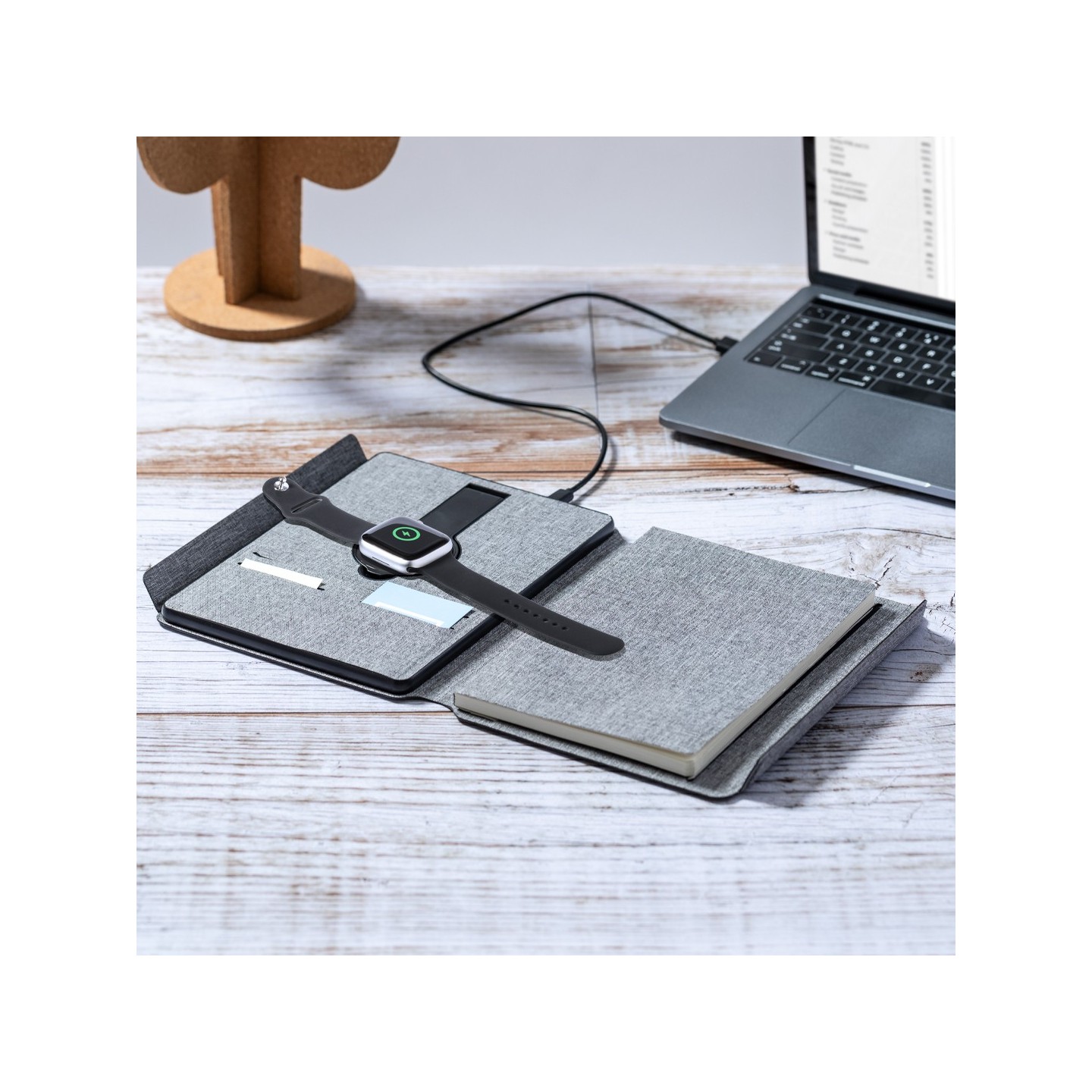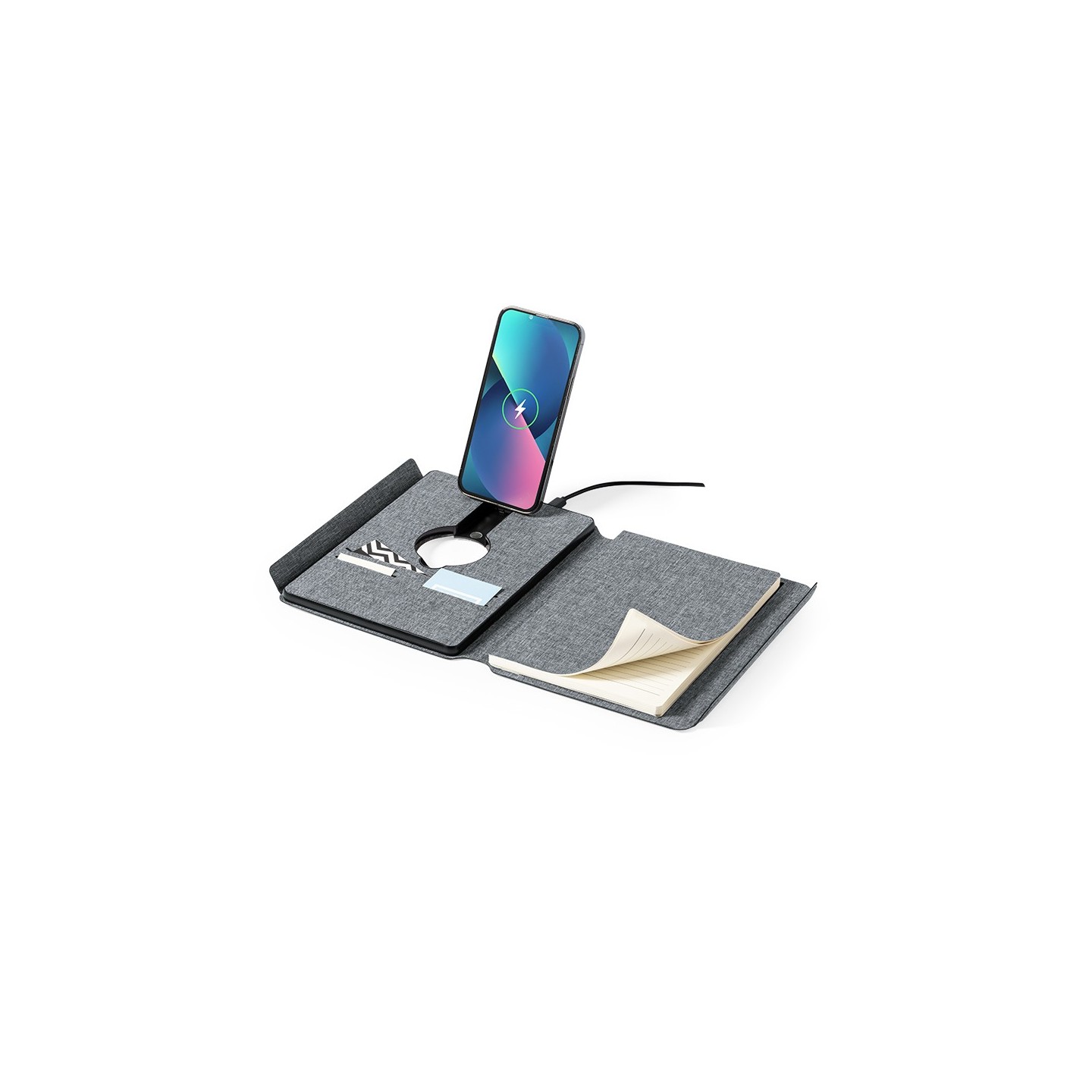 En su contraportada interior, posee un cargador inalámbrico destinado a smartwatches, agregando una capa adicional de practicidad para cargar múltiples dispositivos. La batería integrada de 5.000 mAh, con puerto Tipo C de entrada/salida y LEDs indicadores de carga, asegura un suministro de energía fiable. La carpeta cuenta con múltiples compartimentos para tarjetas, soporte para bolígrafo y un bloc interior A5 de 64 hojas, con disposición a una raya, facilitando la toma de notas y la organización.
