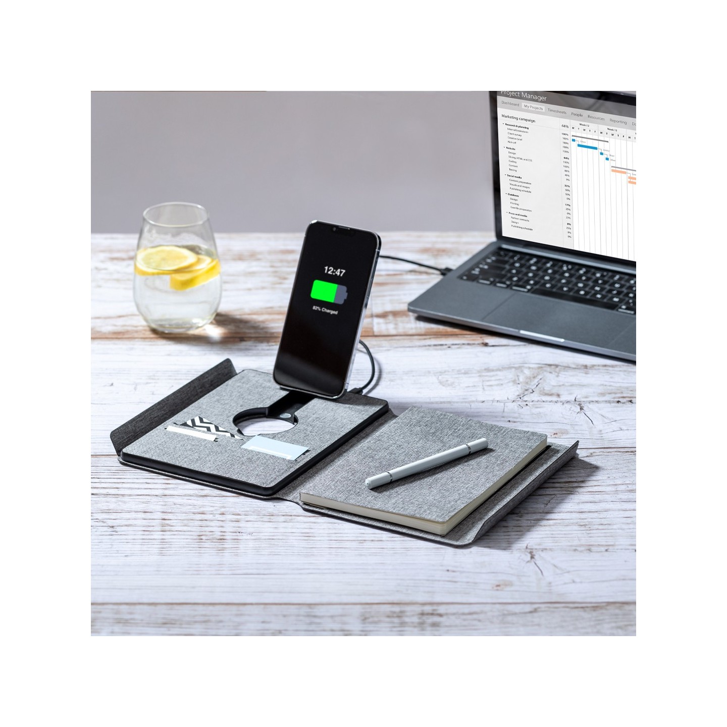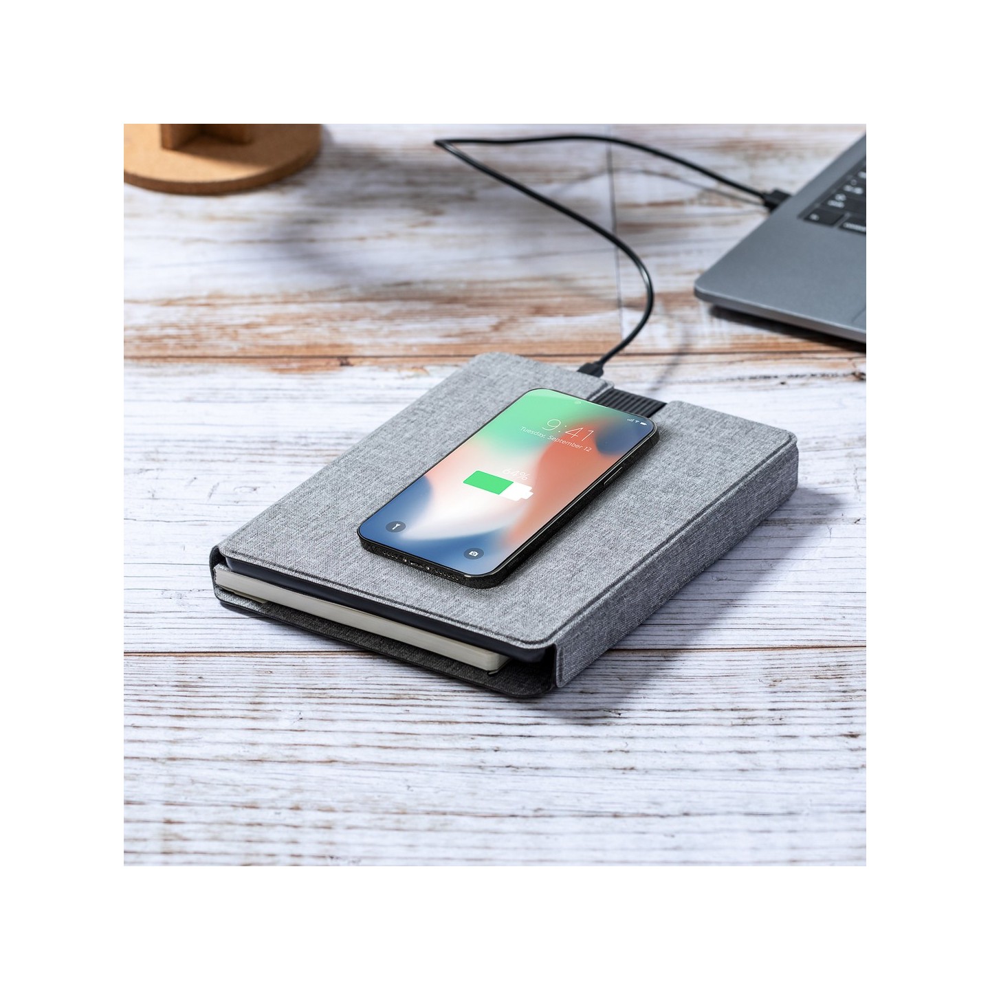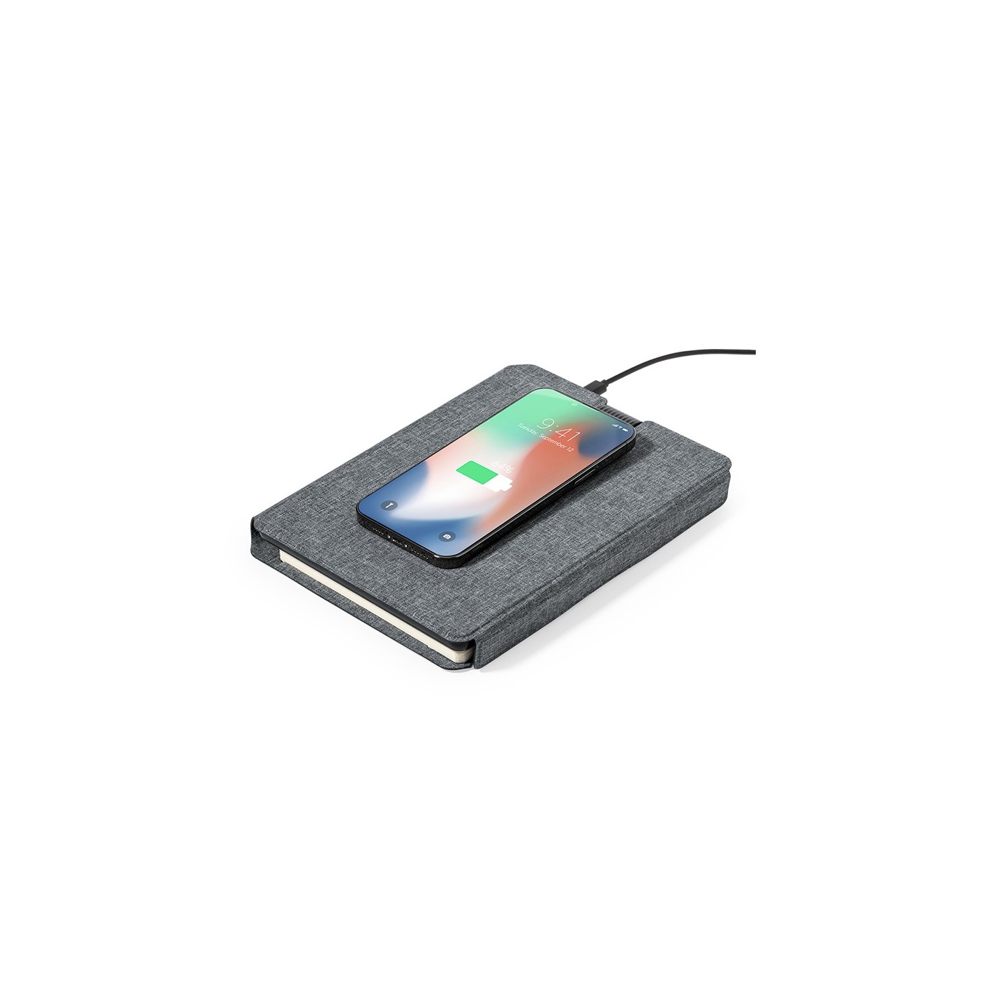 En su contraportada interior, posee un cargador inalámbrico destinado a smartwatches, agregando una capa adicional de practicidad para cargar múltiples dispositivos. La batería integrada de 5.000 mAh, con puerto Tipo C de entrada/salida y LEDs indicadores de carga, asegura un suministro de energía fiable. La carpeta cuenta con múltiples compartimentos para tarjetas, soporte para bolígrafo y un bloc interior A5 de 64 hojas, con disposición a una raya, facilitando la toma de notas y la organización.