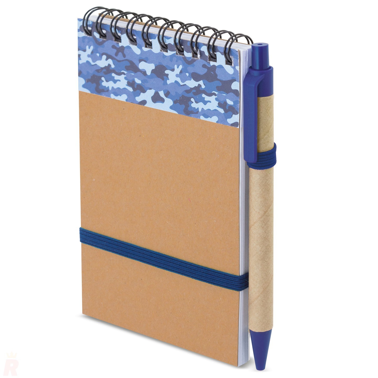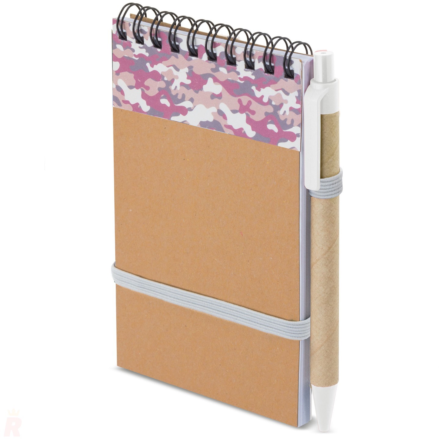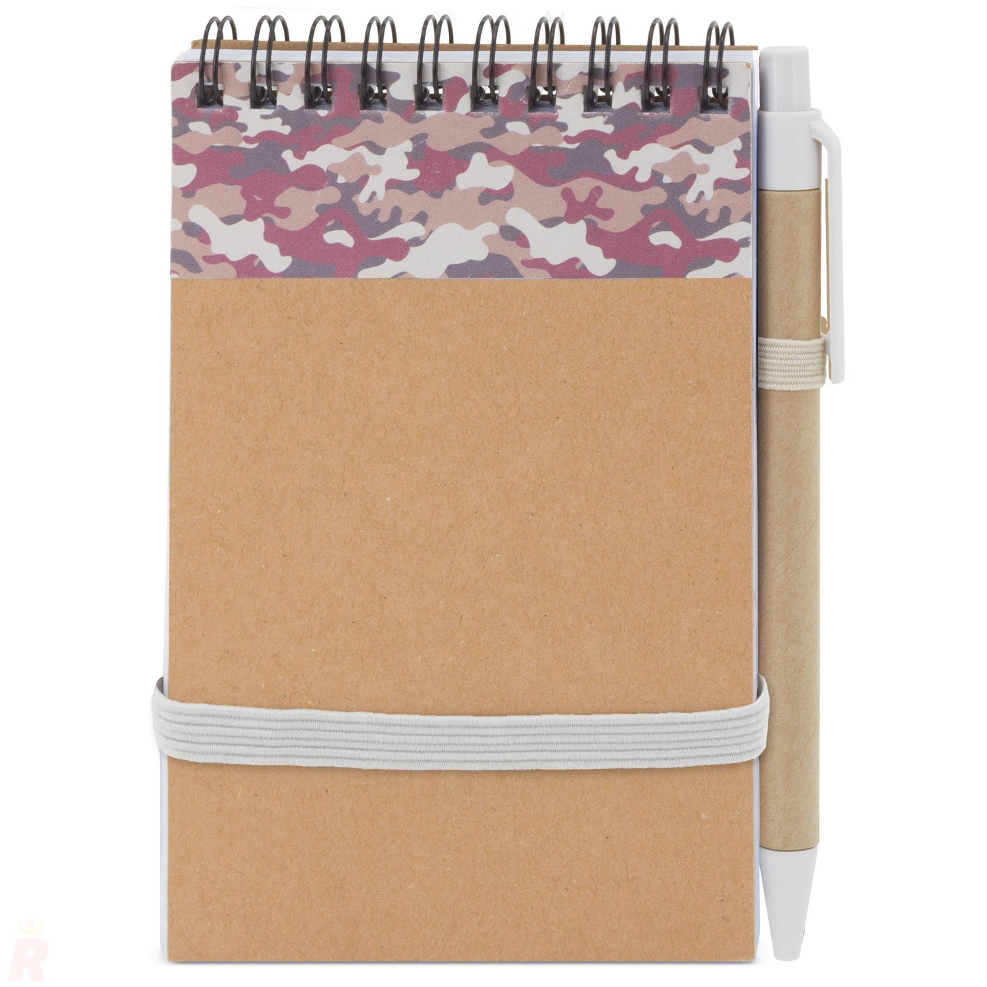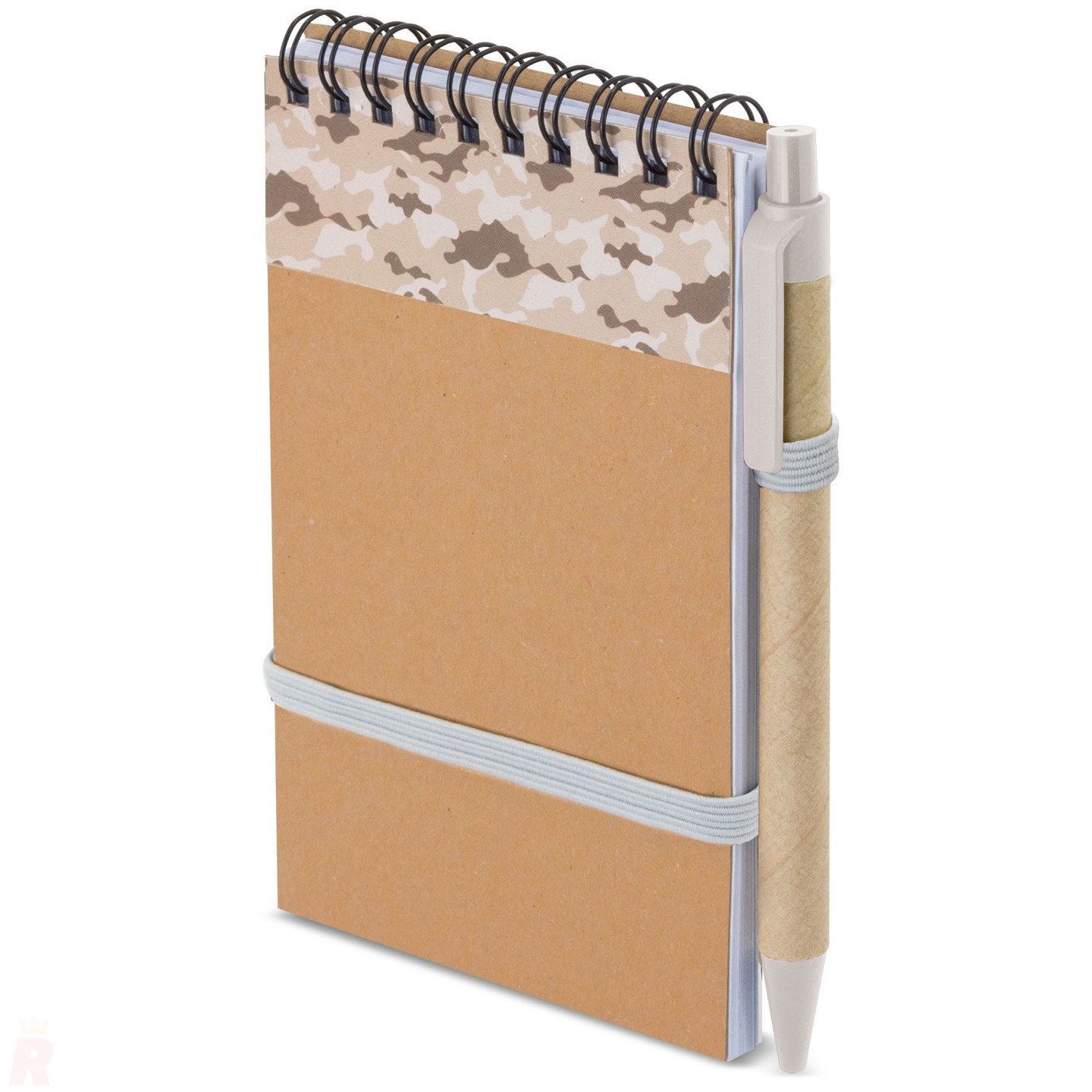 Bloc Notas A6 Camuflaje SAFARI ecológico, con diseño de camuflaje y banda elástica. Incluye bolígrafo a juego, ideal para personalizar y regalar en eventos corporativos