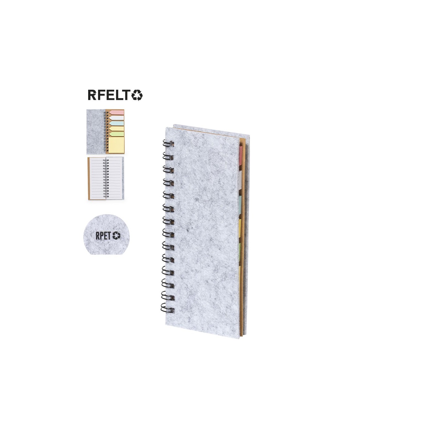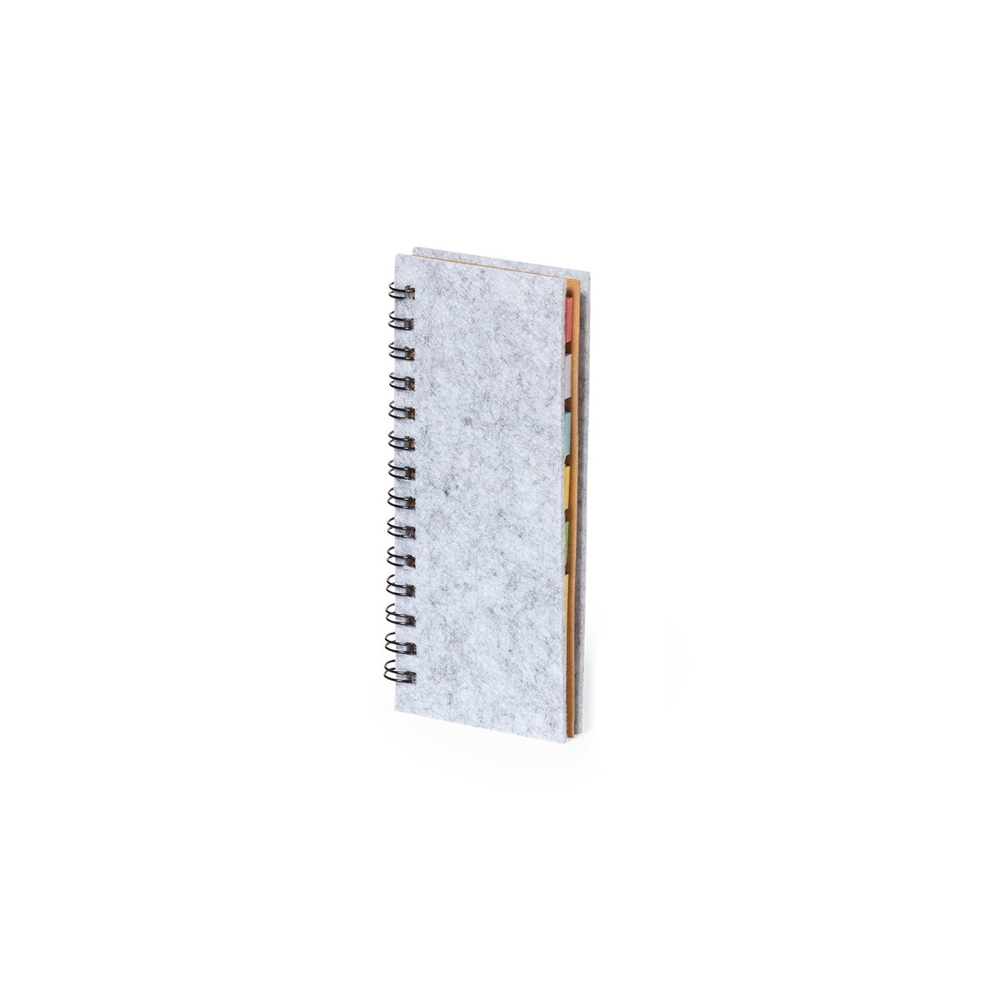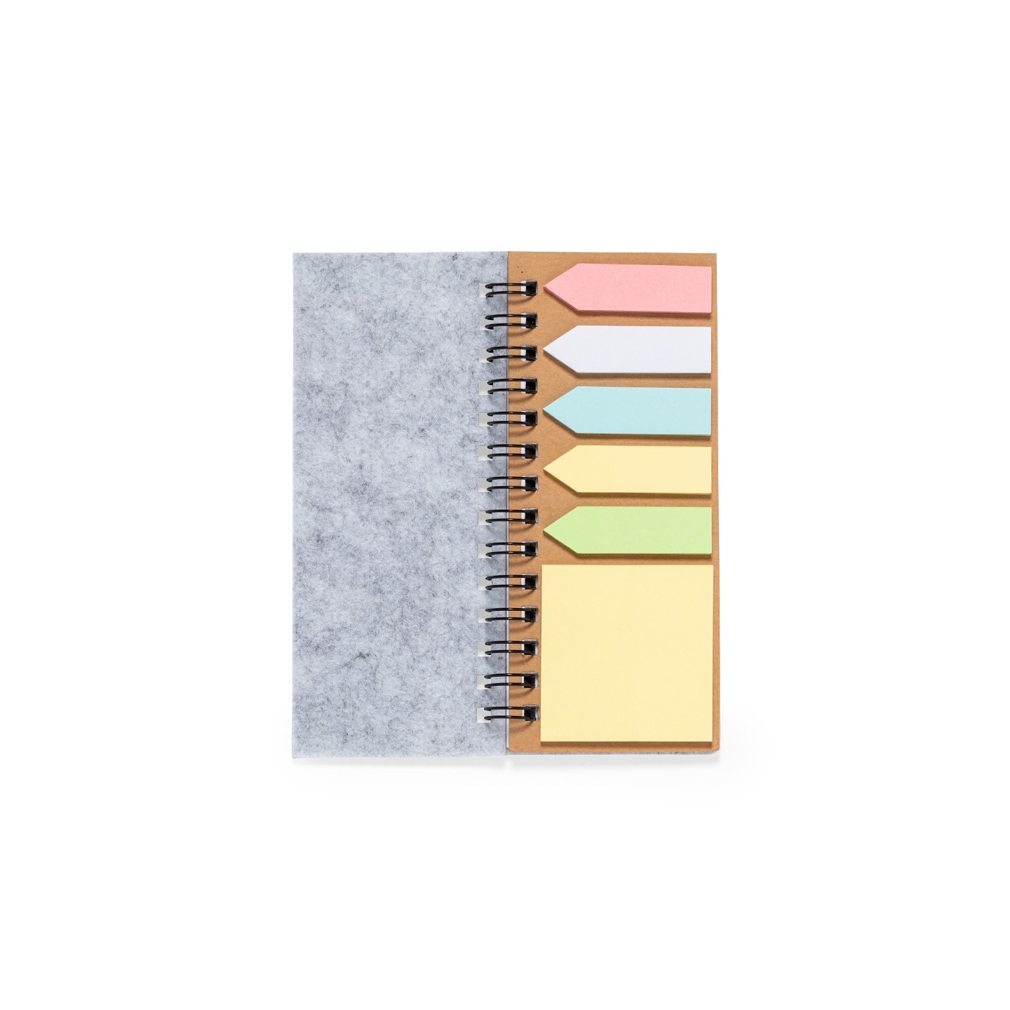 El Bloc de Notas Aurat es de fieltro RPET, 30 hojas, 25 notas adhesivas medianas y 125 mininotas. Versátil, práctico y sostenible para tus notas diarias