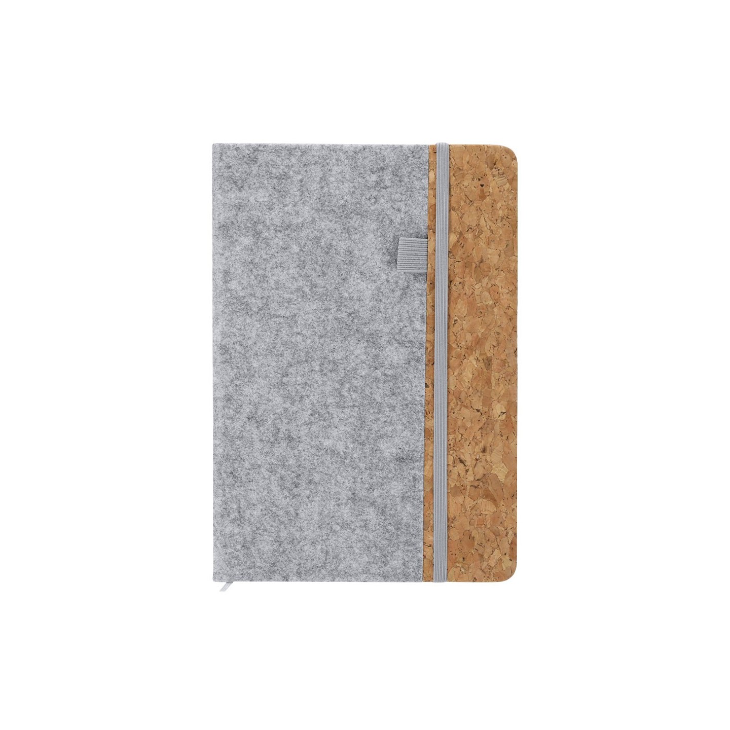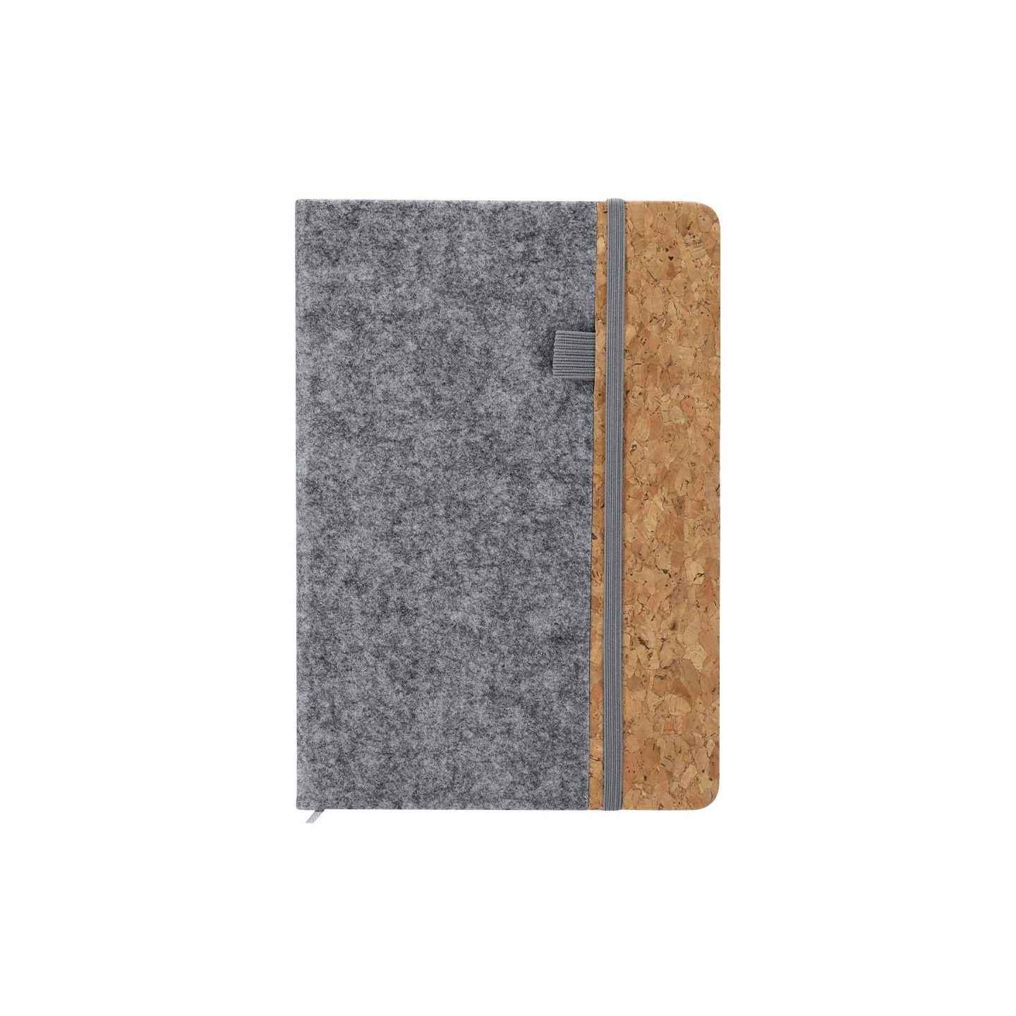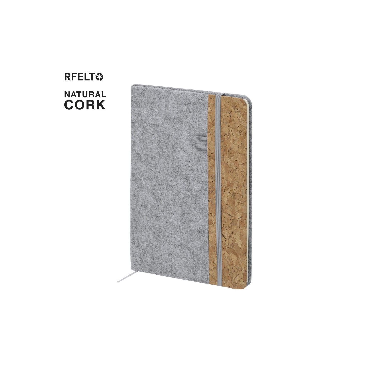 Bloc Notas DRISCOL, ecológico con tapas de fieltro RPET y corcho. Incluye 80 hojas, elástico y marcapáginas. Personalizable con tu logotipo.