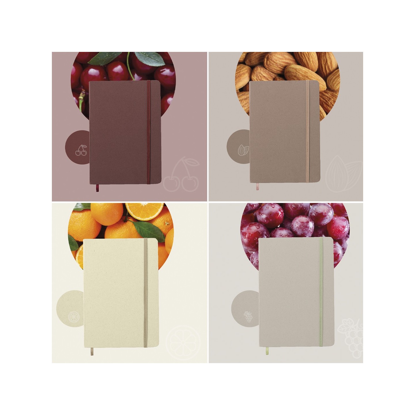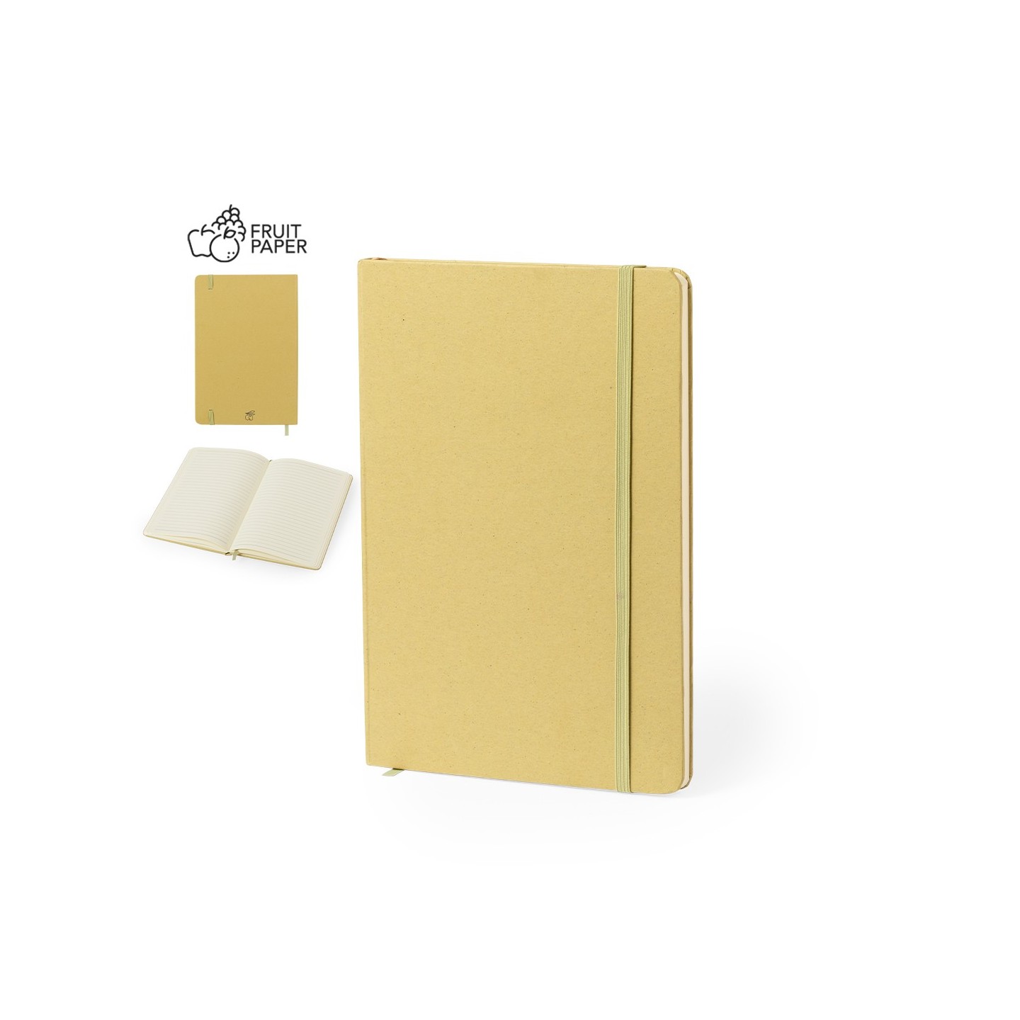 Bloc de notas A5 eco-friendly con tapas duras de frutas, 80 hojas rayadas y banda elástica. Ideal para tomar notas con conciencia ambiental.
