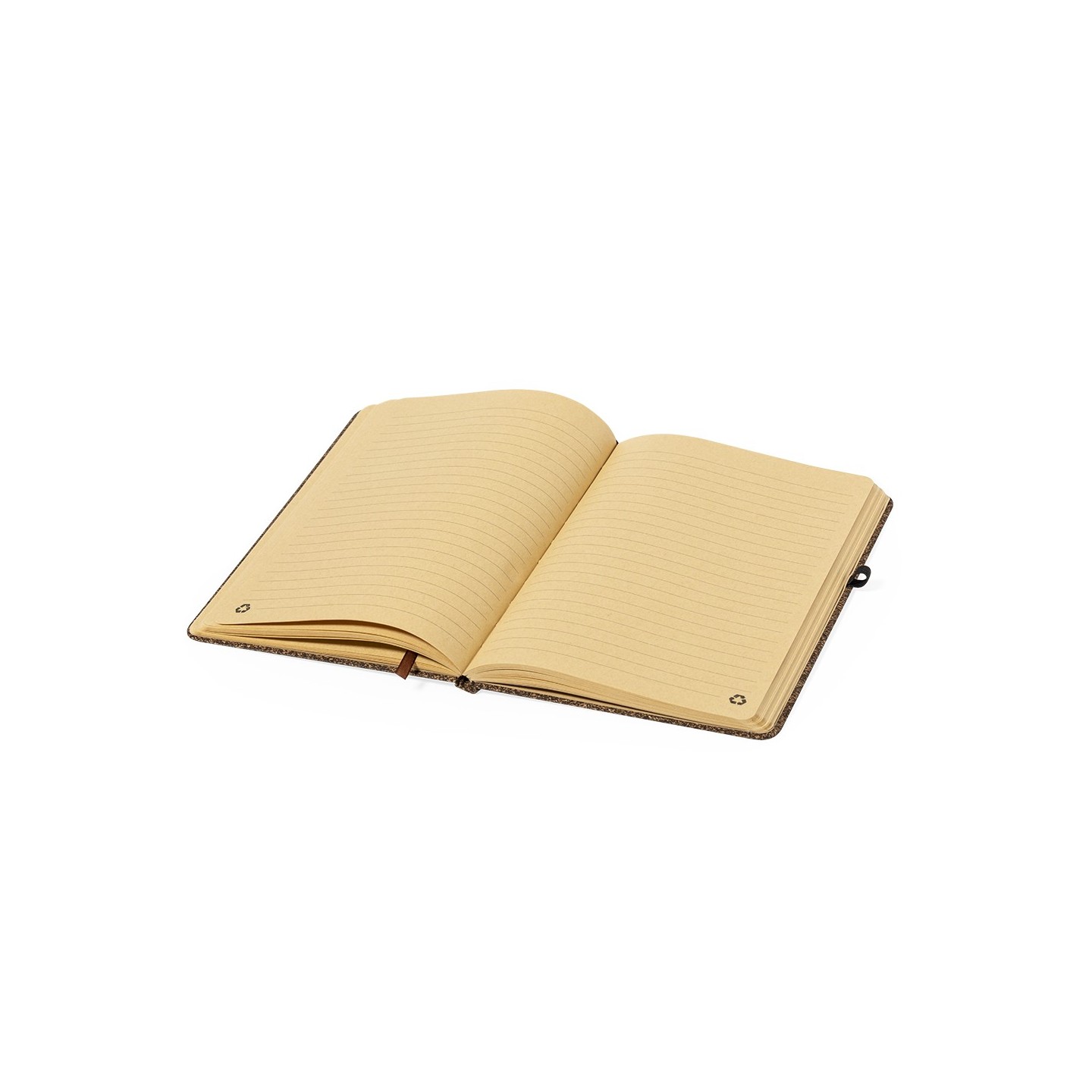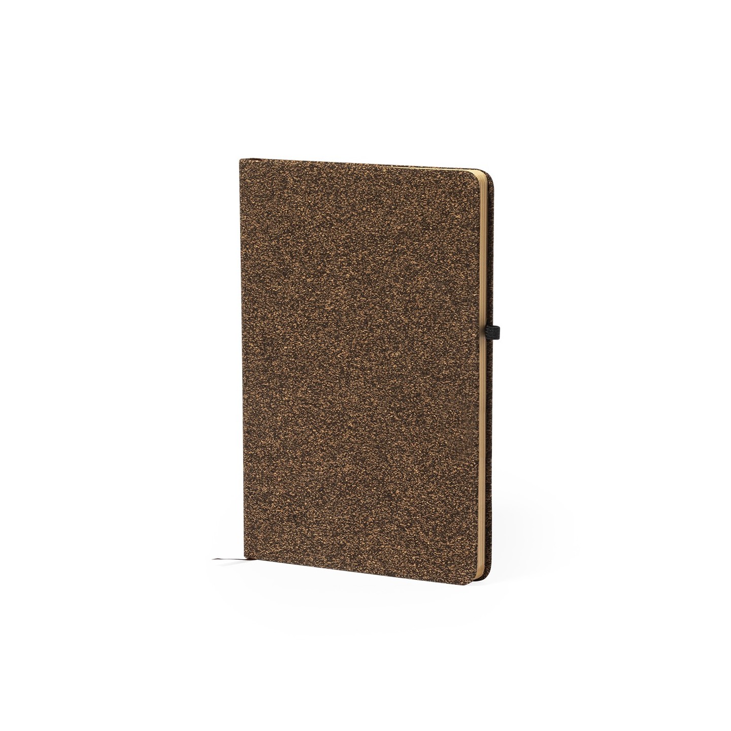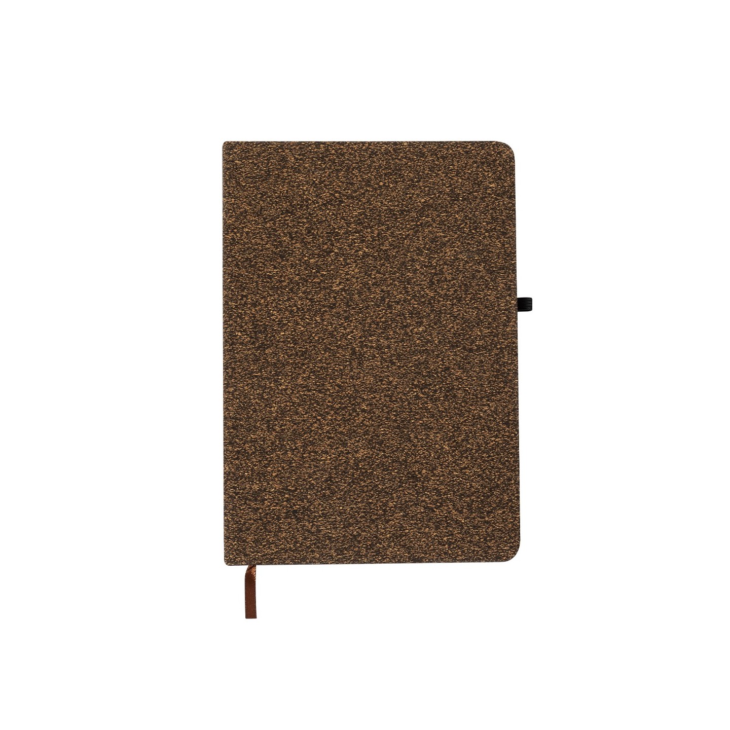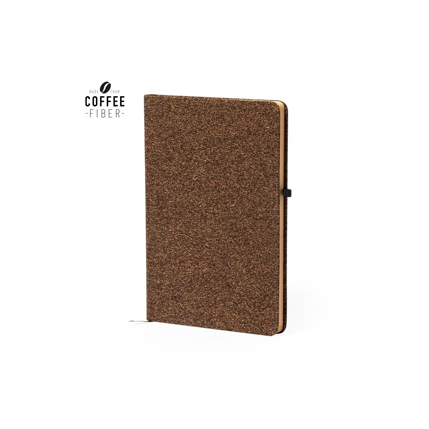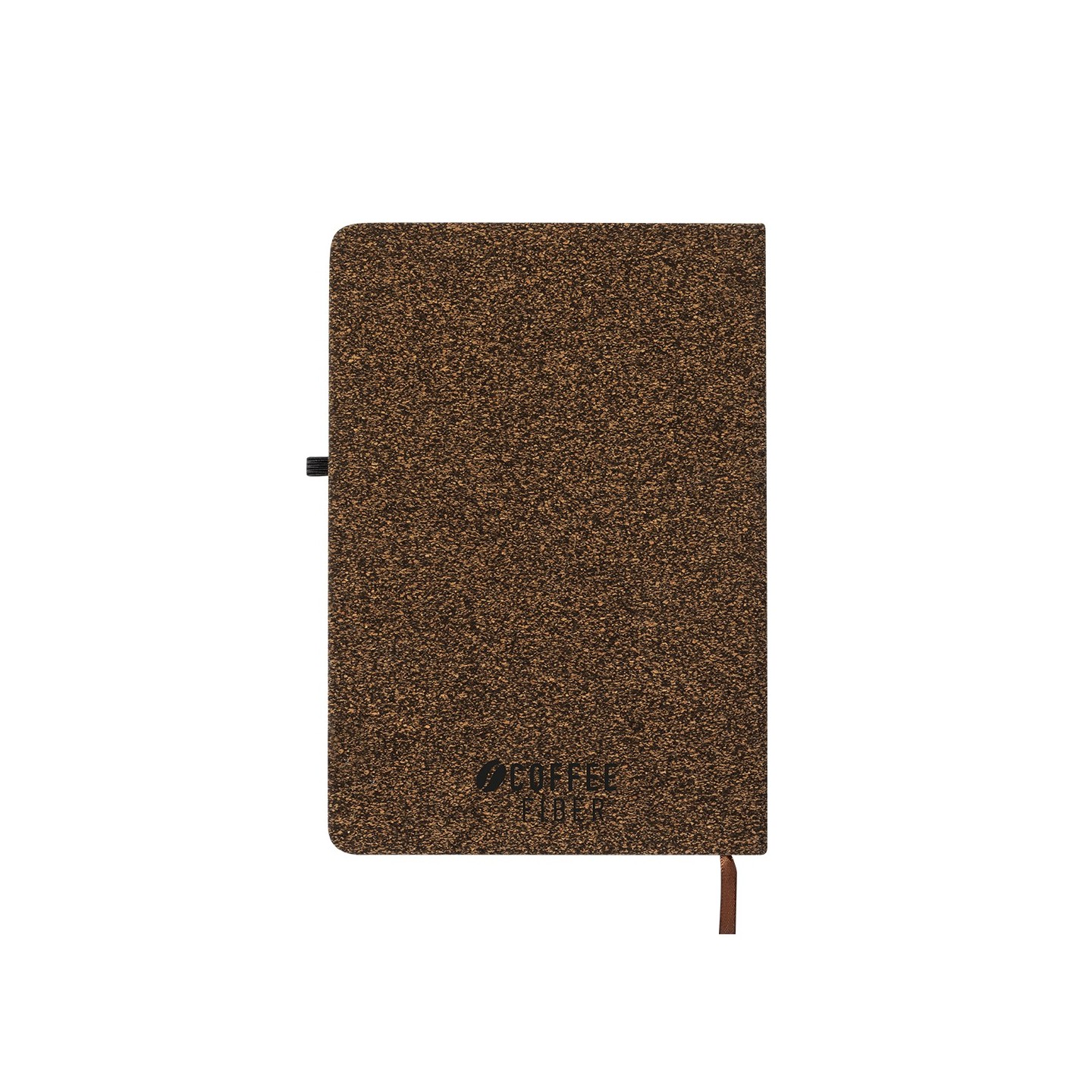 Bloc de notas en fibra de café y corcho, con 80 hojas kraft recicladas, marcapáginas y soporte para bolígrafo. Personalizable y ecológico, ideal para regalos.