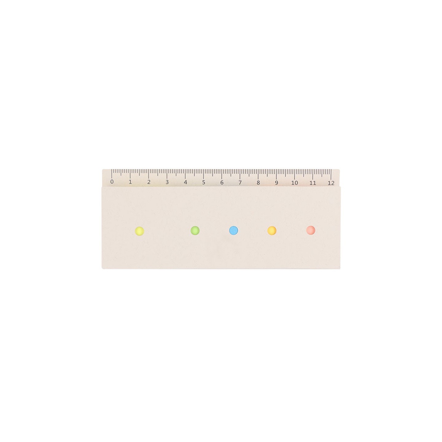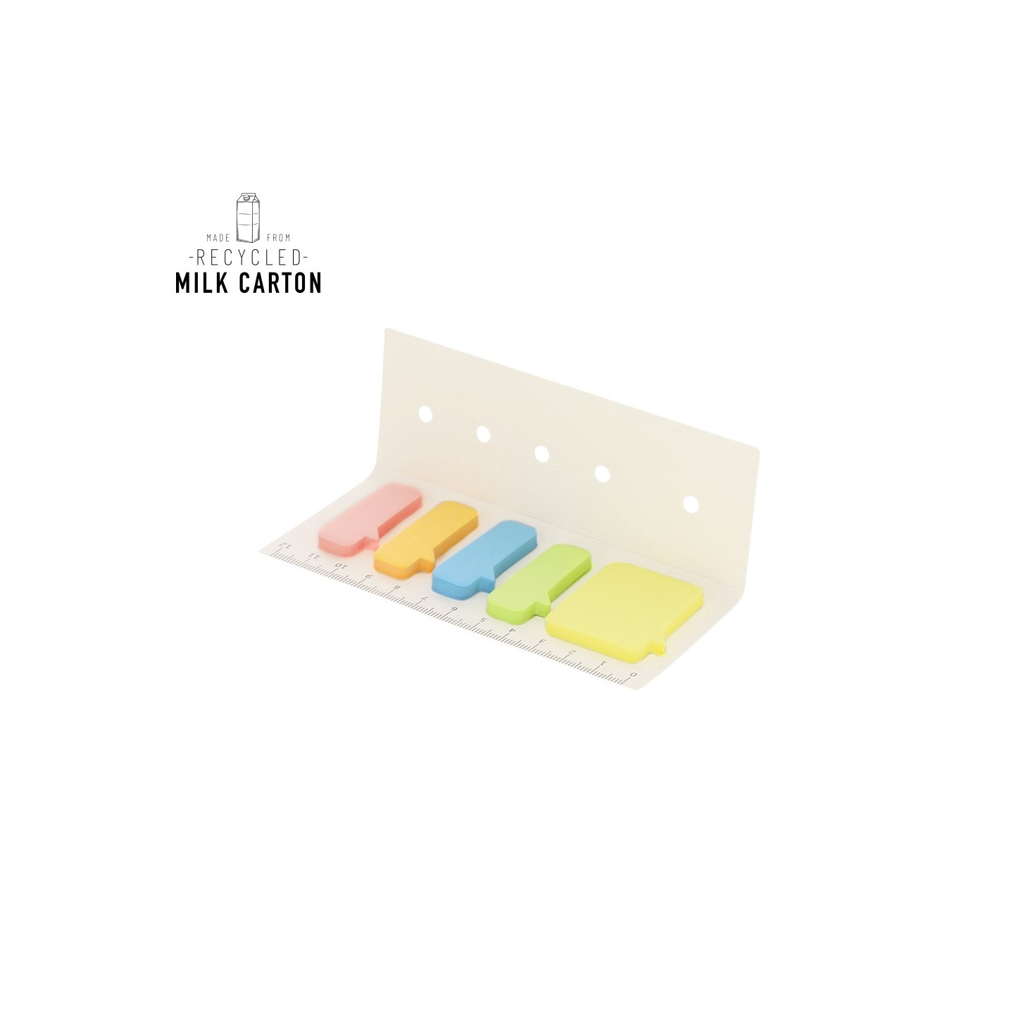 Bloc Notas KALINEX, hecho de cartón de leche reciclado. Incluye notas adhesivas y regla integrada. Personalizable con logotipo, ideal para regalos sostenibles.