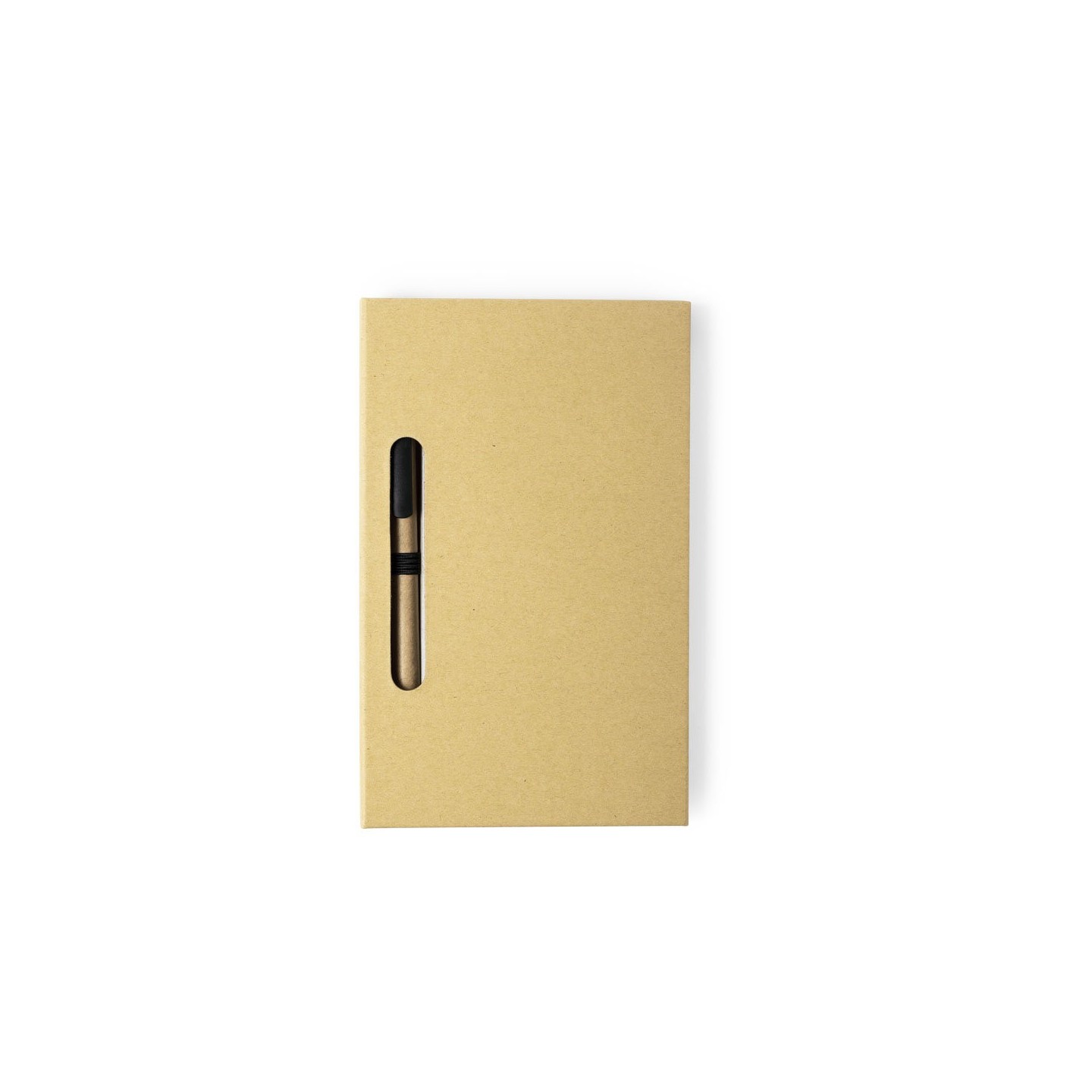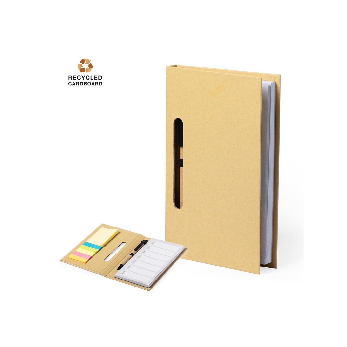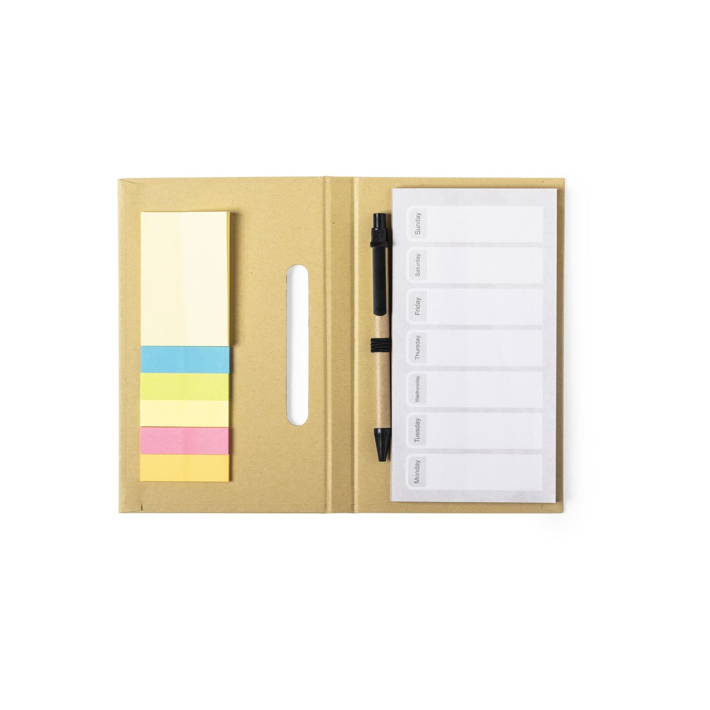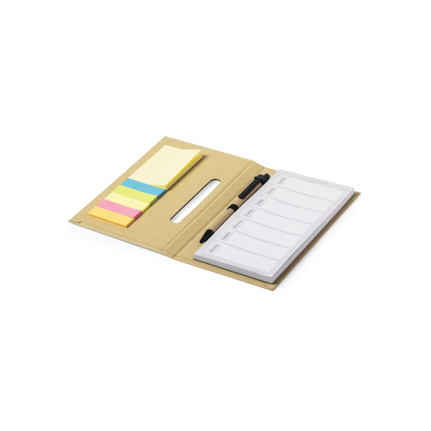 El Set de Bloc Notas Kendil es un bloc y bolígrafo en línea nature, con tapas rígidas en cartón reciclado, planificador semanal y notas adhesivas. Perfecto para regalos corporativos.