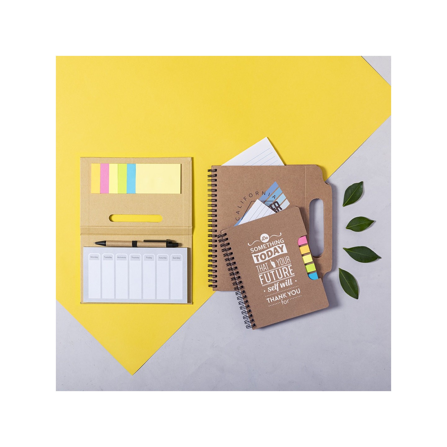 El Set de Bloc Notas Kendil es ideal para regalos corporativos. Con tapas rígidas en cartón reciclado, planificador semanal y notas adhesivas, es práctico y eco-friendly.