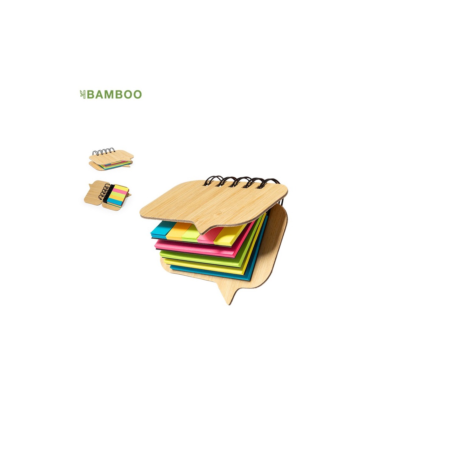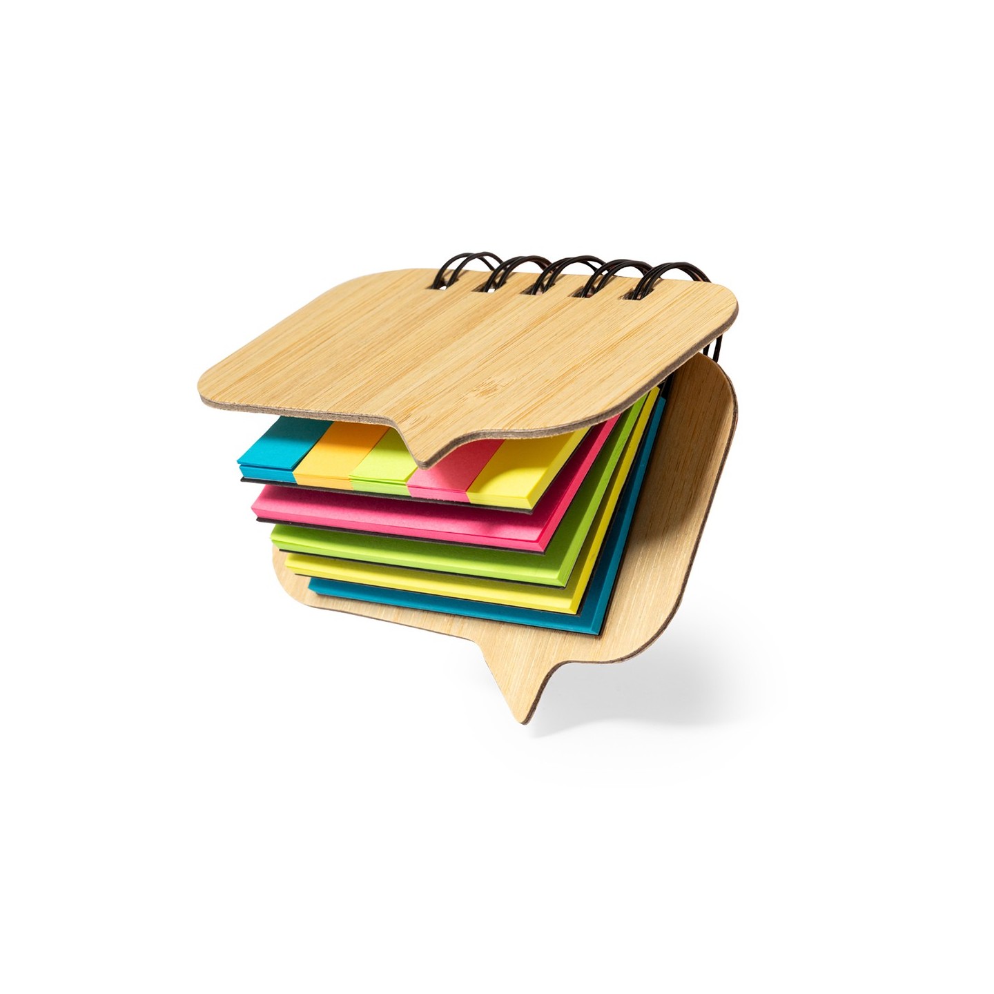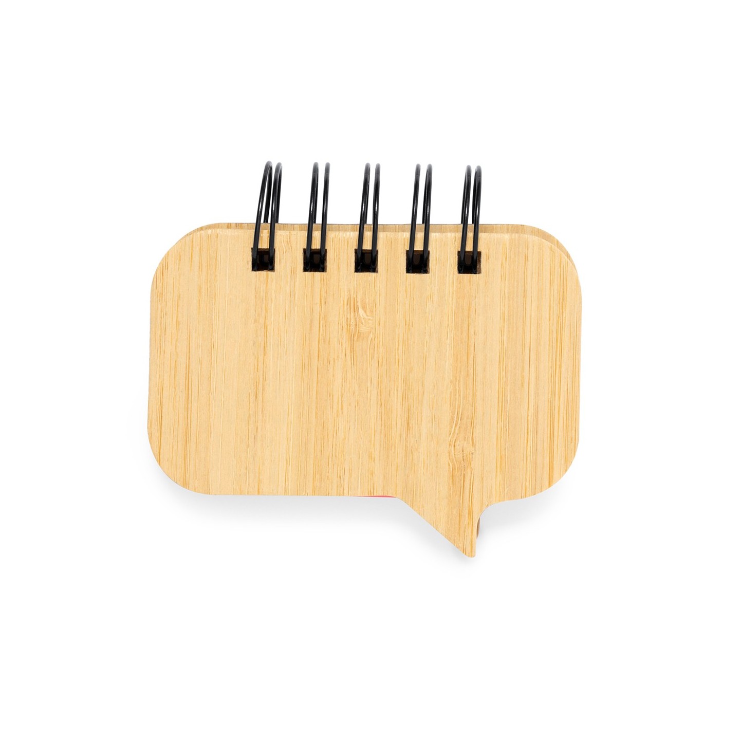 Bloc Notas Mabur con tapas de bambú en forma de globo speech, incluye notas adhesivas. Personalizable y eco-friendly